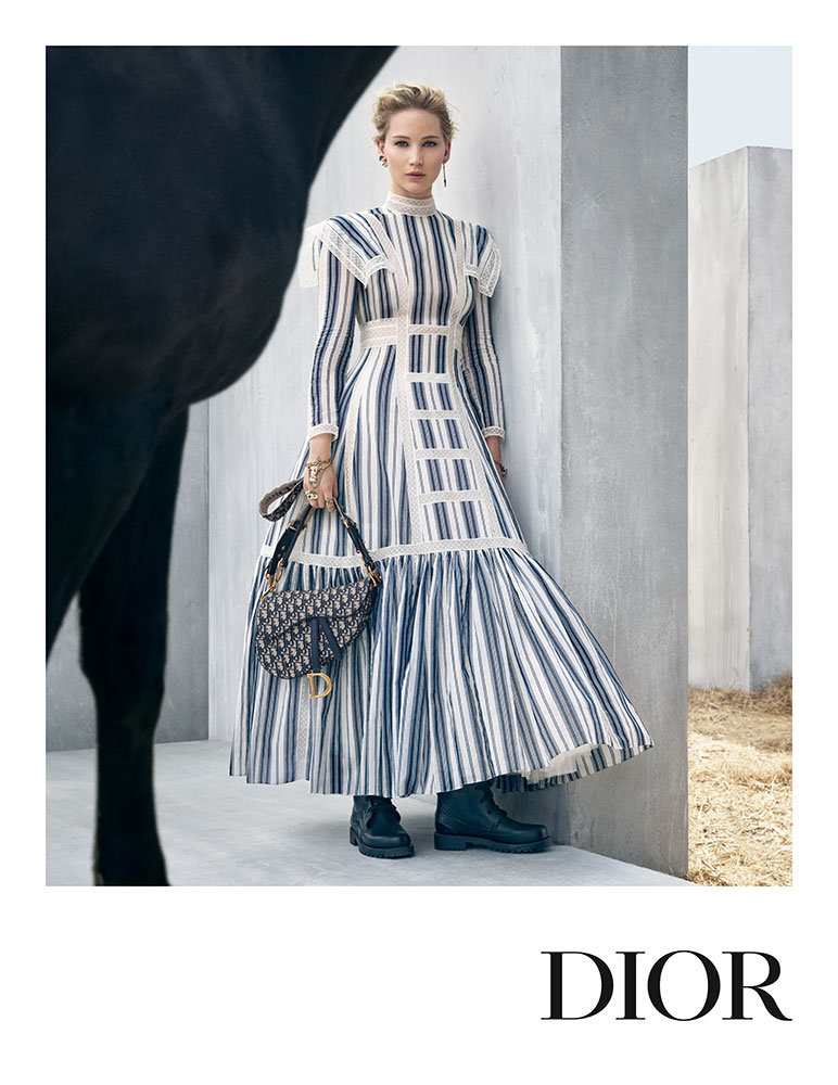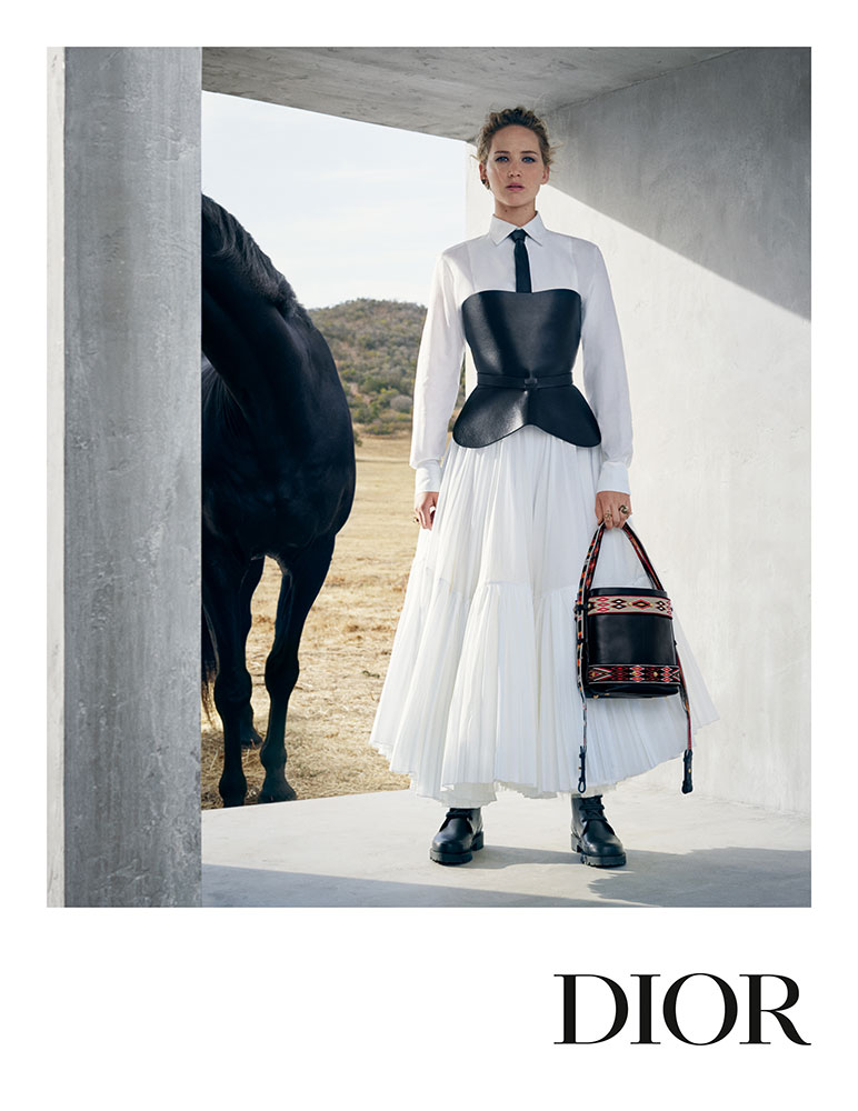 今回のキャンペーンで Viviane Sassen がレンズを向けたのは、荒涼とした自然が広がる風景の中で佇む Jennifer Lawrence。コンクリートの壁がビジュアルに建築的な要素を与え、Viviane Sassen らしいアート性の高いモダンなイメージに仕上げられている。エスカラムサと呼ばれるメキシコの伝統的な女性騎手のコスチュームからインスピレーションを得たという2019 クルーズ コレクションを纏った Jennifer Lawrence は、毛並みの美しい馬と共演。勇敢な女性騎手を感じさせる精悍さを湛えた表情で、解放されたフェミニニティを体現している。是非、ビハインド ザ シーンとあわせてチェックして。