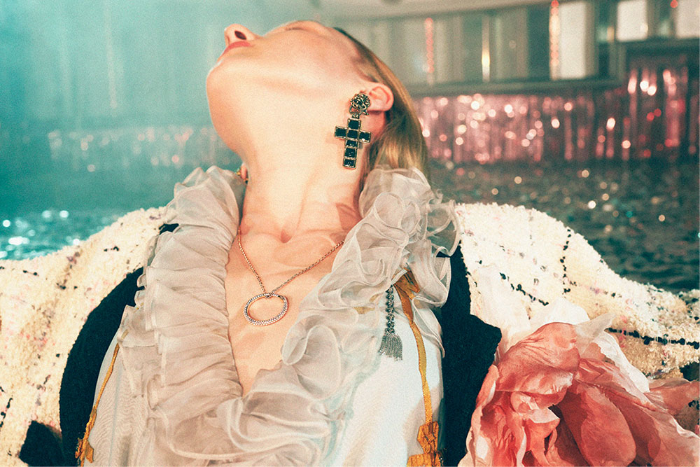 今回のキャンペーンで注目したいのは、Petra Collins (ペトラ・コリンズ) が新たに撮り下ろしたスペシャルムービー。舞台は、1926年にオープンしたイタリア、トリノの映画館兼ダンスホール「Le Roi (ル・ロア)」。1960年代にイタリアの建築家、デザイナー、フォトグラファーとして活躍した Carlo Mollino (カルロ・モリーノ) が手がけたというインテリアが Gucci の最新コレクションと見事にマッチしている。映像では、きらびやかなニューイヤーズイヴ パーティーが映し出され、多幸感に溢れるノスタルジックなムードがホリデーシーズンを盛り上げる。