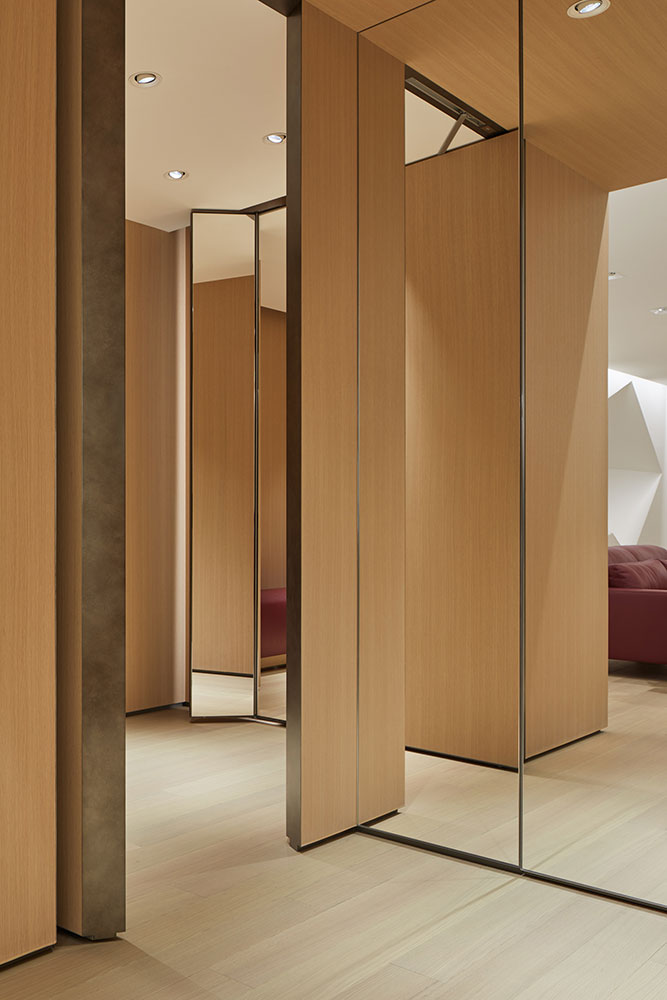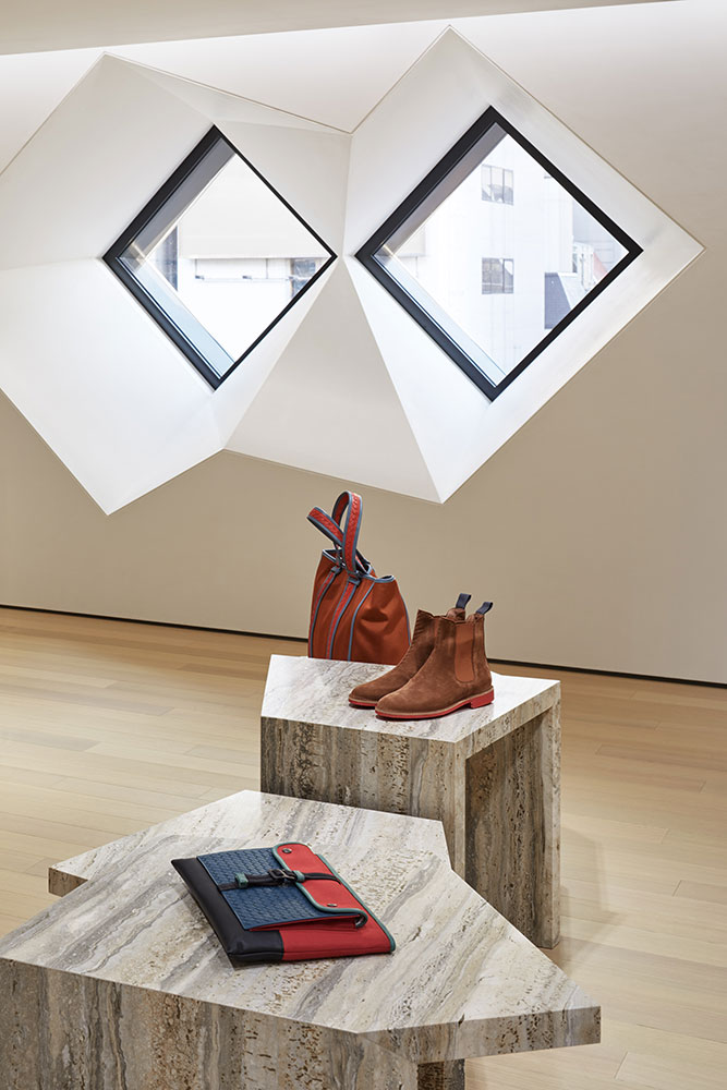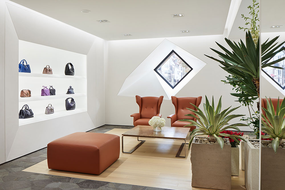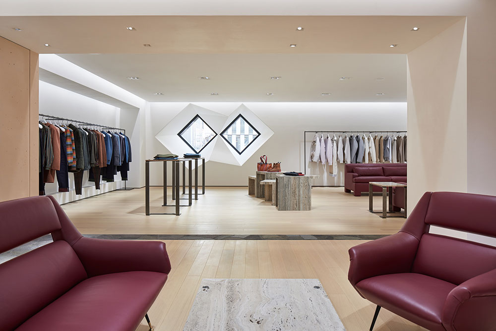 「キョウトホワイト」という漆喰や希少な日本の木、タモからインスピレーションを得たオーク材、日本産の安山岩の一種である鉄平石を用いるなど、日本固有の美も追求。そこにペルシャンレッドのトラバーチンをはじめとするイタリア産の様々な種類の大理石を用いることで、日本とイタリアの伝統が融合した Bottega Veneta らしい空間に。他にも Bottega Veneta のホームコレクションとともに Gio Ponti (ジオ・ポンティ) や Gianfranco Frattini (ジャンフランコ・フラッティーニ) がデザインしたチェアも展示されており、リラックスしながらも洗練された空間でショッピングを楽しむことができる。