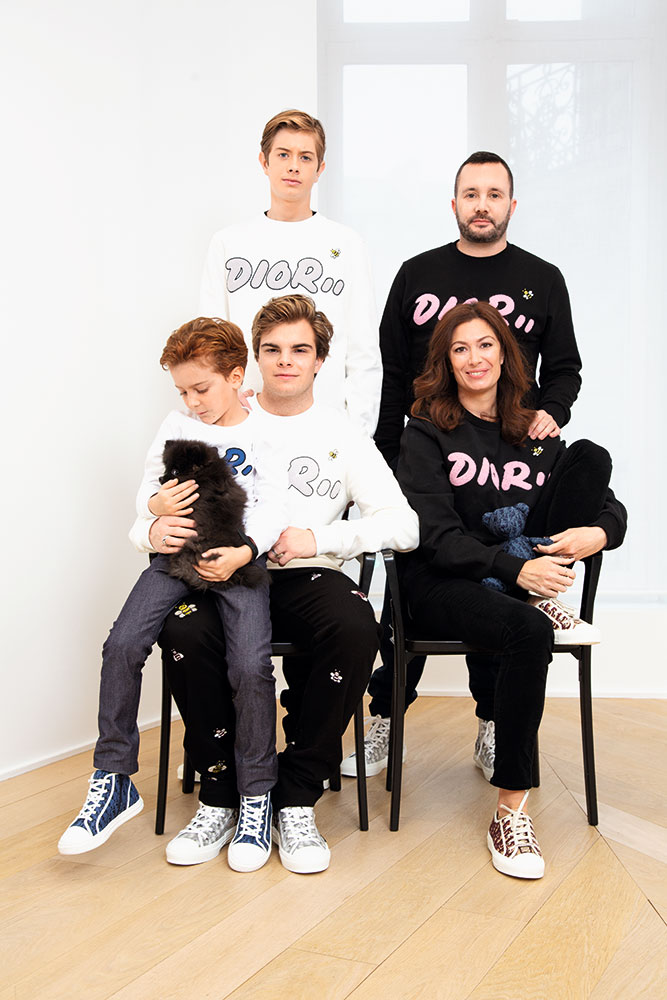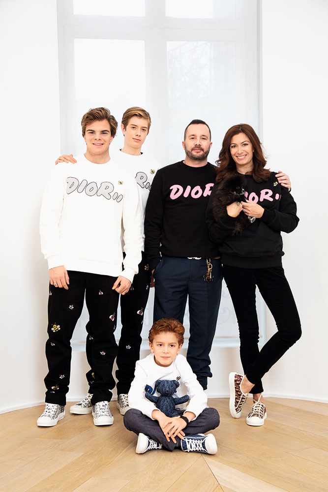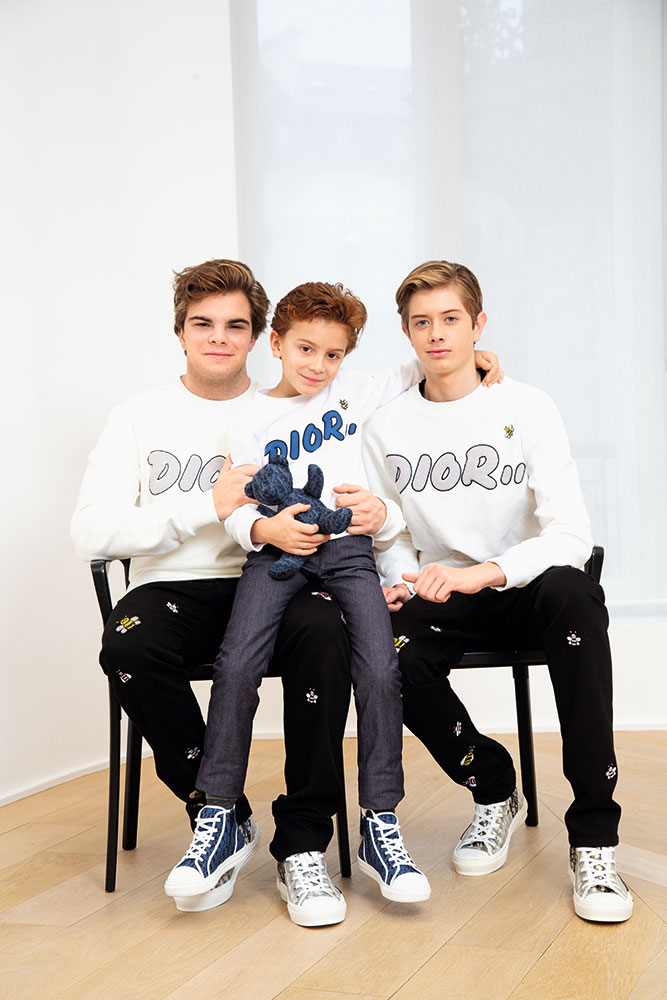 Kim Jones が KAWS とタッグを組んで生みだした Dior (ディオール) のアイコンである「BEE」モチーフとロゴの新デザインが配されたサマー 2019 メンズ カプセル コレクションが11月に日本にて世界先行発売されたことはまだ記憶に新しい。BABY DIORのクリエイティブ ディレクター、Cordelia de Castellane (コーデリア・ドゥ・カステラーヌ) は今回、この KAWS による「BEE」モチーフを総刺繍で再現したり、ロゴをネイビーブルーで配したTシャツやセーター、ポロシャツなどを発表。また、クラシカルな「ディオール オブリーク」のテキスタイルもネイビーブルーで登場。同コレクションのローンチに合わせ、Kim Jones と Cordelia de Castellane、そして彼女の3人の息子たちの貴重なグループショットも公開されている。