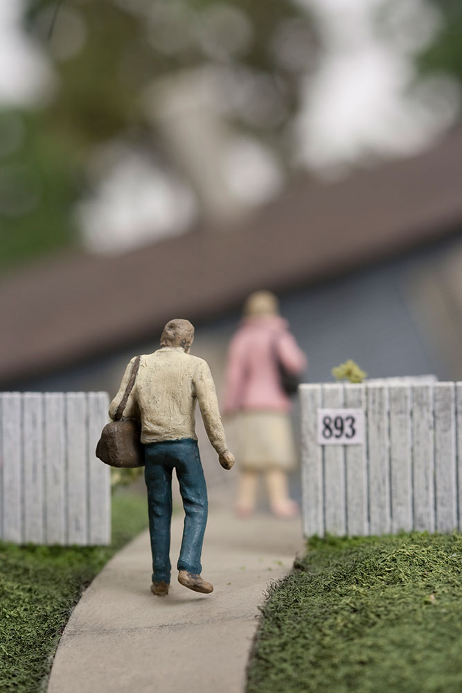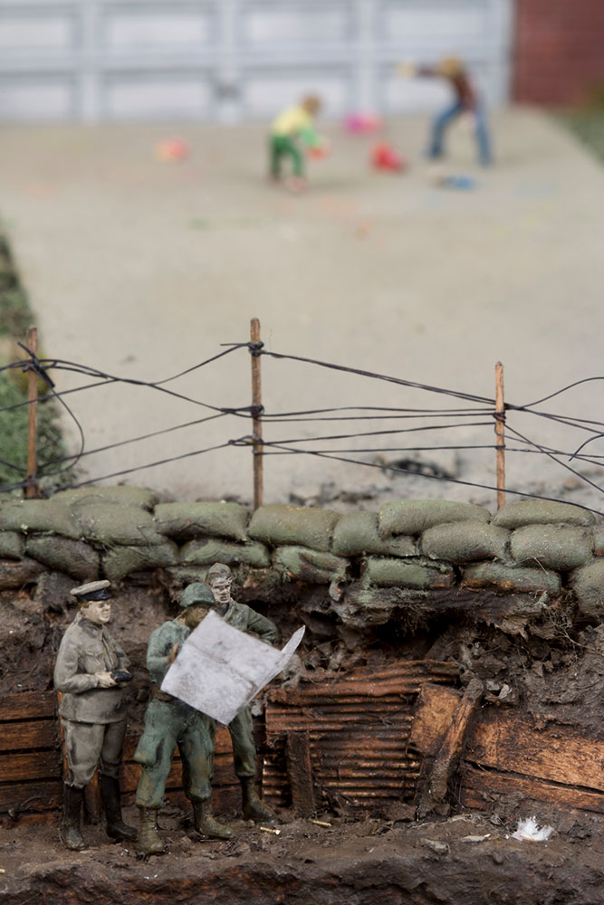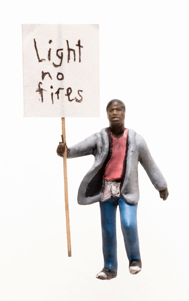 作品に含まれる心理的側面 (誰もが抱える記憶や思い) と、不穏な時代の「疑いようのない不安感」に基づいて「HOLD YOUR FIRE」と題された本展では、「孤独」「別離」「危機」をテーマに、戦争や自然災害、難民危機といった大惨事と隣り合わせにある現代の不安感を表現。高さ2メートルにもおよぶ作品をはじめ、複数のミニチュアアート、Thomas Doyle 自らが撮影したミニチュアフィギュアの写真作品にスポットライトを当てる。