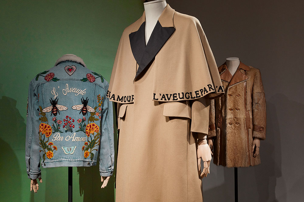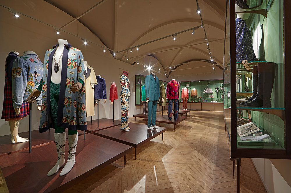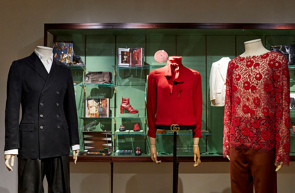 新たにスタートしたエキシビションのタイトルは、「Il Maschile-Androgynous Mind, Eclectic Body (男-両性具有の心、折衷的肉体)」。キュレーションを手がけたのは、著名ファッション評論家の Maria Luisa Frisa (マリア・ルイーザ・フリーザ)。Gucci のウェアやオブジェ、アクセサリー、写真、書籍、雑誌、ビデオを通じて、ブランドの長年にわたるメンズファッションへの解釈や定義を紐解いていく。Alessandro Michele (アレッサンドロ・ミケーレ) が2015年秋冬シーズンに発表した初のメンズコレクションに登場したシフォンボウ付きの赤いシルクシャツなどに焦点を当てることで、現代におけるジェンダーの境界は流動的であるという考えに対する賛同を明らかにするなど、Gucci の考えるマスキュリニティが本展にて提示されている。