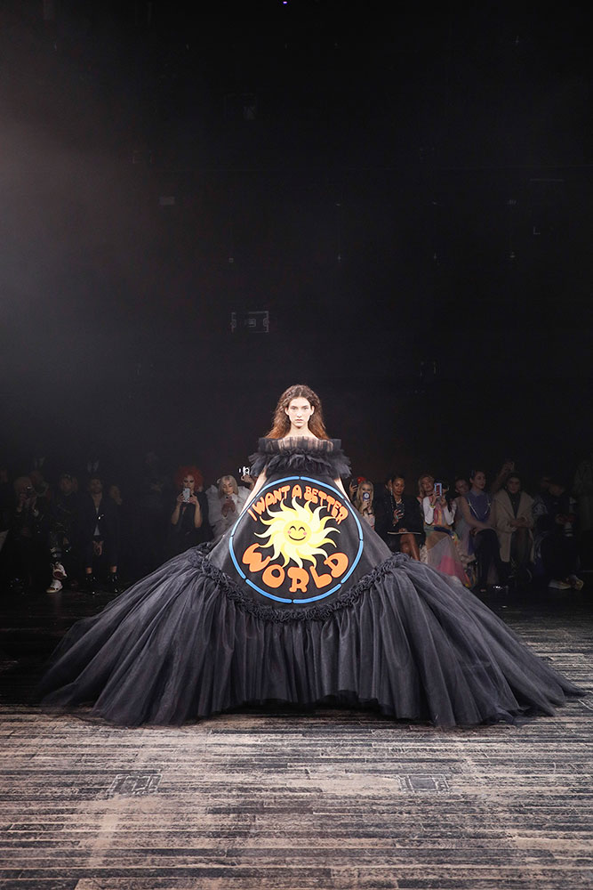 「I AM MY OWN MUSE」私こそ自分のミューズ。もっと自分らしく自由にファッションを楽しんでいいはず。フィナーレは、太陽マークに「I WANT A BETTER WORLD」の裾まわり8メートルあるロマンティックドレスだった。
