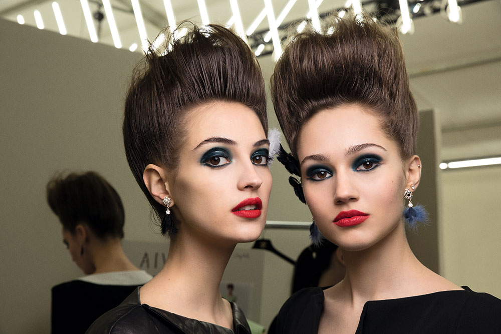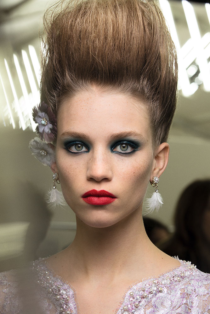 今回のメークアップで注目していただきたいのは、深いブルーのアイメークとマットな赤の唇のコントラスト。「モデルたちはこのメークアップで、まるで“デヴィッド ボウイ”のような気分になったと思います。」と CHANEL のグローバル クリエイティブ メークアップ&カラー デザイナーである Lucia Pica (ルチア・ピカ) がインタビューで答えているように、モデルたちのまぶたは大胆にブルーで彩られ、グラフィカルなラインが目の下に描かれている。
