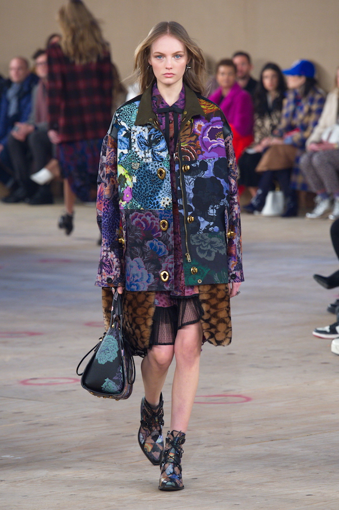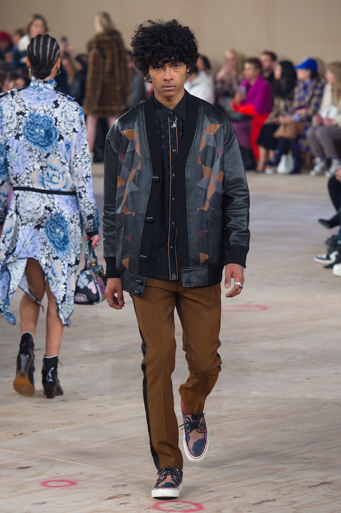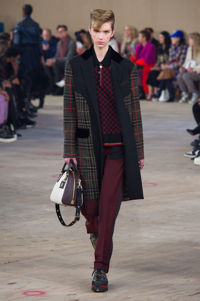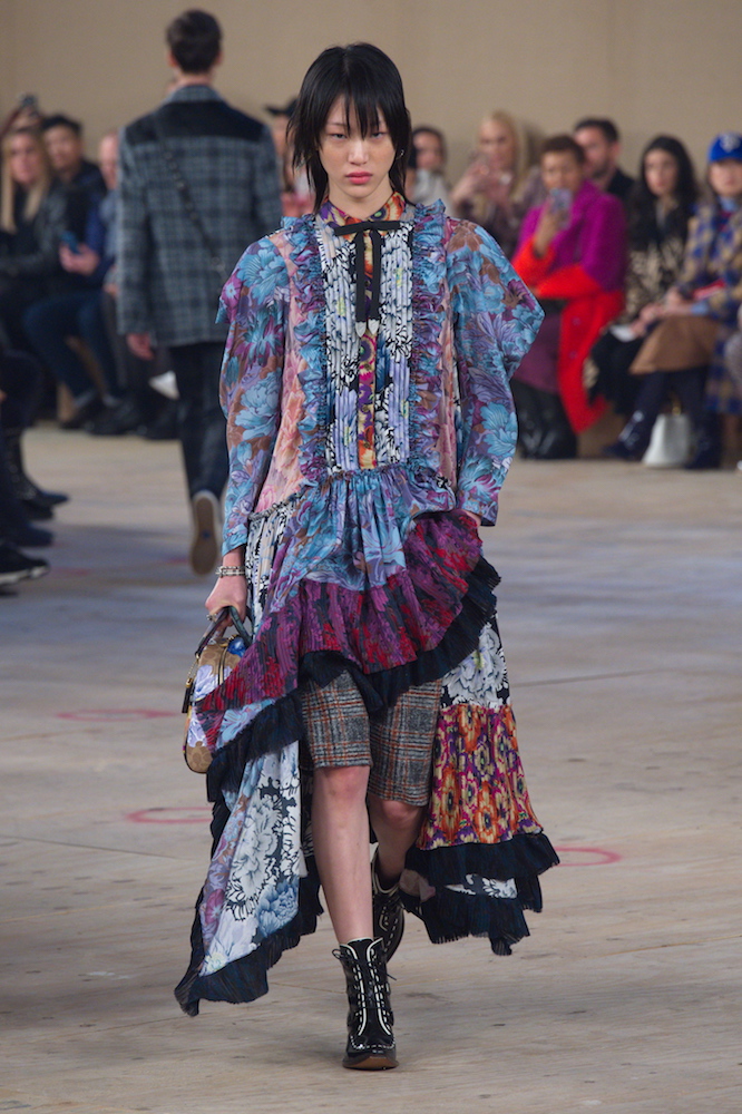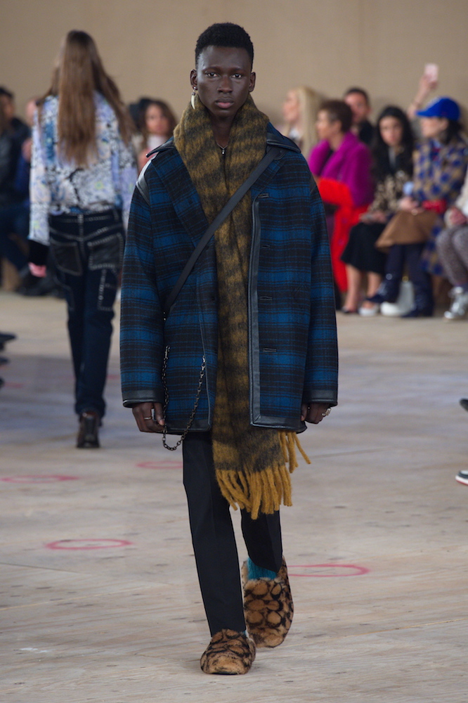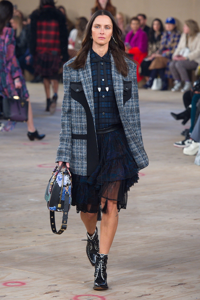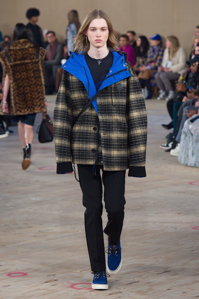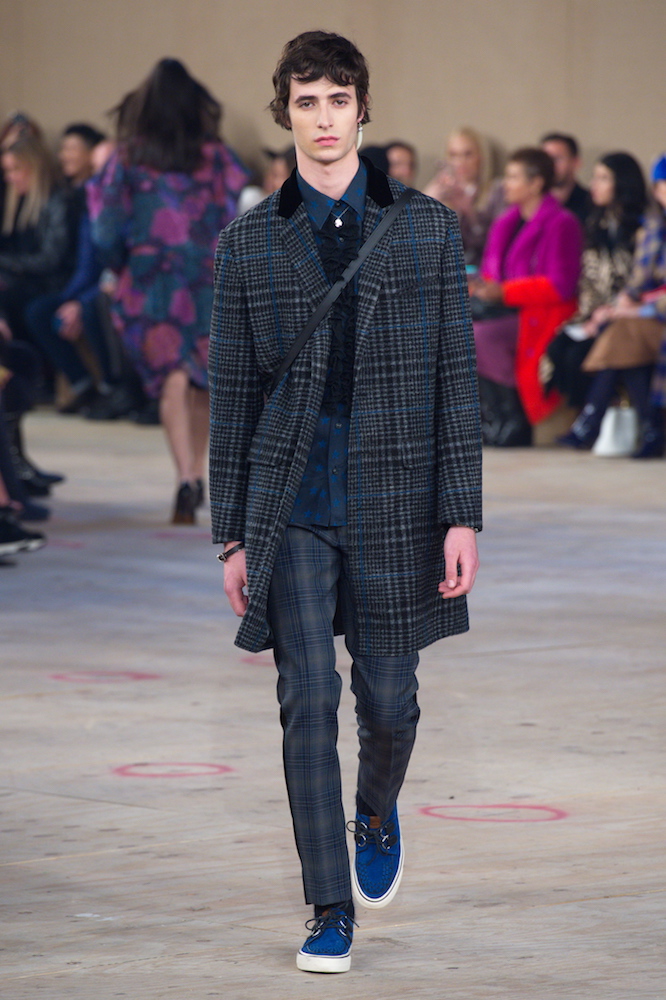 会場となったのは、ニューヨークのアメリカ証券取引所。カラフルなモチーフがテキスタイルのように反復する作風で知られるアメリカ出身のアーティスト Kaffe Fassett (カフェ・ファセット) の作品にインスパイアされたという今回のコレクションもまた引き続き、ダークなエッセンスが散りばめられたフォークロアスタイルが多数お目見え。サイケデリックなムードは健在ながらも、ブルーやパープルなど寒色が基調となることでよりクールな印象に仕上げられている。またチェックパターンのレイヤードが組み合わさることで、Stuart Vevers 節の炸裂したコレクションとなった。