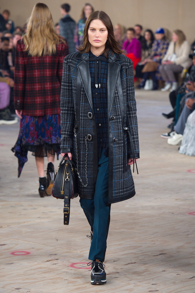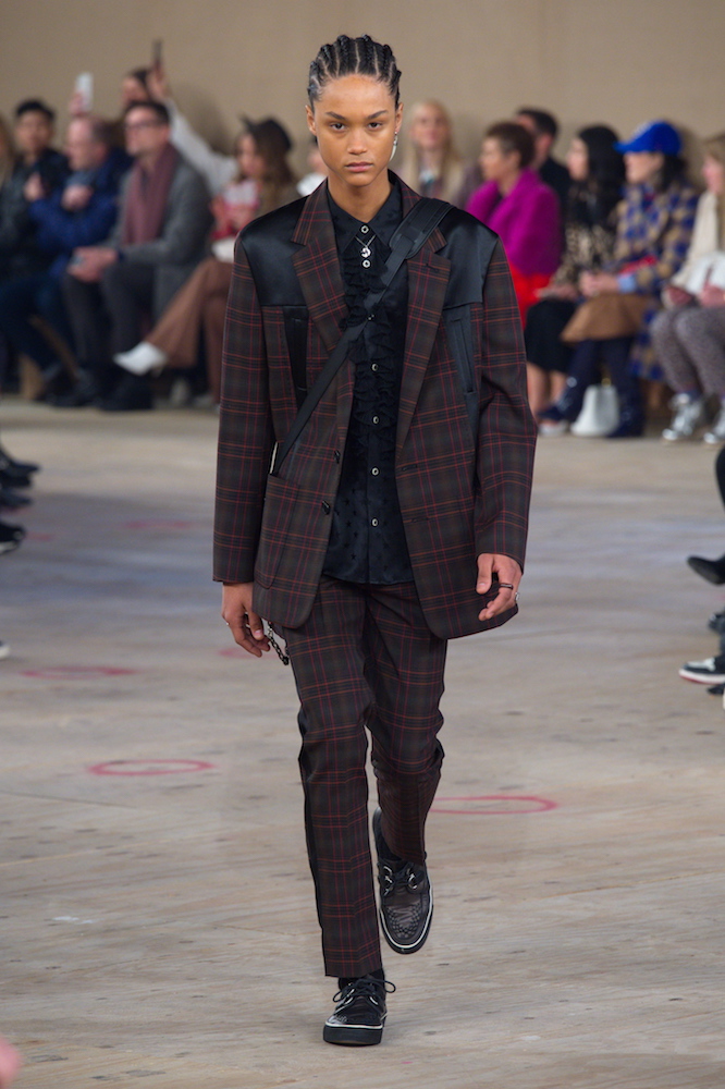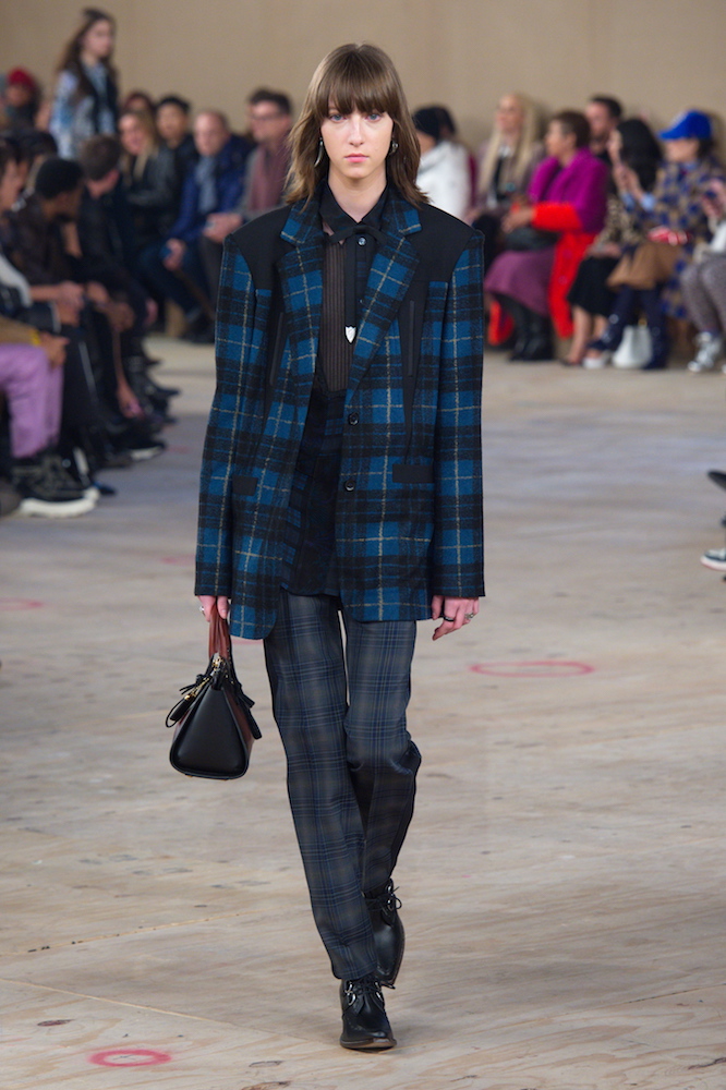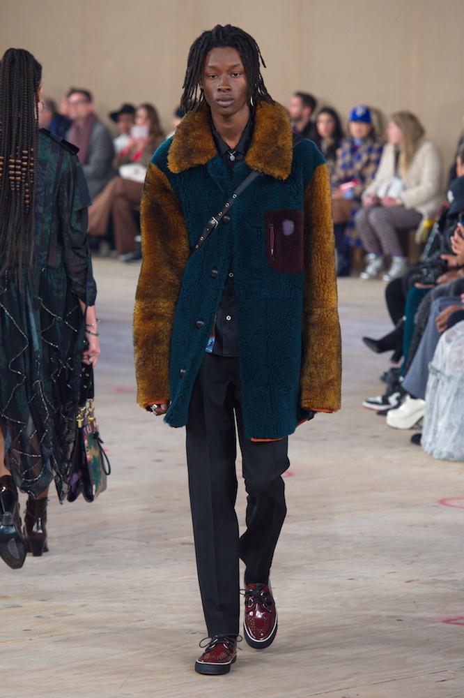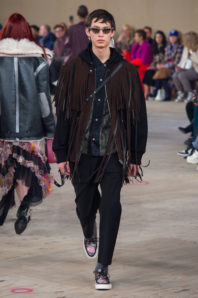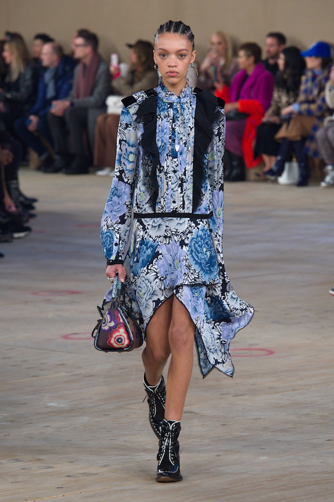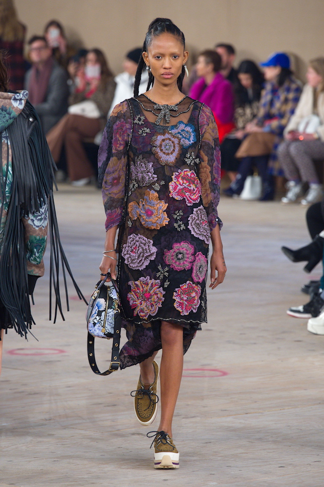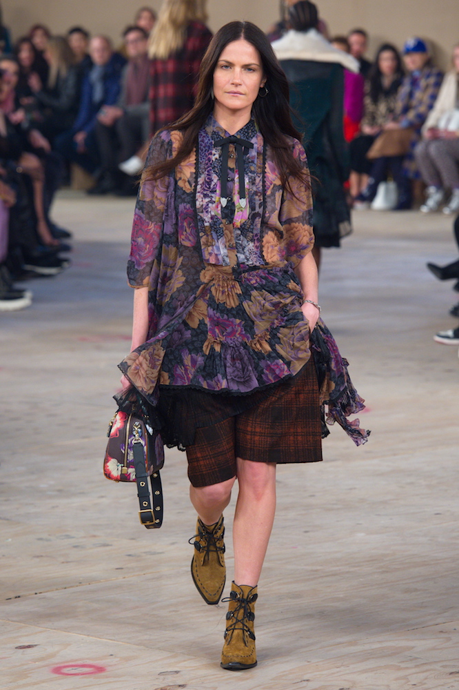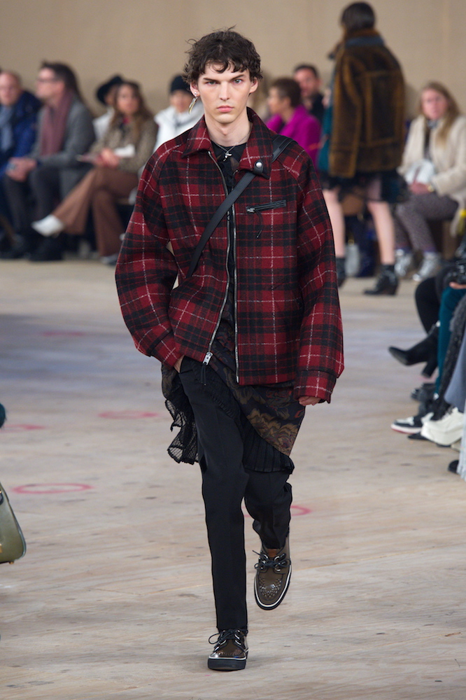 会場となったのは、ニューヨークのアメリカ証券取引所。カラフルなモチーフがテキスタイルのように反復する作風で知られるアメリカ出身のアーティスト Kaffe Fassett (カフェ・ファセット) の作品にインスパイアされたという今回のコレクションもまた引き続き、ダークなエッセンスが散りばめられたフォークロアスタイルが多数お目見え。サイケデリックなムードは健在ながらも、ブルーやパープルなど寒色が基調となることでよりクールな印象に仕上げられている。またチェックパターンのレイヤードが組み合わさることで、Stuart Vevers 節の炸裂したコレクションとなった。