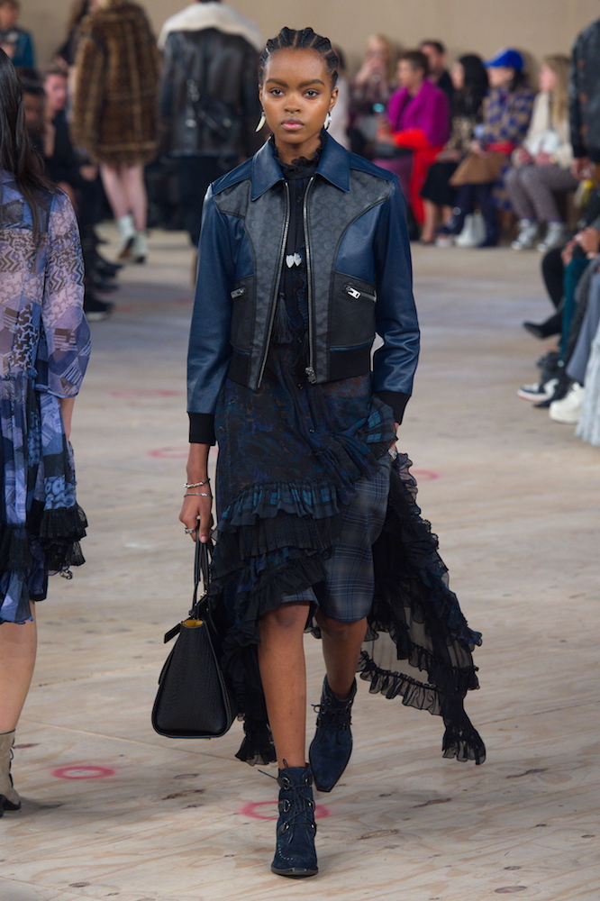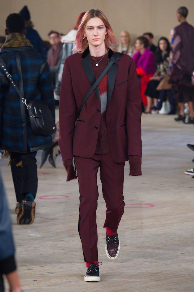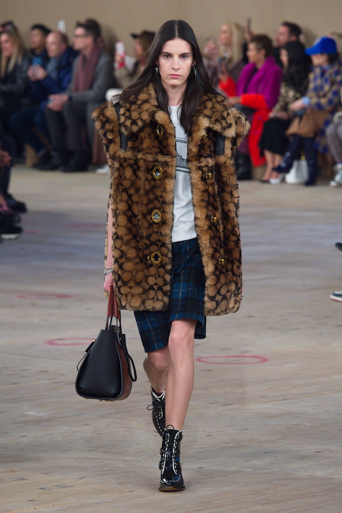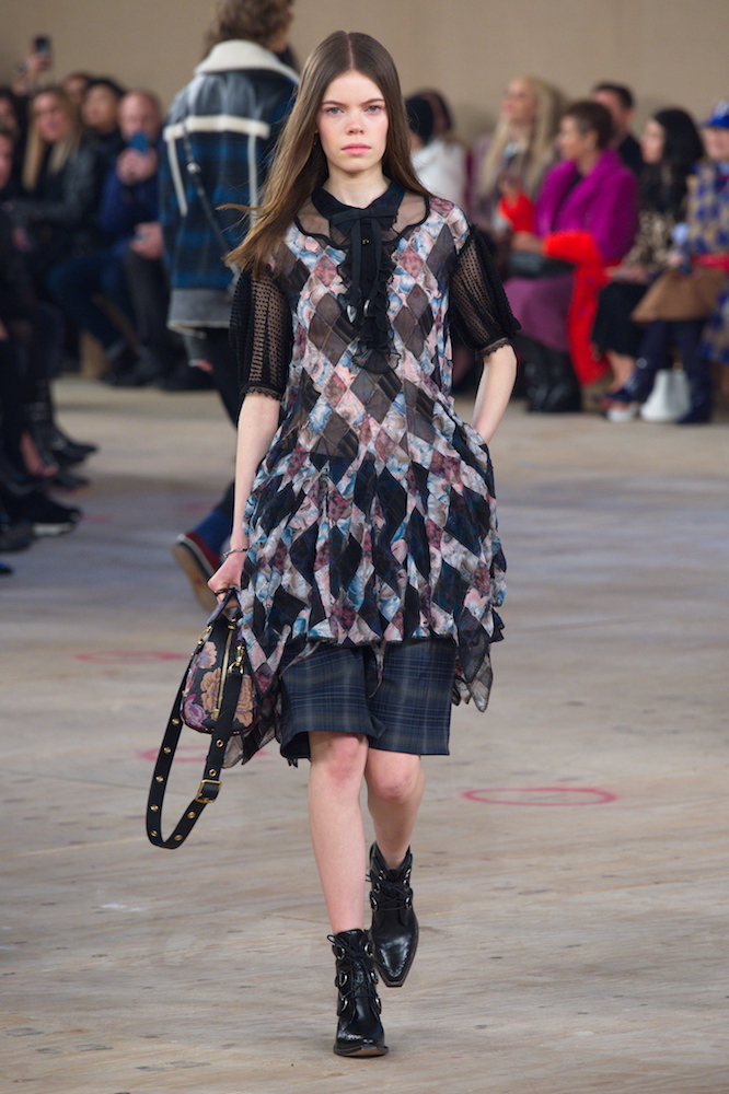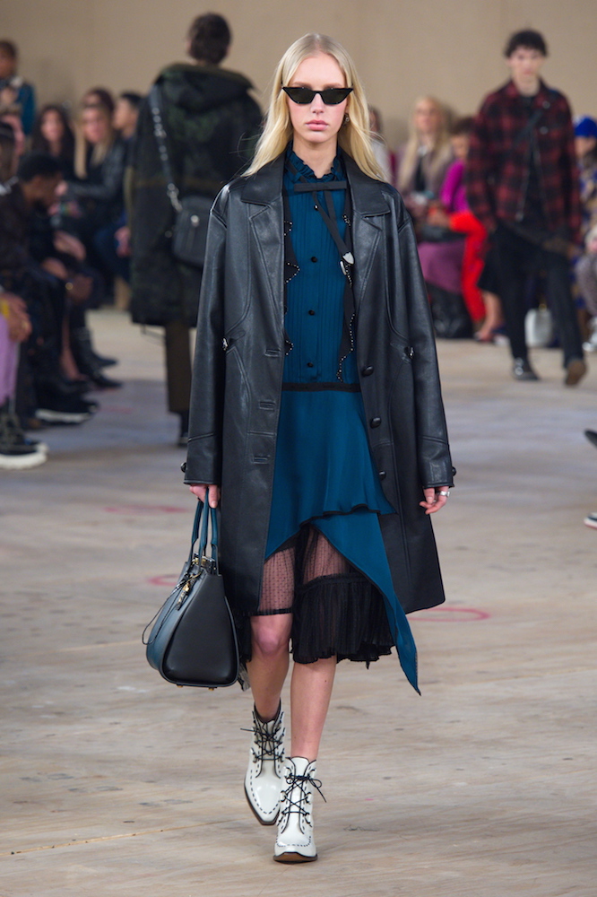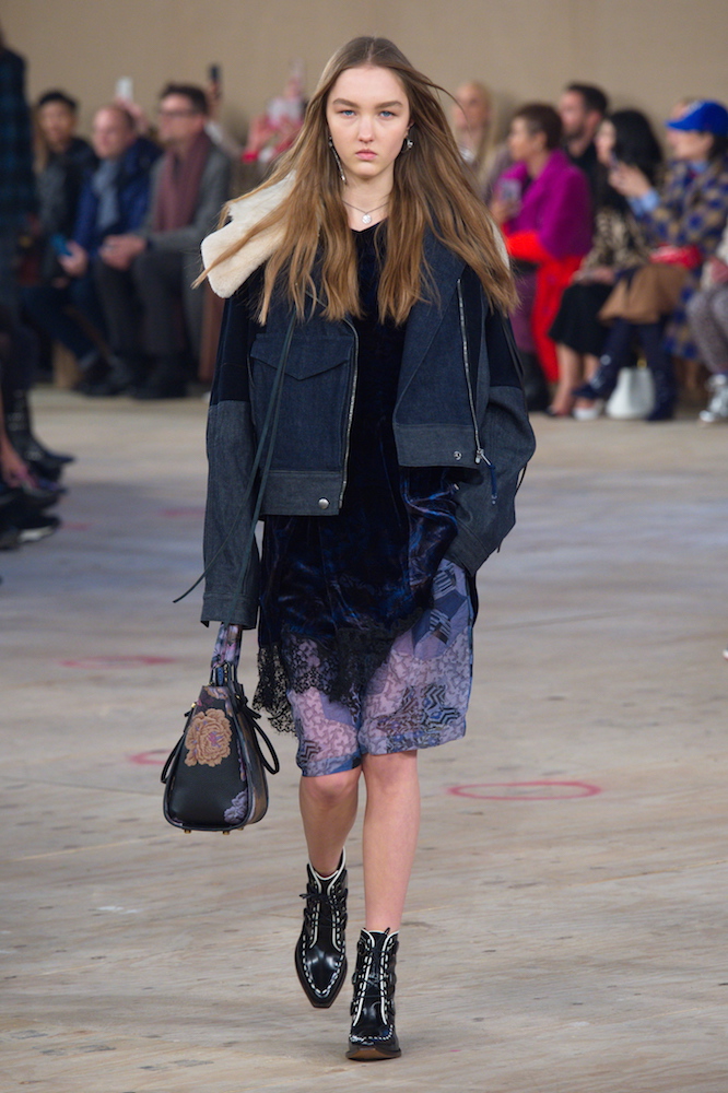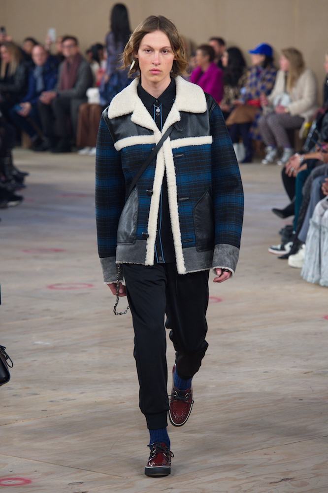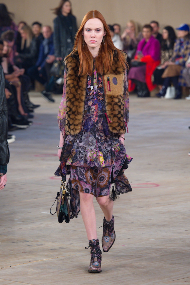 会場となったのは、ニューヨークのアメリカ証券取引所。カラフルなモチーフがテキスタイルのように反復する作風で知られるアメリカ出身のアーティスト Kaffe Fassett (カフェ・ファセット) の作品にインスパイアされたという今回のコレクションもまた引き続き、ダークなエッセンスが散りばめられたフォークロアスタイルが多数お目見え。サイケデリックなムードは健在ながらも、ブルーやパープルなど寒色が基調となることでよりクールな印象に仕上げられている。またチェックパターンのレイヤードが組み合わさることで、Stuart Vevers 節の炸裂したコレクションとなった。