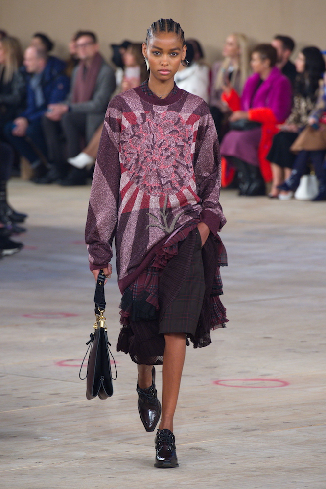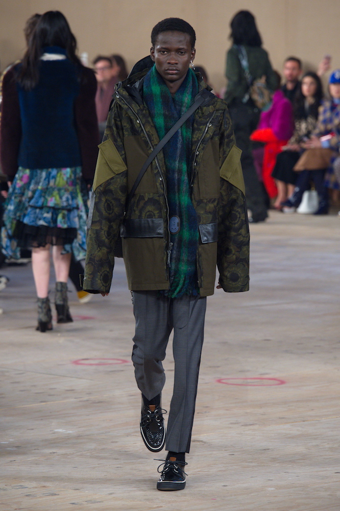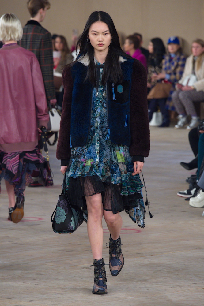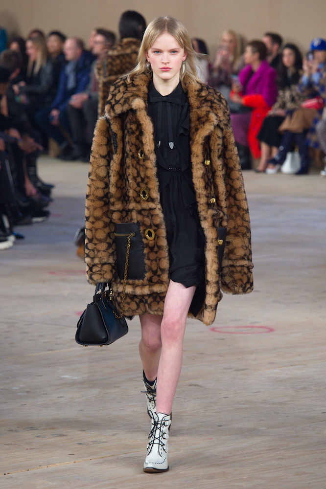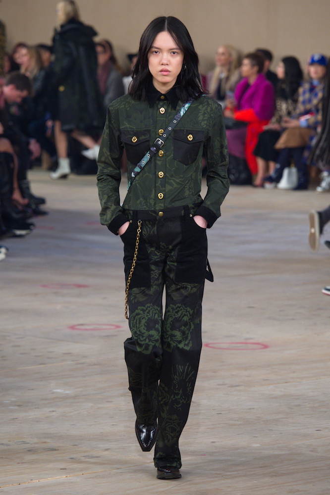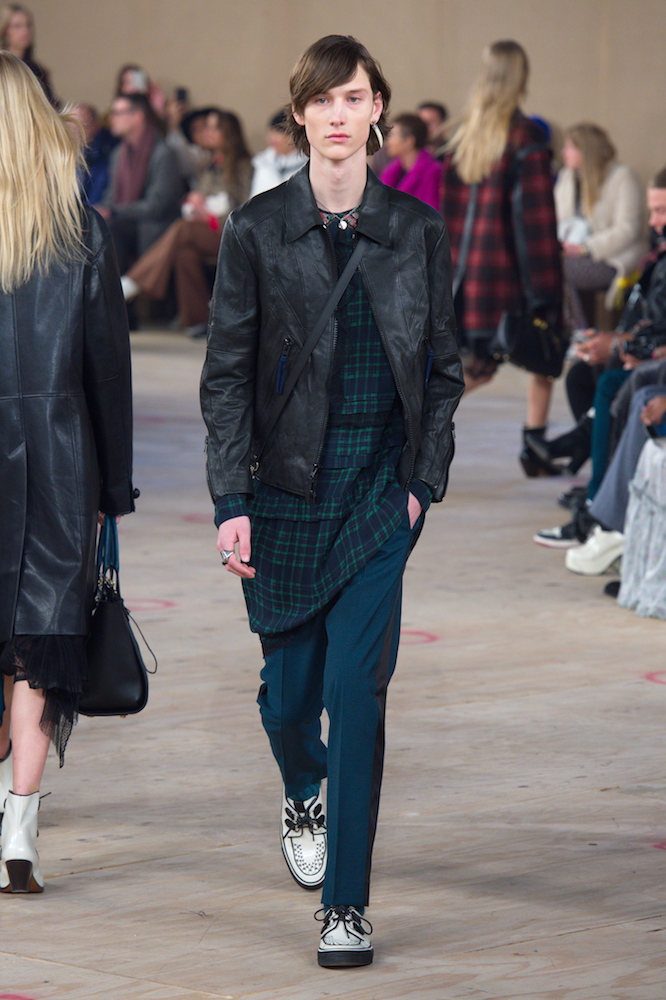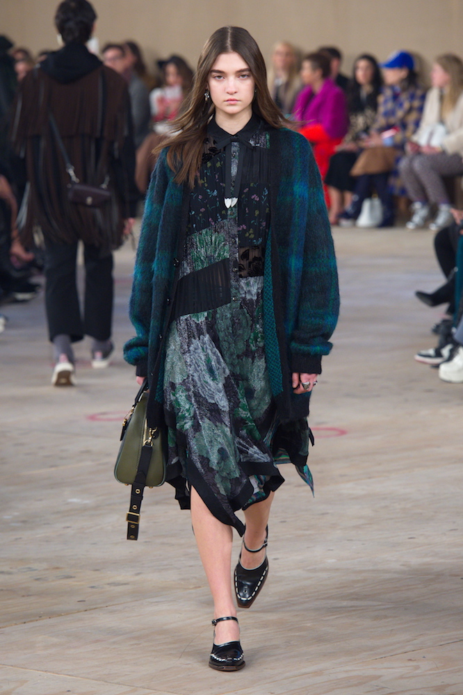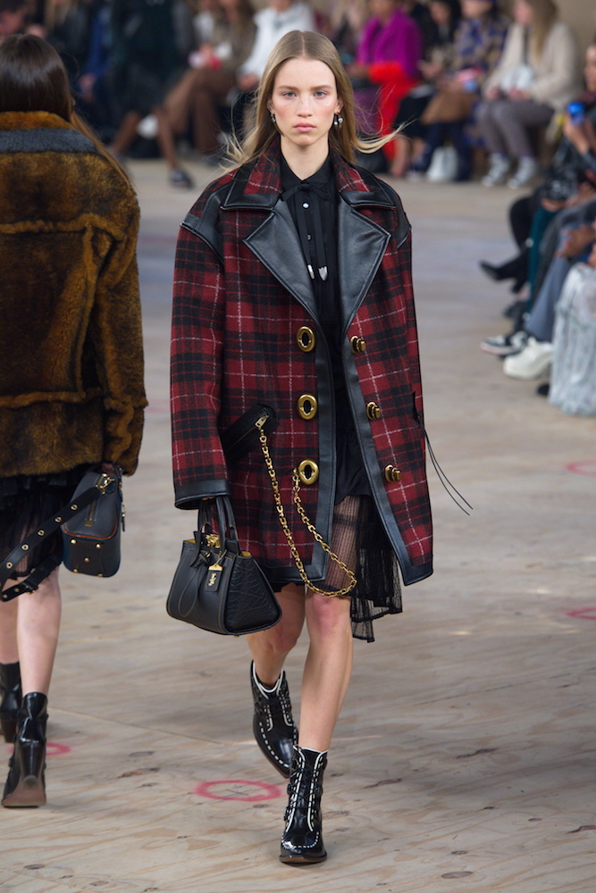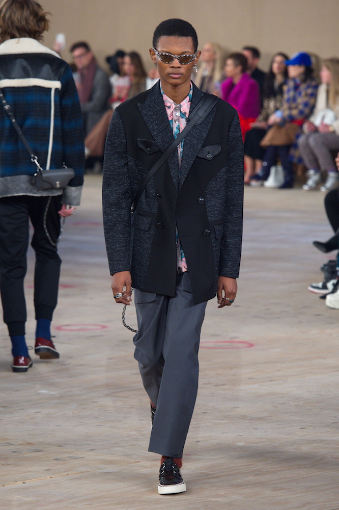 会場となったのは、ニューヨークのアメリカ証券取引所。カラフルなモチーフがテキスタイルのように反復する作風で知られるアメリカ出身のアーティスト Kaffe Fassett (カフェ・ファセット) の作品にインスパイアされたという今回のコレクションもまた引き続き、ダークなエッセンスが散りばめられたフォークロアスタイルが多数お目見え。サイケデリックなムードは健在ながらも、ブルーやパープルなど寒色が基調となることでよりクールな印象に仕上げられている。またチェックパターンのレイヤードが組み合わさることで、Stuart Vevers 節の炸裂したコレクションとなった。