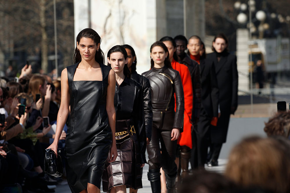 Bottega Veneta のために Daniel Lee が生み出したのは、自由、自己表現、そしてセンシュアリティを称えたコレクション。ブランドのアイデンティティである職人によるクラフツマンシップを存分に発揮しながらも、Daniel Lee のコンテンポラリーな感性が冴え渡ったコレクションに仕上げられている。レザー使いがコレクションの核を握り、ファーストルックのタイトなシルエットのドレスからアウター、ジャケット、パンツ、そしてブーツと多数お目見え。そこにレイヤードされたニットウェアや円形のカッティングが加えられることでハイ&ローの絶妙なバランスが実現している。また、ブランドの象徴であるイントレチャートも Daniel Lee によって再解釈され、進化を遂げるなど、新生 Bottega Veneta の幕開けを感じさせるコレクションとなった。