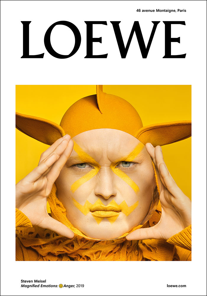 前シーズンから継続して Loewe はランウェイショーに先駆けてキャンペーンビジュアルをパリにてポスタリング。今回のキャンペーンでも、2019年秋冬メンズキャンペーンと同じく「誇張された感情」と題された数種類の絵文字を拡大したカラーポートレートが登場した。モデルの Julia Nobis (ジュリア・ノビス) が「欲望」と「怒り」といった感情を表現している。また、お菓子で溢れるキャンディーショップでモデルの Mona Tougaard (モナ・トゥーガード) を撮影したビジュアルも。彼女が被っているのは、ミッドセンチュリー時代のサンフランシスコ出身の帽子職人である Colette (コレット) にインスパイアされたフェルト製の「プロペラ」ハット。手元には、1950年代ストラエター社製のクラシックな「ライト-オン(Lite-on)」(電池式ライトが取り付けられており、留め具部分のスイッチで操作する仕組みになっているユニークなハンドバッグ)をロエベが誇るクラフト技術によって今日に蘇らせたボックス カーフ製のランタン バッグを携えてる。そして、キャンペーンを締めくくるのは、職人技を称えるカーフ製の「ラゾ バケット」バッグの静物画。2019年秋冬の新たなフォルムとして前回のショーでお披露目されたラゾは、カーフスキンを近代的なバケットスタイルに落とし込んだ注目のショルダーバッグだ。