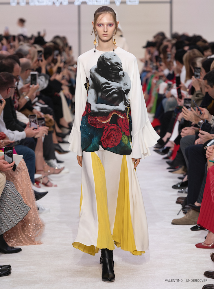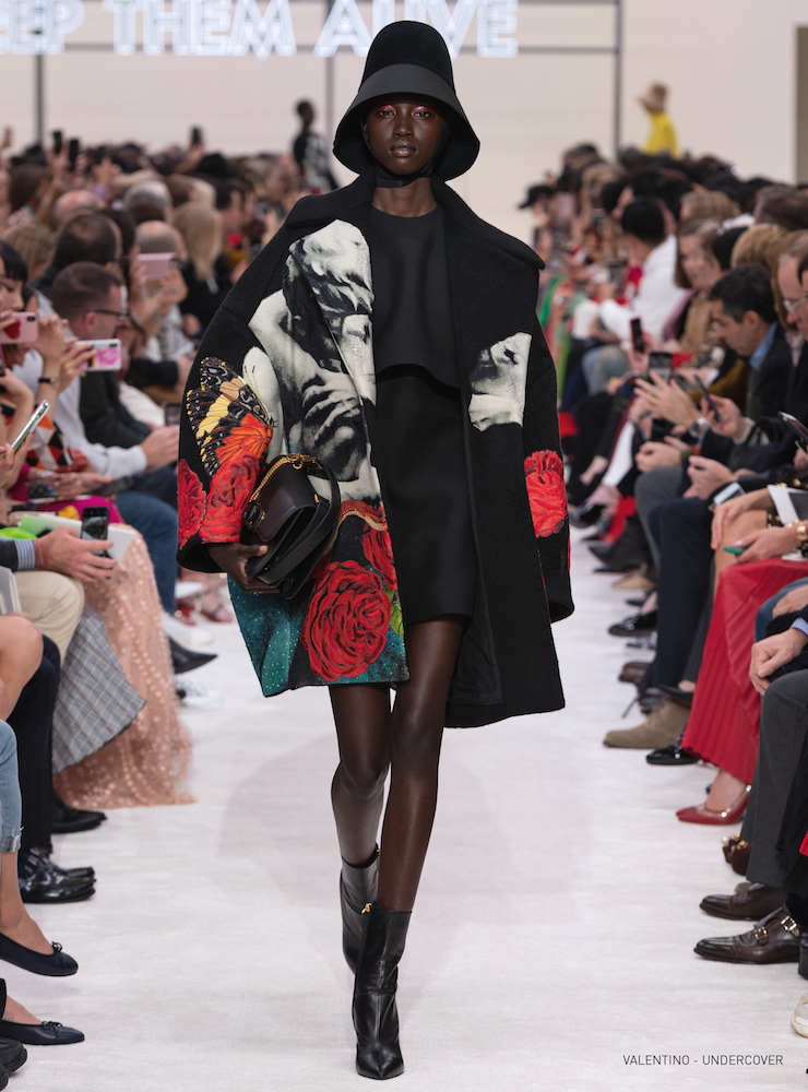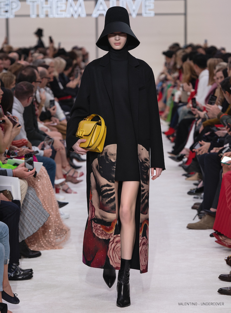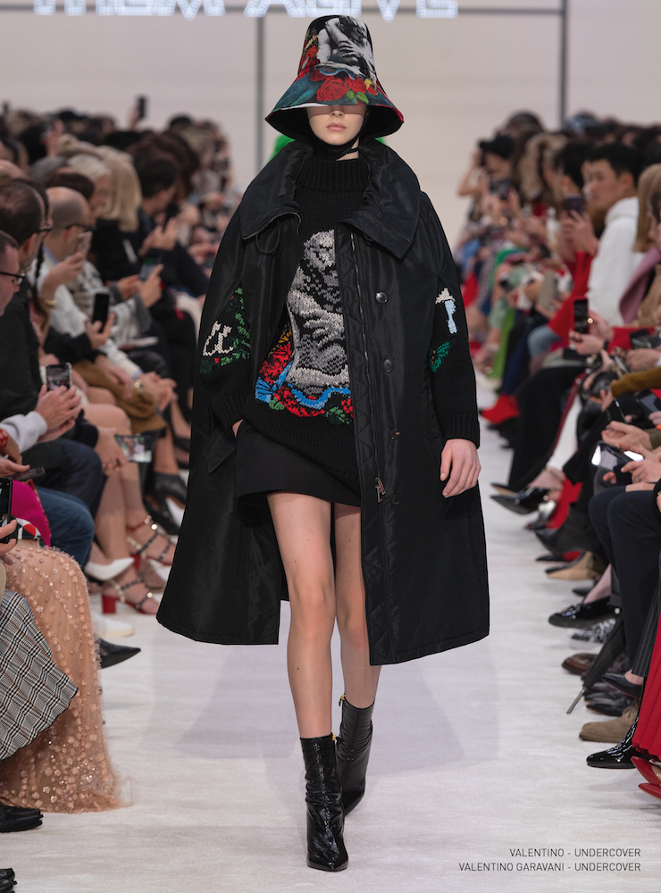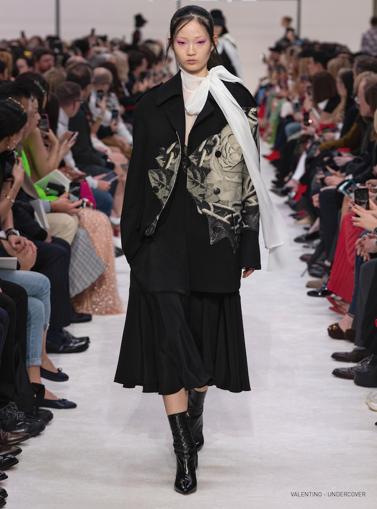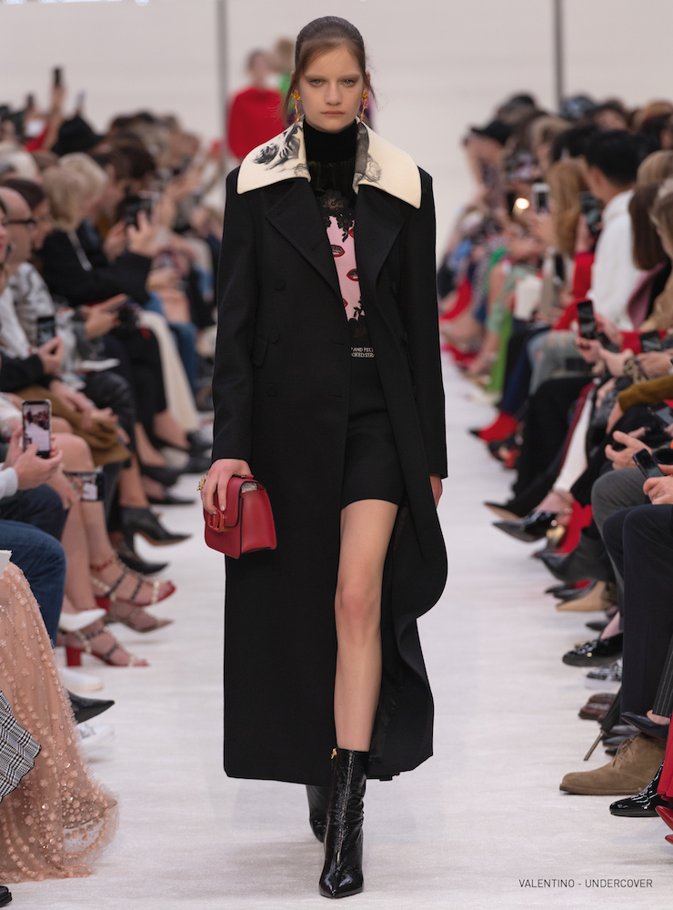 抱擁とバラのグラフィックは19-20AWメンズコレクションに次いで、ピエールパオロが UNDERCOVER (アンダーカバー) の高橋盾に依頼したコラボレーションだ。バラの象嵌を入れたラムコートの裾には「VALENTINO UNDERCOVER」と入っている。