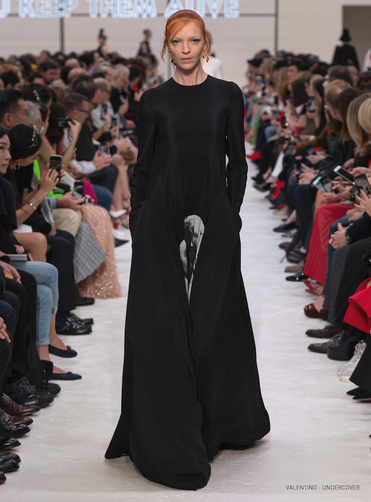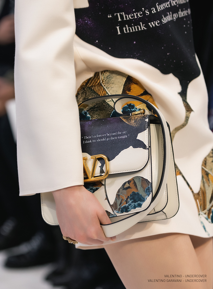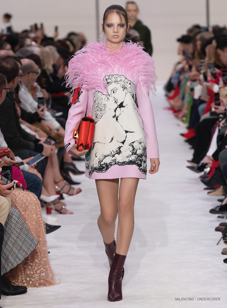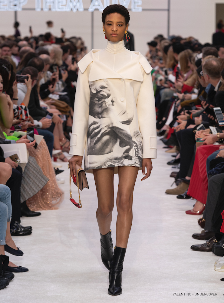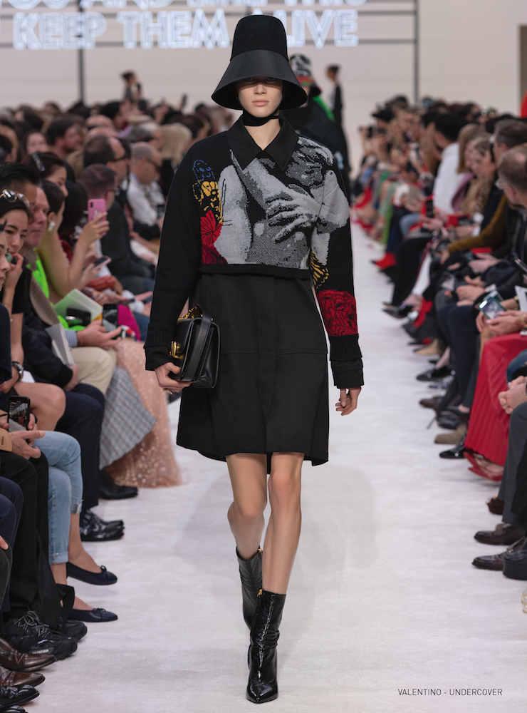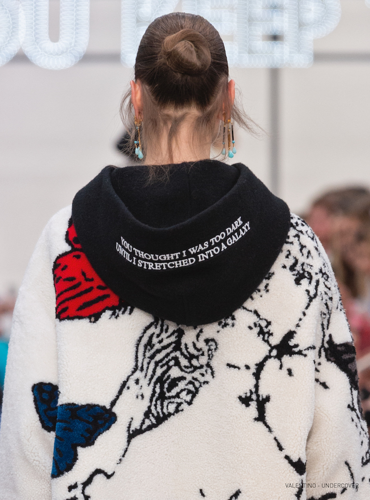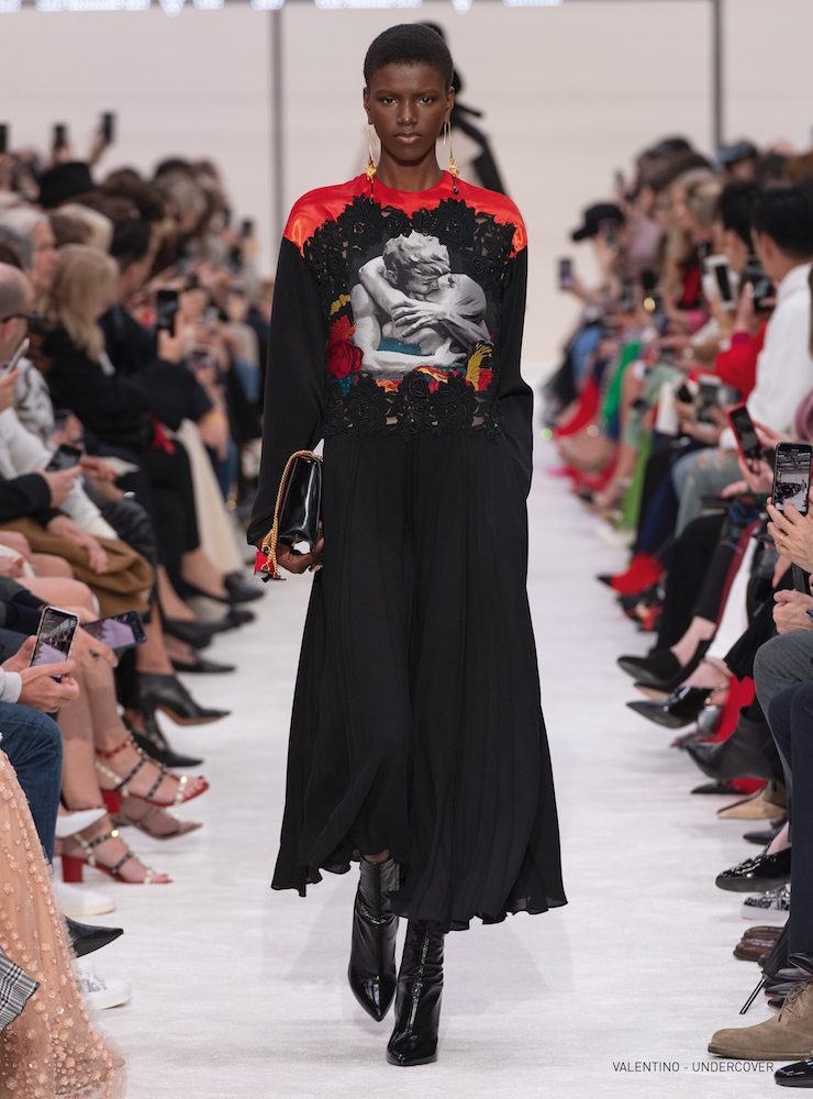 抱擁とバラのグラフィックは19-20AWメンズコレクションに次いで、ピエールパオロが UNDERCOVER (アンダーカバー) の高橋盾に依頼したコラボレーションだ。バラの象嵌を入れたラムコートの裾には「VALENTINO UNDERCOVER」と入っている。