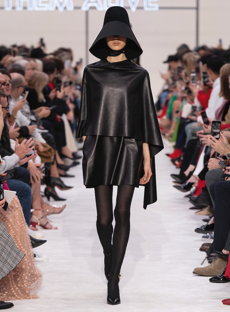 ファーストルックは量感あるラグランスリーブのショートコートだ。前面に抱擁している19世紀の彫刻が赤いバラに包まれている。目が隠れるほどの大きな台形の帽子がエレガントだ。今シーズンはミニも多く登場している。ナッパをケープのように巻くドレスはシルクのようにしなやかだ。ロマンティックなスタイルもリアルに、現代女性のアイテムに落とし込んでいる。