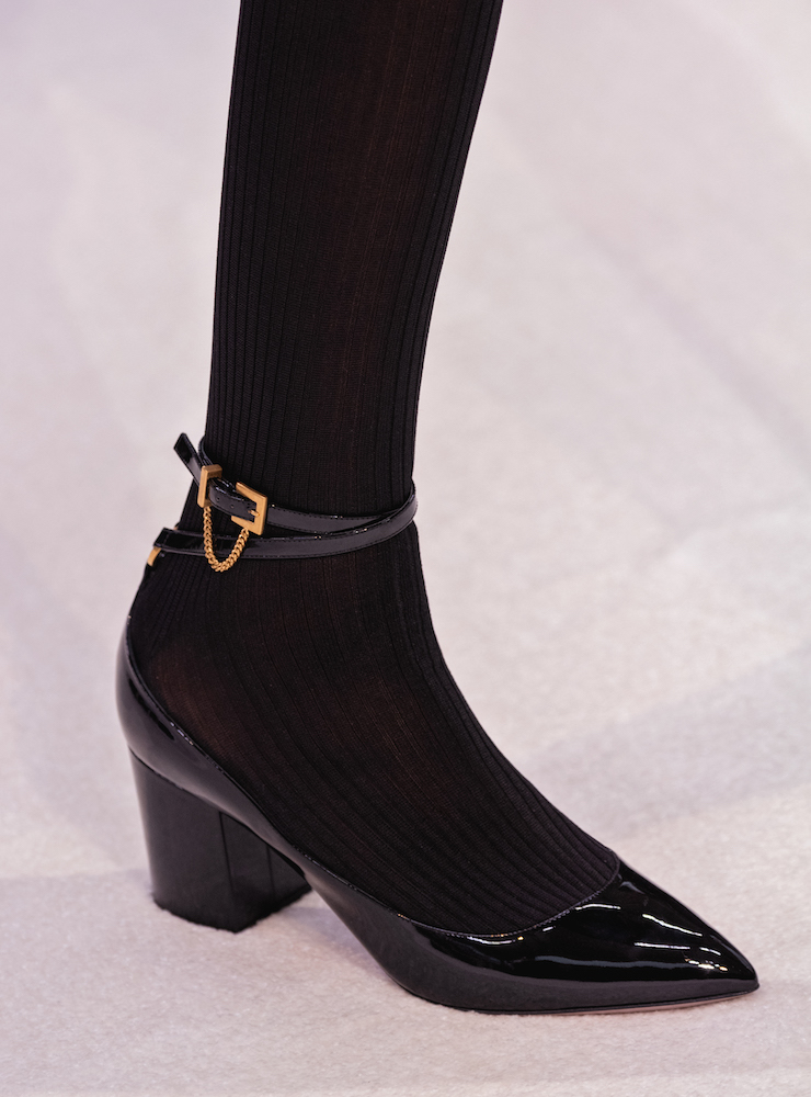 シルクのドレスは絞ったウエストから、バイカラーのプリーツスカートが広がり、レザーブーツと合わせてリアルな着こなしだ。繊細なクチュール技によるシフォンドレスも軽快に並ぶ。現代のエレガンスを感じさせるコレクションだ。