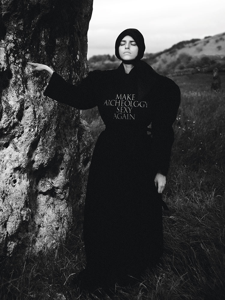 「WILTSHIRE BEFORE CHRIST(WB4C)」は、先述の3者が構想から制作まで全て共同で行ったプロジェクト。その作品は神秘主義や異教徒のシンボル、そして特に英国のアイデンティティ、時代や場所の探求への取組みとしてストーンヘンジやエーヴベリーという英国の新石器時代の主要となる遺跡で撮影されている。今回のプロジェクトに際し Sofia Maria Prantera は以下のコメントを寄せている。「私にとって Aries はアイデアやコラボレーションの手段でもあり、私たちが生み出す服のフレームとなっています。 どこにでもファッションがある今、洋服だけでブランドを定義づけるのが難しく、正直商業的だけとなると面白みがない。製品以外のアウトプットに投資することは私にとっては不可欠なのです。このプロジェクトは伝統的なファッションの考え方を覆し、製品がフォーカス (焦点) ではなく、何かを可能にするきっかけに過ぎないということを伝えます。私たちは古代シンボルに魅了されていて、Aries でもグラフィックとして常に登場させています。Jeremy Deller の作品も同じようなテーマをフォーカスしているので、一緒に製品開発や展示会ディスプレイを考えるのは素晴らしいプロセスでした。社会としては宗教を失ったかもしれませんが、このプロジェクトを通して異教主義とスピリチュアルへの回帰することで、他人とつながる新しい方法を提案できればと思っています。」