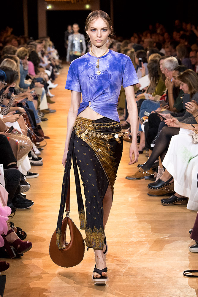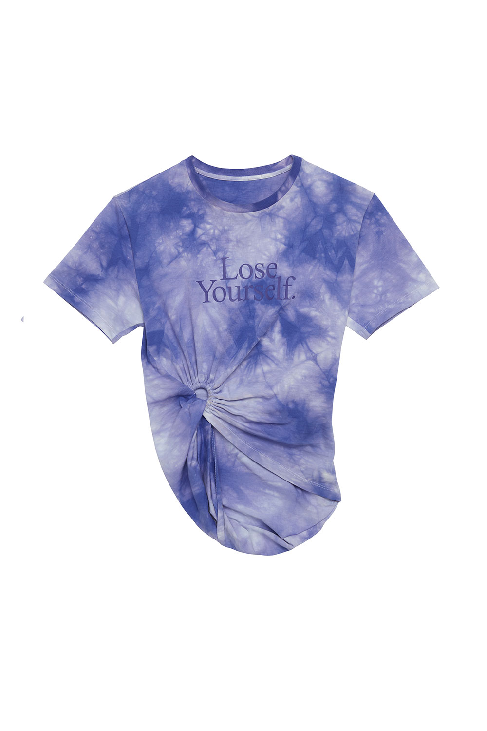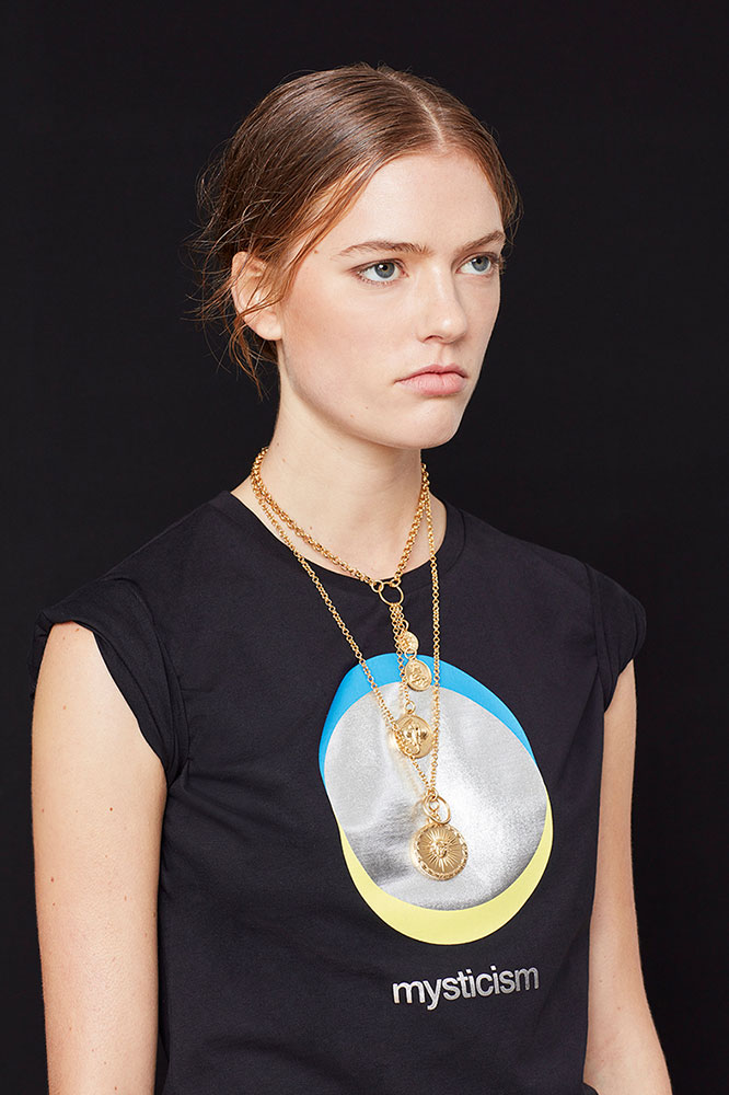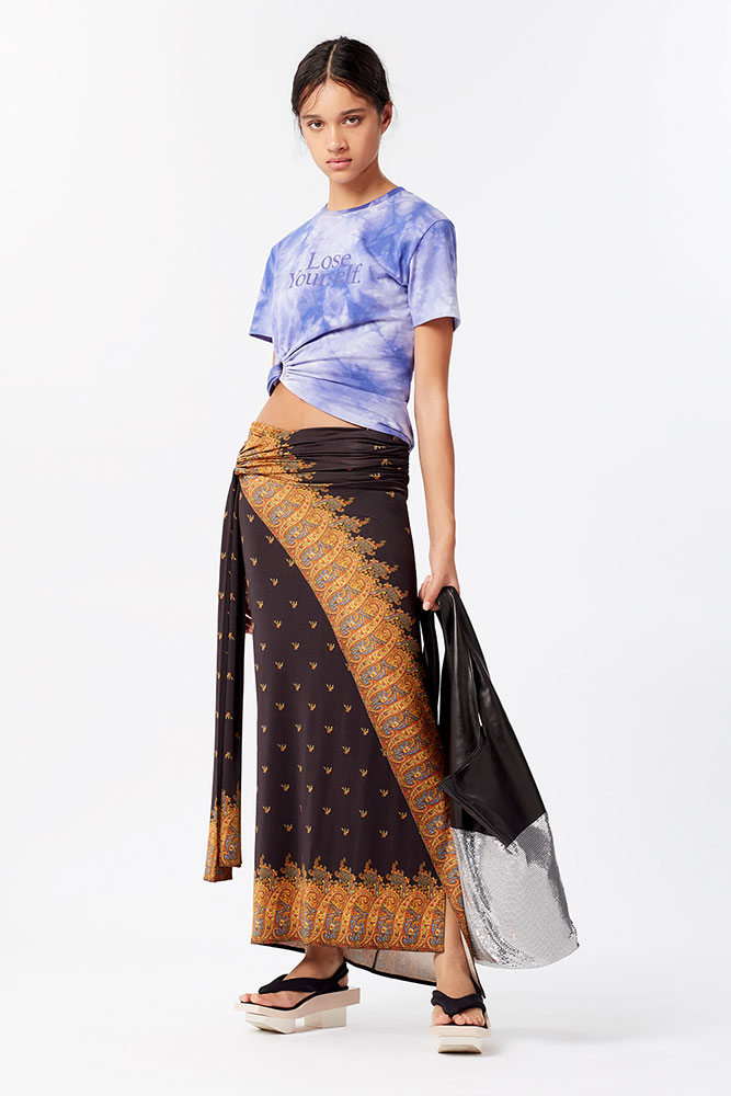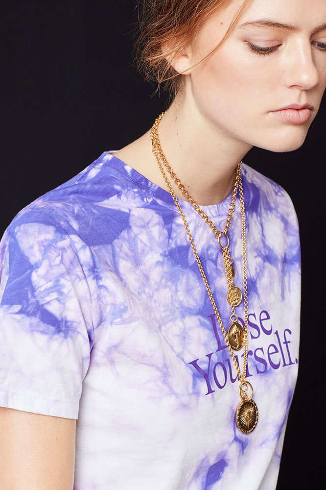 クリエイティブディレクターの Julien Dossena (ジュリアン・ドッセーナ) による2019年春夏コレクションのランウェイショーにも登場し、一際存在感を放っていたタイダイプリントの上に冠された「Loose Yourself」というメッセージ。Peter Saville とタッグを組むことによって生まれたこのシンプルながらも力強いデザインは、ウェスト位置をツイストしたコットンジャージートップスの他、Tシャツとしてもお目見え。また、「ミスティシズム(神秘主義)」という言葉と Peter Saville によって月食を表現したグラフィックとあわせてTシャツにプリントされている。Julien Dossena と Peter Saville のクリエイティビティが凝縮されたコレクションだけにファンならずとも是非一枚は手に入れておきたいところだ。同コレクションは、Paco Rabanne のパリのブティックと公式ウェブサイトにて発売中。
