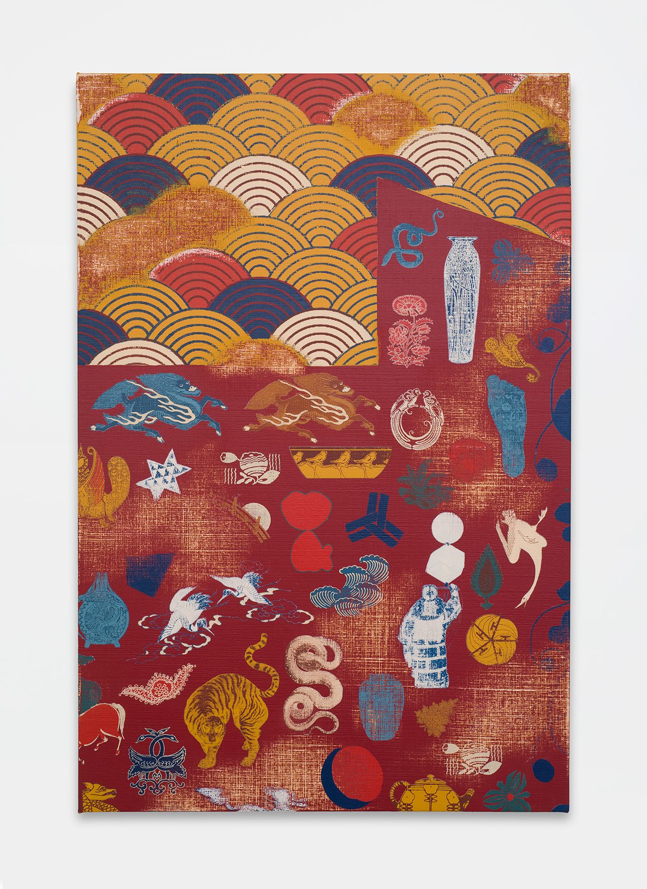 また、「ジャポニズム」についての研究から生まれた、浮世絵の手法による作品からも読み取れるように、彼にとって様々な制作プロセスは、アプローチの幅を広げるというだけでなく、特定の創作技法の歴史が持つ伝統と繋がるための回路でもあるという。このシリーズで浮世絵の制作に用いられる技法とイメージを組み合わせつつ、西洋のモダニズム芸術の伝統に由来する、より大型のキャンバス絵画を制作している。組み合わされることで様々な美術史へとつながっていくイメージとプロセスは、文化の交わりを芸術的な革新性を導くものとして提示するとともに、ただひとつのオリジナリティが存在するという考え方を撹乱しようとしている。