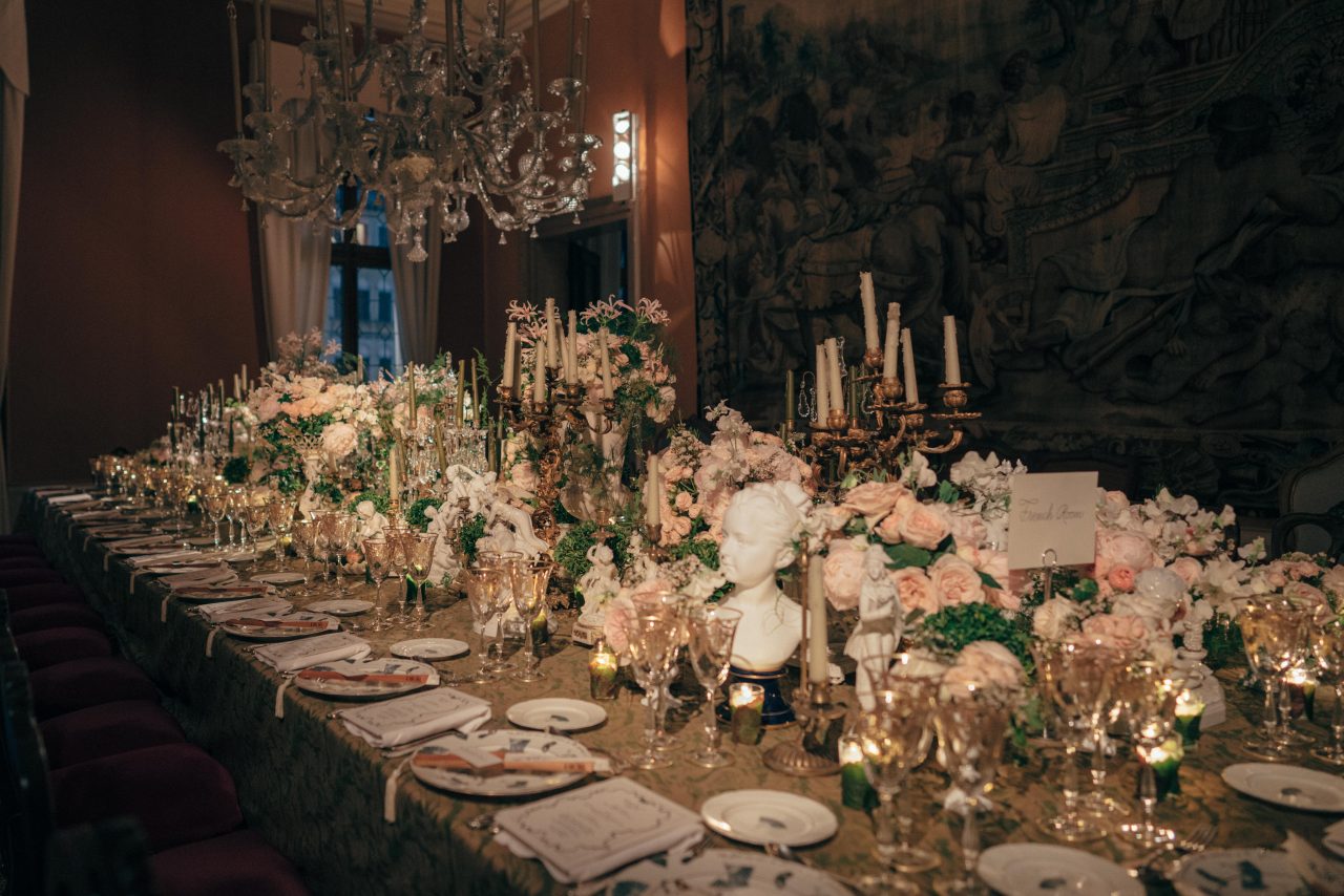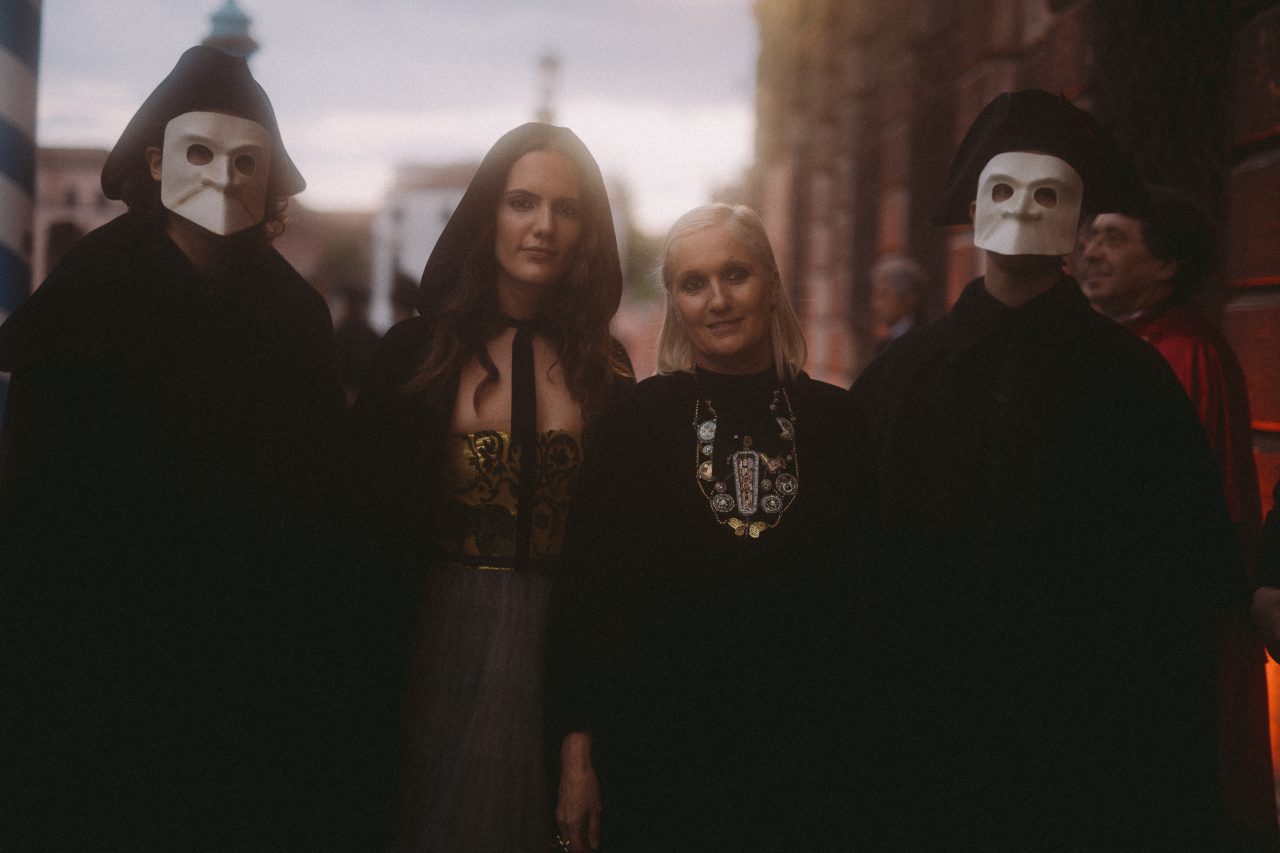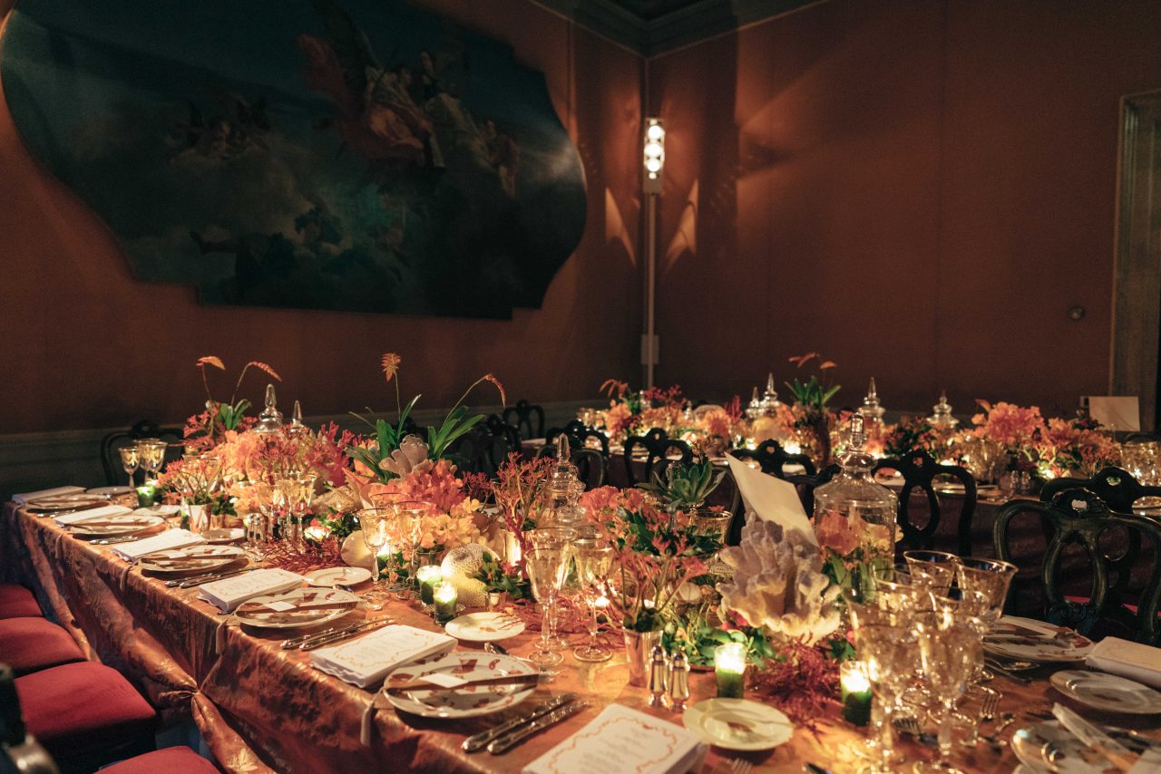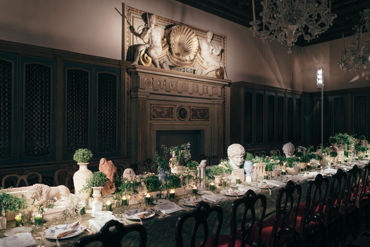 ヴェネツィアの文化遺産の修復とその促進を目的に開かれるチャリティ ディナーと舞踏会である「Tiepolo Ball」。今年は、1951年に Charles de Beistegui (カルロス·デ·ベイステギ) が催した伝説として語り継がれる “世紀の舞踏会” を踏襲し、一夜限りの豪華絢爛な夜会を開催。Christian Dior (クリスチャン・ディオール) と Salvador Dalí (サルバドール・ダリ) が共に祭典のオープニングを飾った偉人たちのためのドレスをデザインしたように、アーティスティック ディレクター Maria Grazia Chiuri (マリア・グラツィア・キウリ) は、一握りのメゾンの友人たちのためにヴェネツィアの名高いメゾンである Bevilacqua (べヴィラクア) と Rubelli (ルベリ) とのコラボレーションのもとエクスクルーシブなデザインのコスチュームを創作。テーブルウェアには、同じくヴェネツィアの Fortuny (フォルトゥーニ) のアーカイブである貴重なファブリックを使用するなど細部までこだわり抜かれた空間がゲストたちをもてなした。