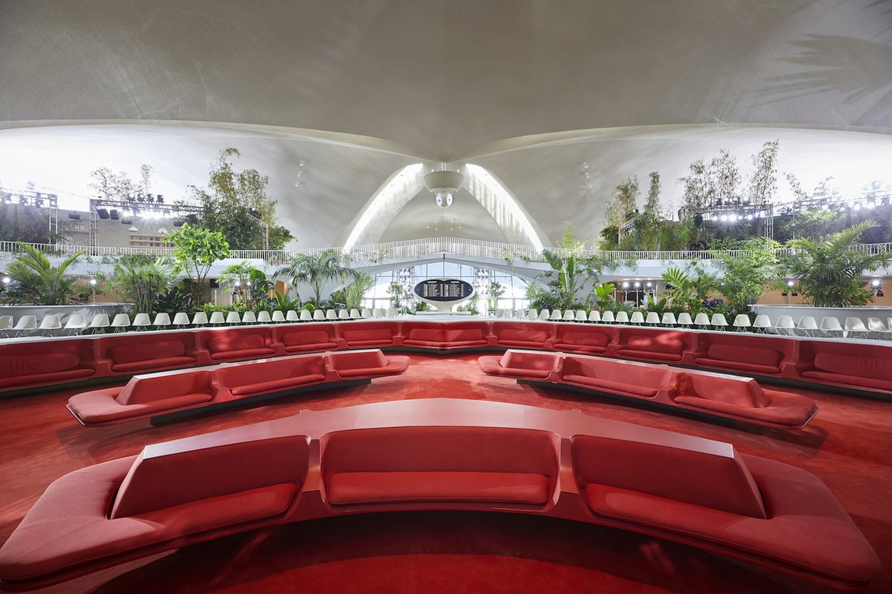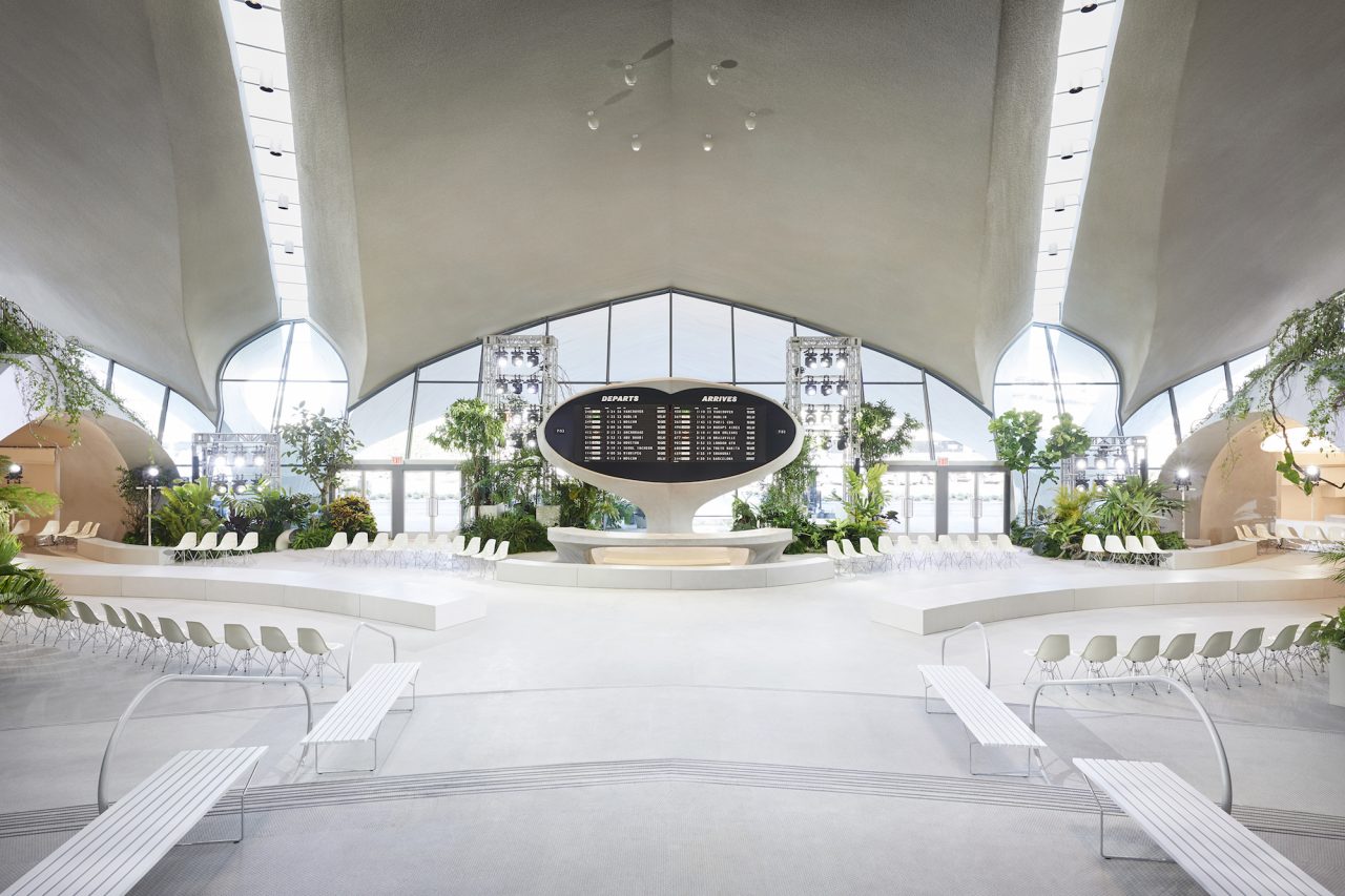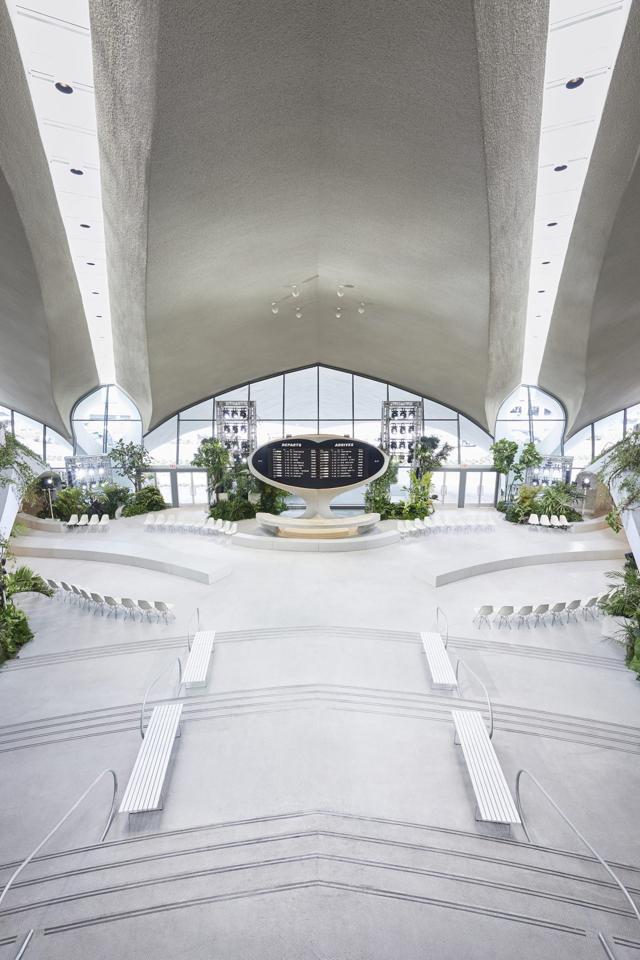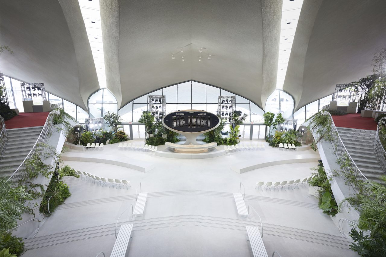 実際、「私は幸運にも90年代の終わりに TWA フライトセンターに飛行機で到着したことがあります。それは、決して忘れられない想い出です。この場所は、20 年間も忘れ去られていました が、現代に再び蘇りました。まさに復活した聖域のようであり、ホテルという異なる形で新たな魅力を発揮する姿を見られるのは大きな喜びです。アメリカのヘリテージの一部でもある類い稀な場所を再発見するという喜びに溢れています」 と同氏もコメントしているように、この会場が本コレクションにおいて重要な役割を果たしていた。ショー当日はランウェイに植物が飾られ、これまで見たことのない独創的な景観に。この植物は、寄贈または堆肥として再利用されていく予定だという。