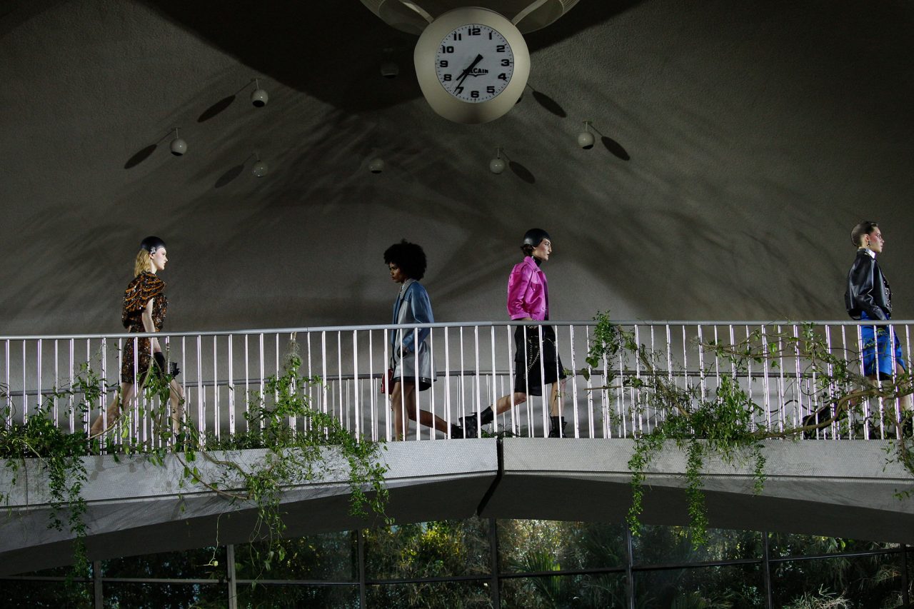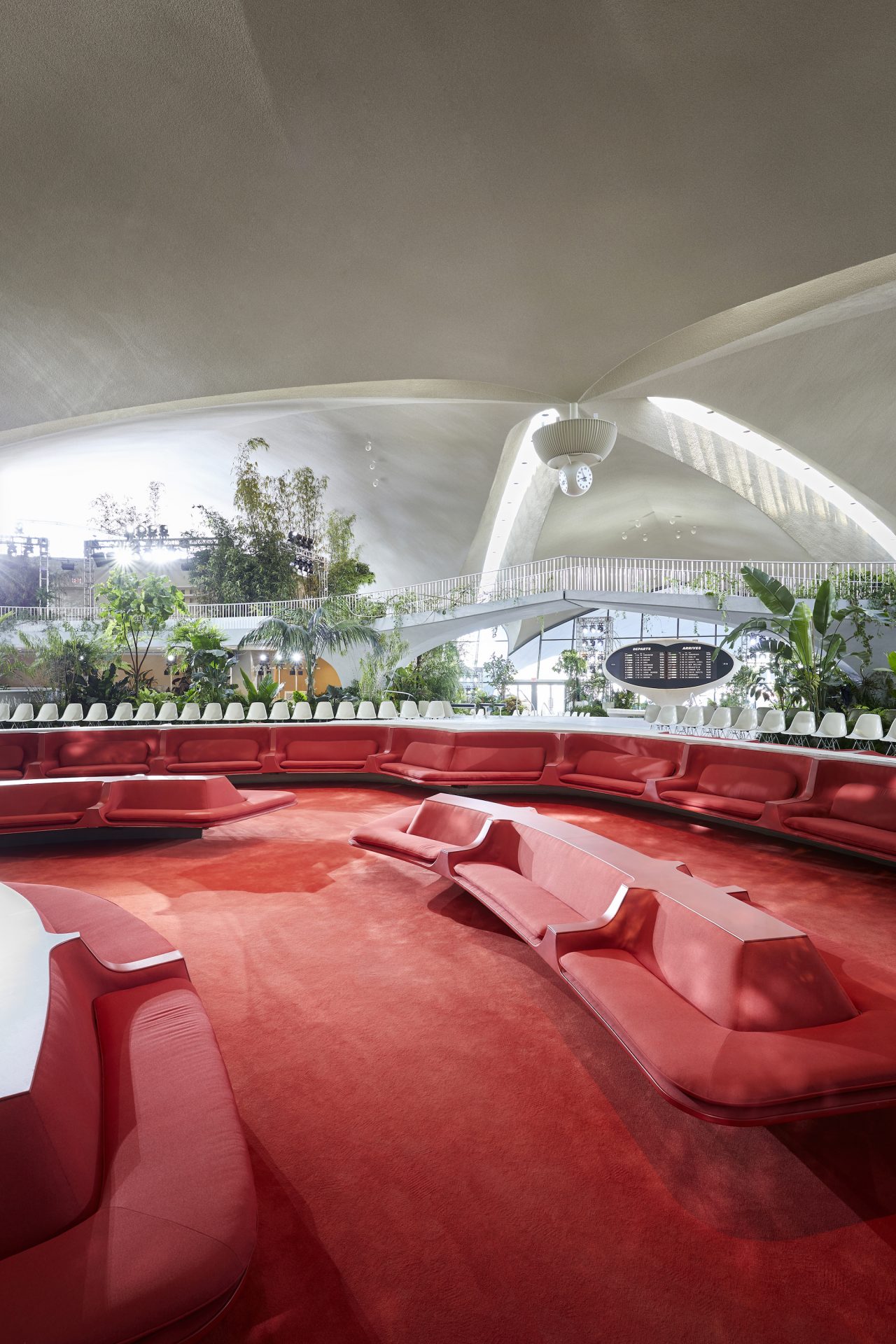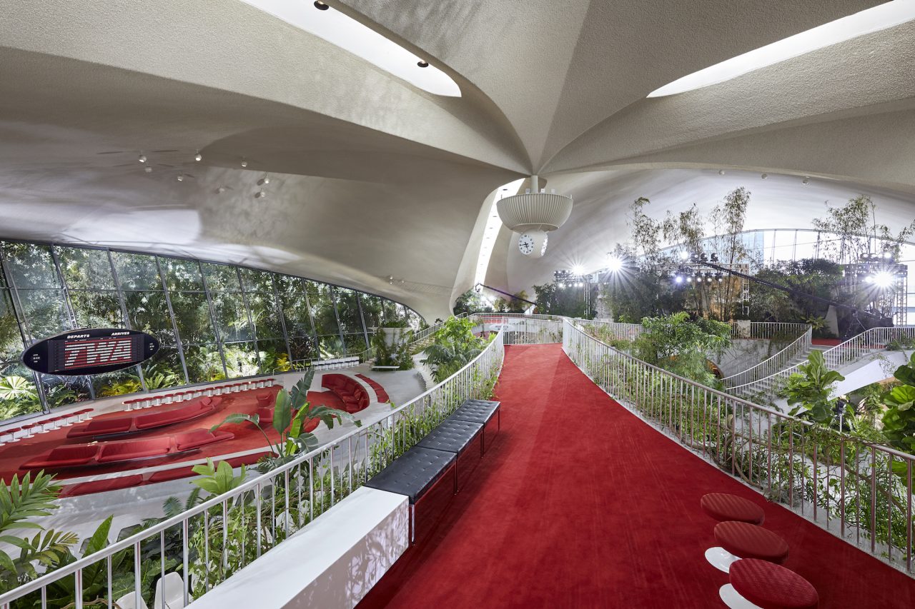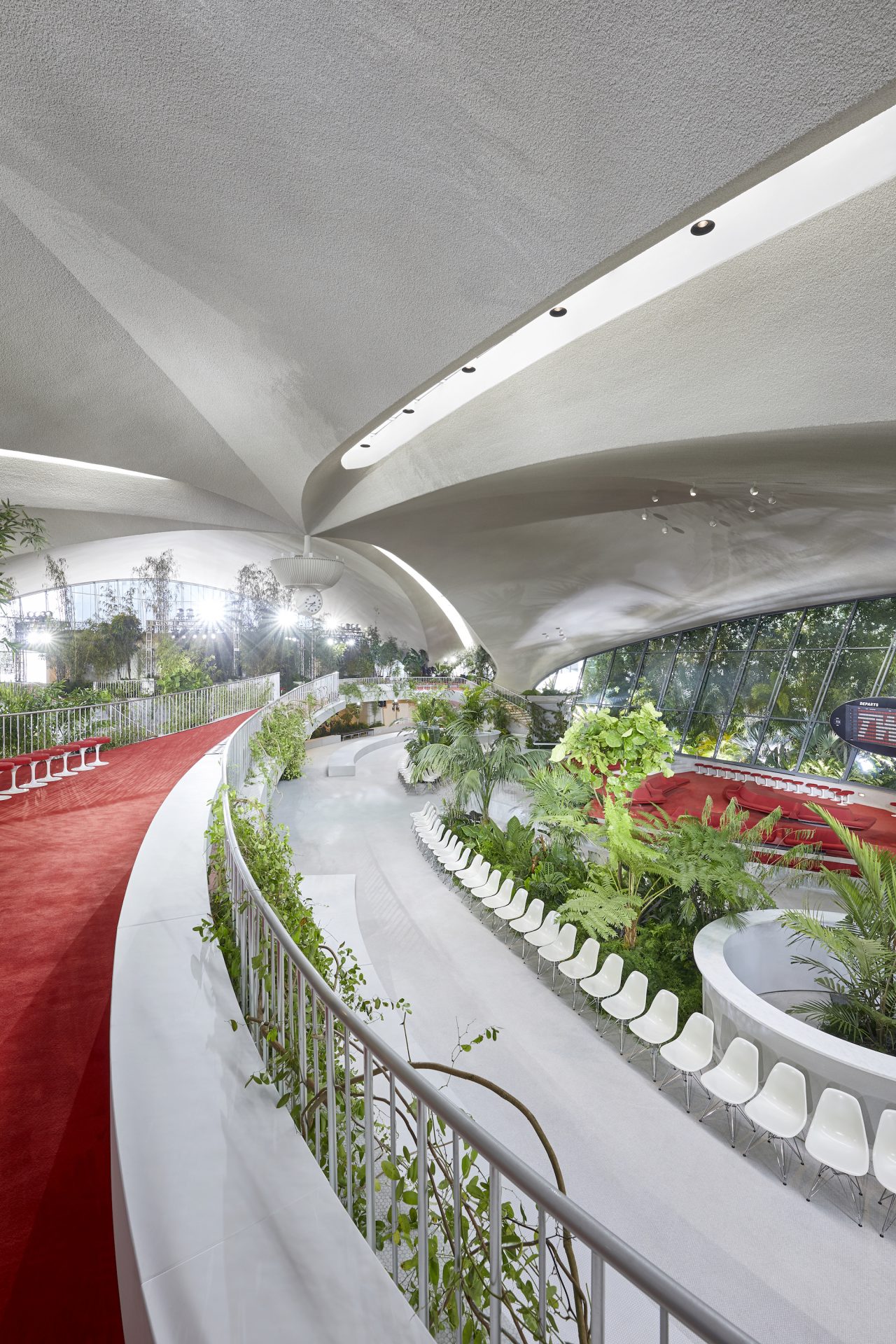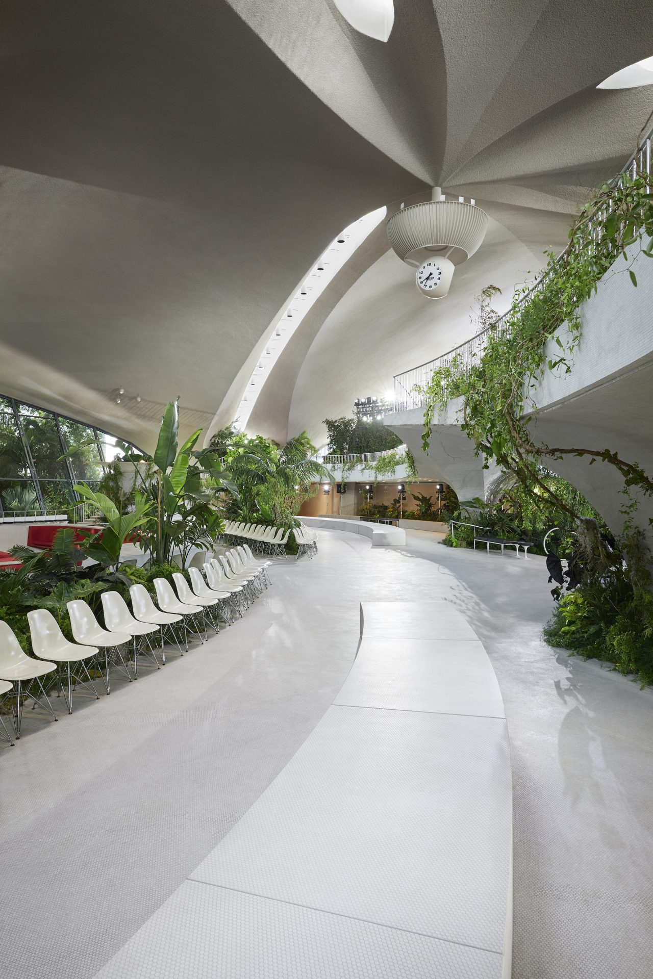 実際、「私は幸運にも90年代の終わりに TWA フライトセンターに飛行機で到着したことがあります。それは、決して忘れられない想い出です。この場所は、20 年間も忘れ去られていました が、現代に再び蘇りました。まさに復活した聖域のようであり、ホテルという異なる形で新たな魅力を発揮する姿を見られるのは大きな喜びです。アメリカのヘリテージの一部でもある類い稀な場所を再発見するという喜びに溢れています」 と同氏もコメントしているように、この会場が本コレクションにおいて重要な役割を果たしていた。ショー当日はランウェイに植物が飾られ、これまで見たことのない独創的な景観に。この植物は、寄贈または堆肥として再利用されていく予定だという。