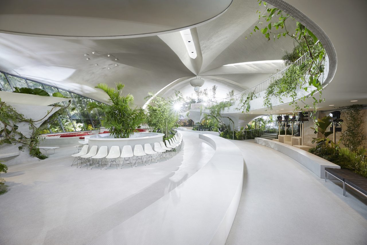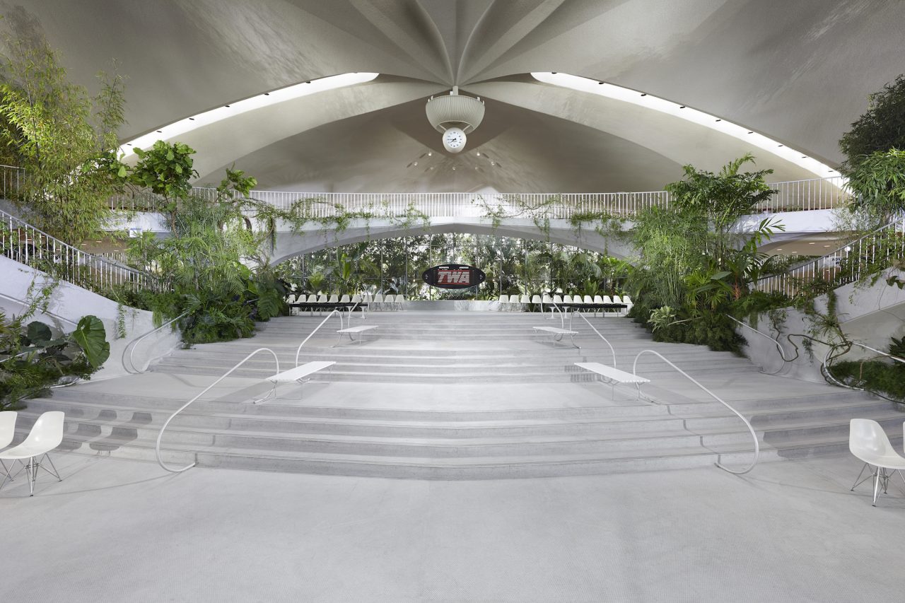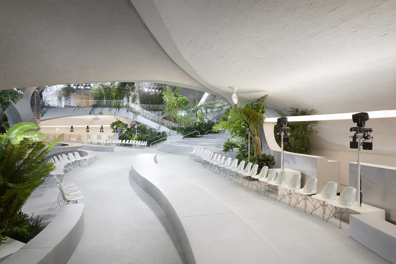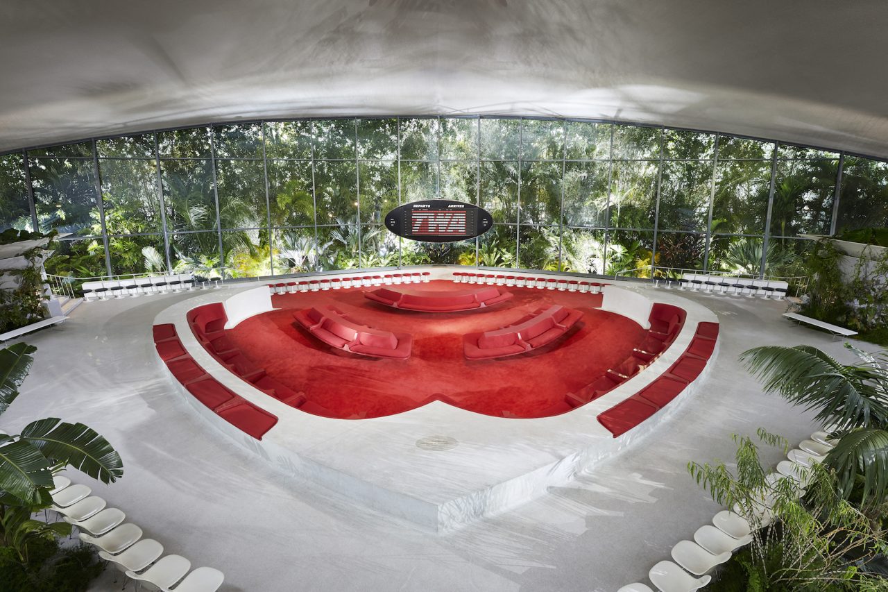 実際、「私は幸運にも90年代の終わりに TWA フライトセンターに飛行機で到着したことがあります。それは、決して忘れられない想い出です。この場所は、20 年間も忘れ去られていました が、現代に再び蘇りました。まさに復活した聖域のようであり、ホテルという異なる形で新たな魅力を発揮する姿を見られるのは大きな喜びです。アメリカのヘリテージの一部でもある類い稀な場所を再発見するという喜びに溢れています」 と同氏もコメントしているように、この会場が本コレクションにおいて重要な役割を果たしていた。ショー当日はランウェイに植物が飾られ、これまで見たことのない独創的な景観に。この植物は、寄贈または堆肥として再利用されていく予定だという。
