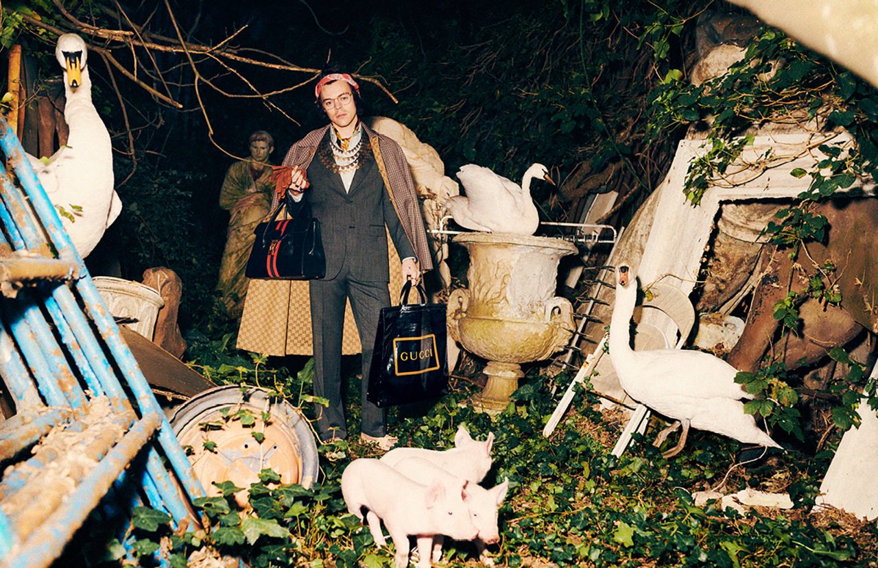 GUCCI クリエイティブ・ディレクターの Alessandro Michele (アレッサンドロ・ミケーレ) は、2019年プレフォール メンズ テーラリング コレクションでメンズスーツの既成概念にとらわれない、まったく新しいフォーマルウェアを提案。上質な仕立てのメンズ テーラリング アイテムはこれまでにないパターンやカラーで展開され、そこに個性的なアクセサリーや装飾を組み合わせる GUCCI らしい折衷的なスタイルで表現されている。キャンペーンの舞台には、 Alessandro Michele の風変わりなものや古風なものへの自身の愛着が反映され、骨董品に囲まれた部屋や森が選ばれた。彫像や骨董品が静かに眠りについているその場所で、ペットの子ブタとハクチョウとともにエキセントリックでありながら同時にノンシャランな雰囲気を醸し出す Harry Styles の姿を、Harmony Korine のカメラが捉えた。