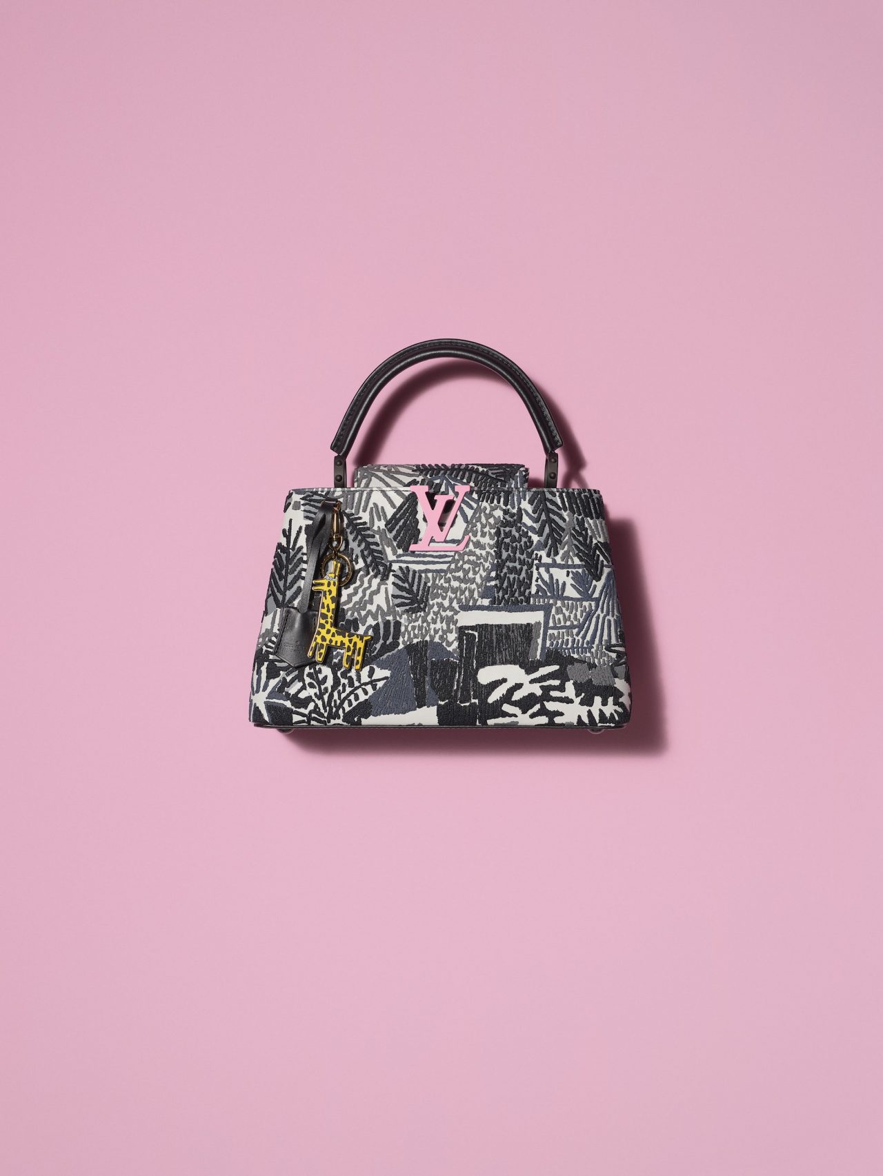 マティスやホックニーを彷彿とさせるロサンゼルス拠点のアーティスト Jonas Wood は、風景などが描かれたポットと輪郭がくっきりした植物が融合する絵画作品 シリーズ「ランドスケープ・ポット」をベースとした「カプシーヌ」を発表。ポットや熱帯植物のディテールは抽象的で幾何学的な形状やモチーフになり、最先端のハイレゾ技術でカーフレザーにプリントされている。また高解像度プリントで制作されたキリンのチャームがアクセントを加えている。