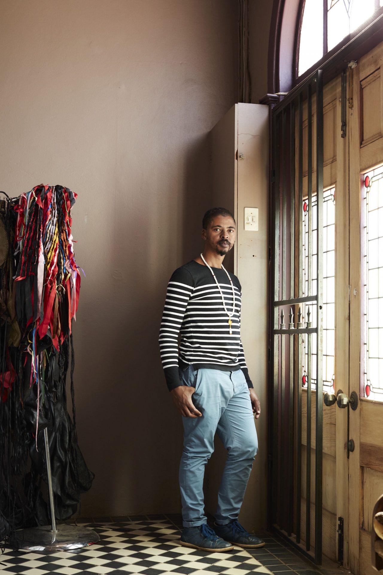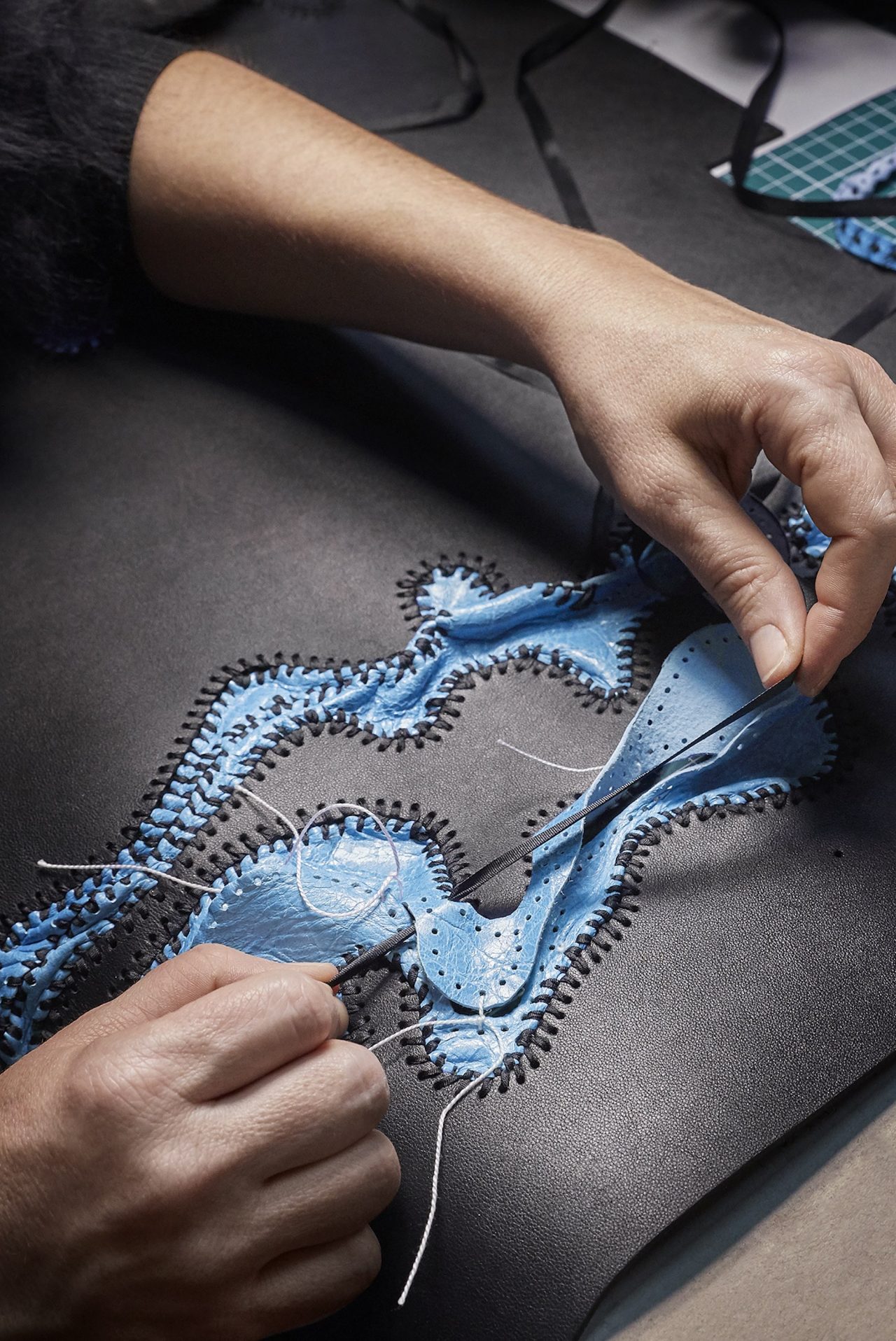 ヨハネスブルグを拠点とする Nicholas Hlobo は、Louis Vuitton のモノグラム・フラワーからインスピレーションを得て、青いレザーパッチをバッグのブラックレザーに直接縫い合わせることで、まるでバッグの表面から植物が有機的に芽吹いて育ったかのようなバッグをデザイン。