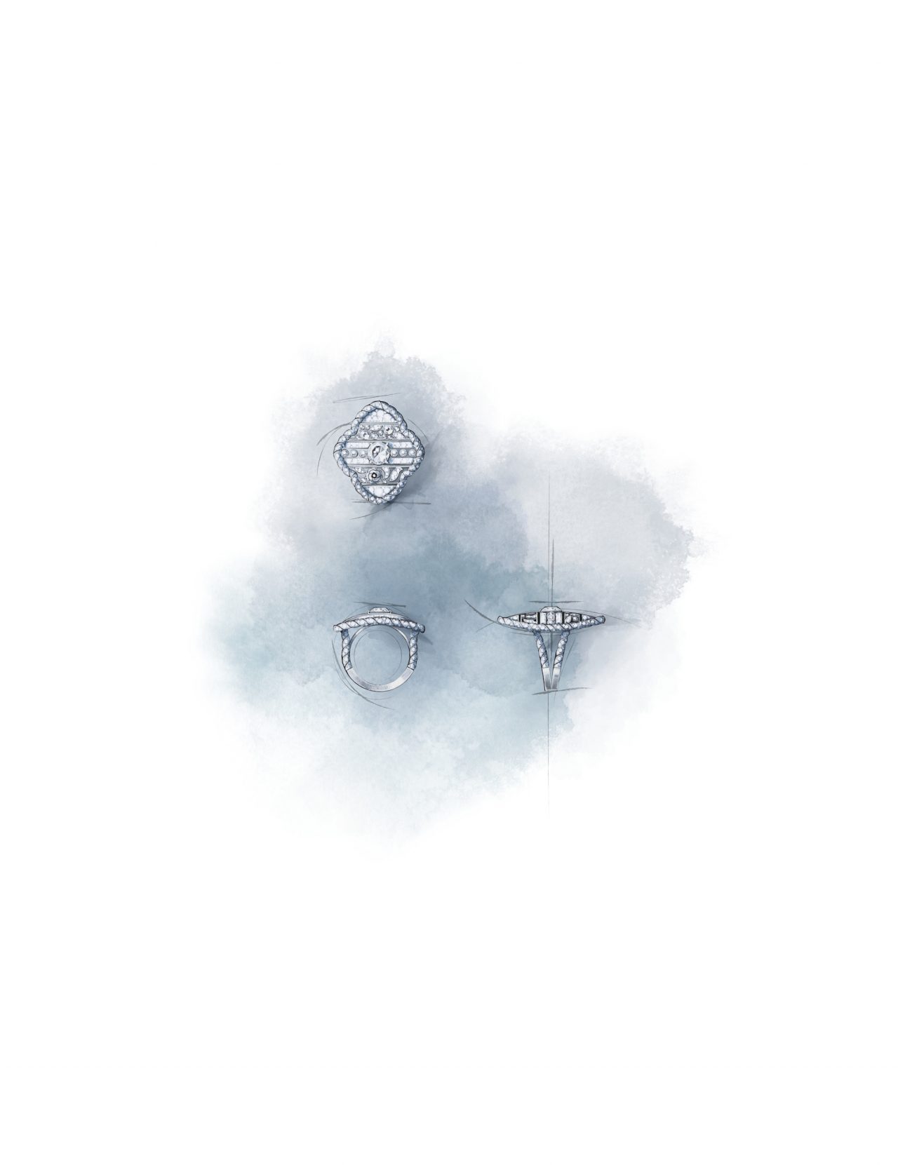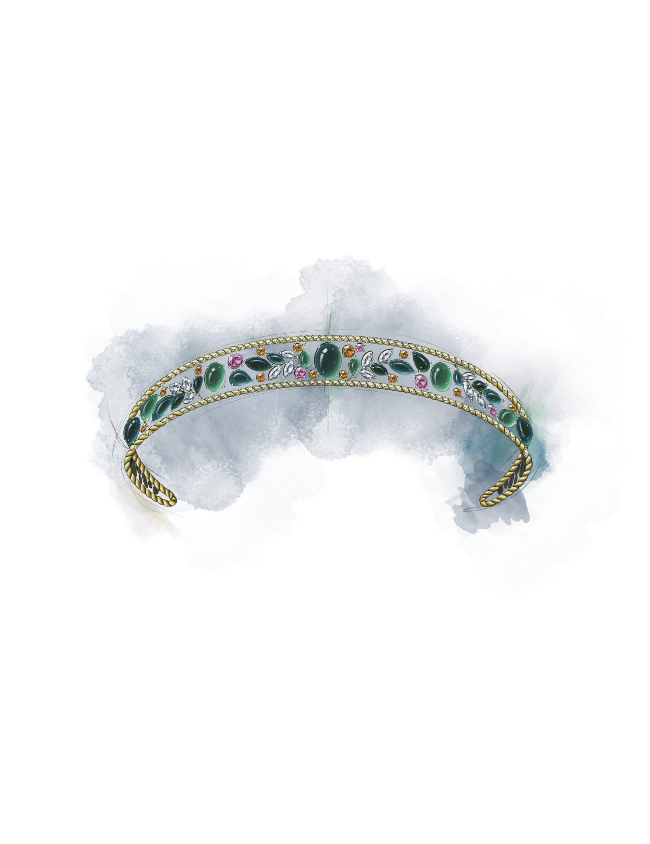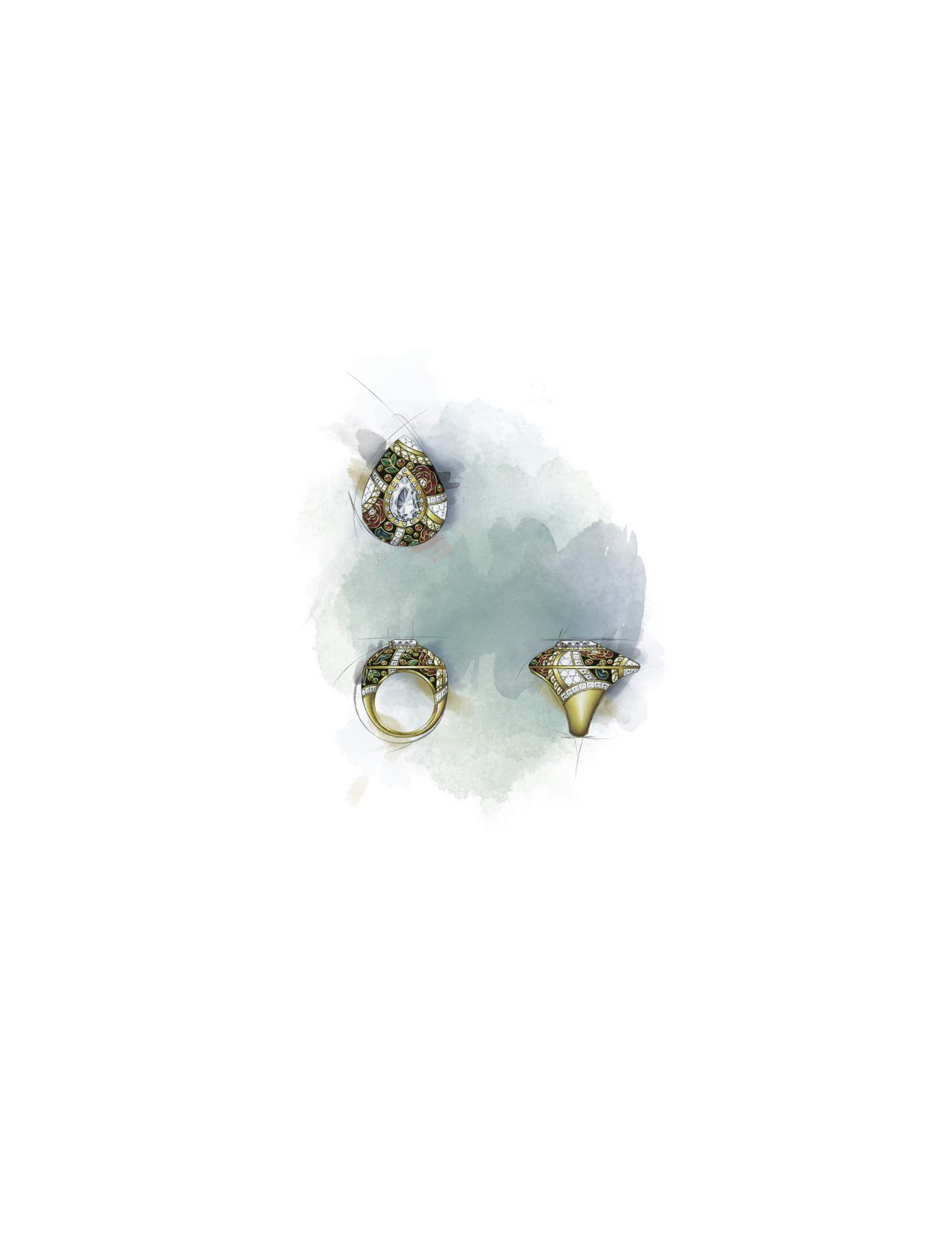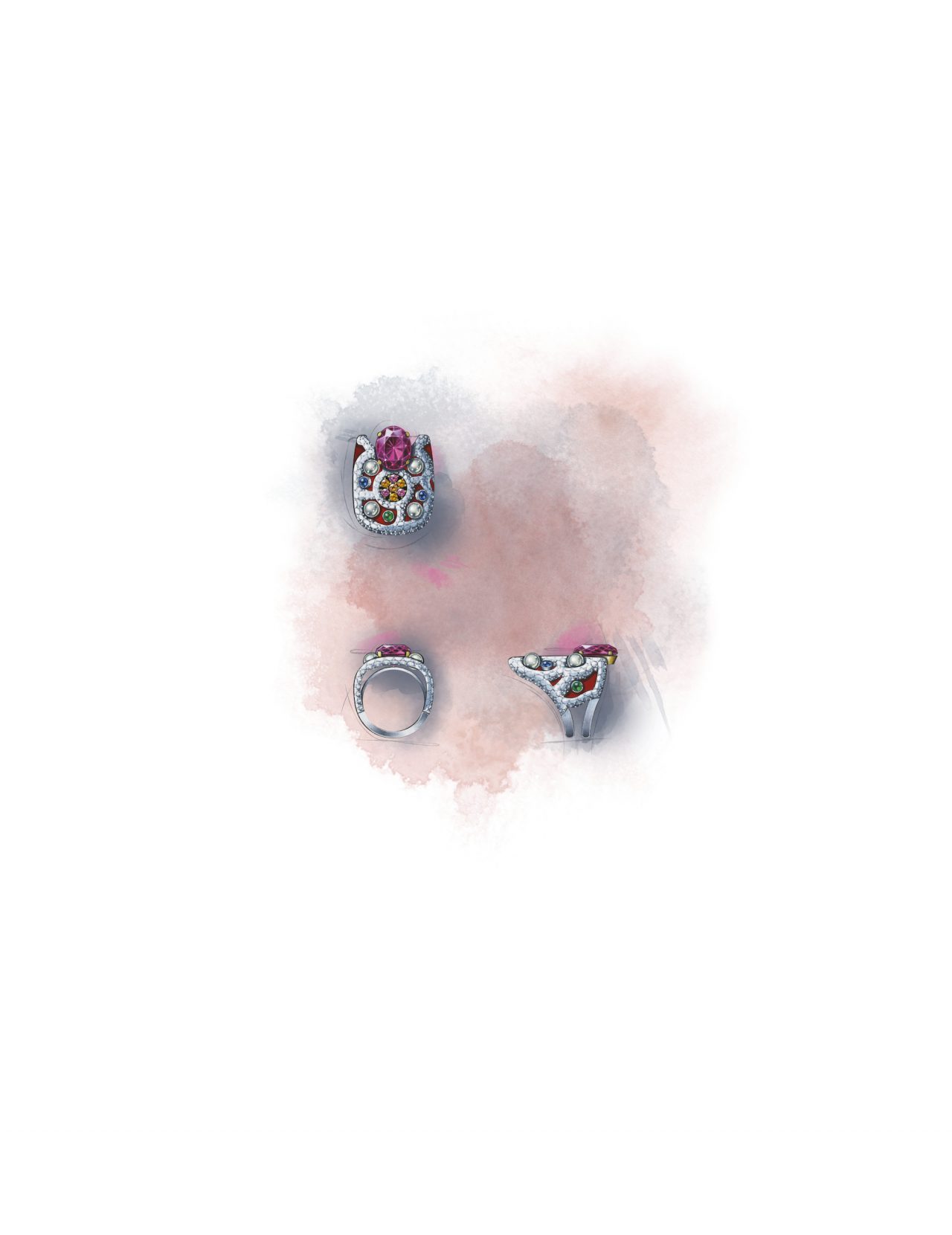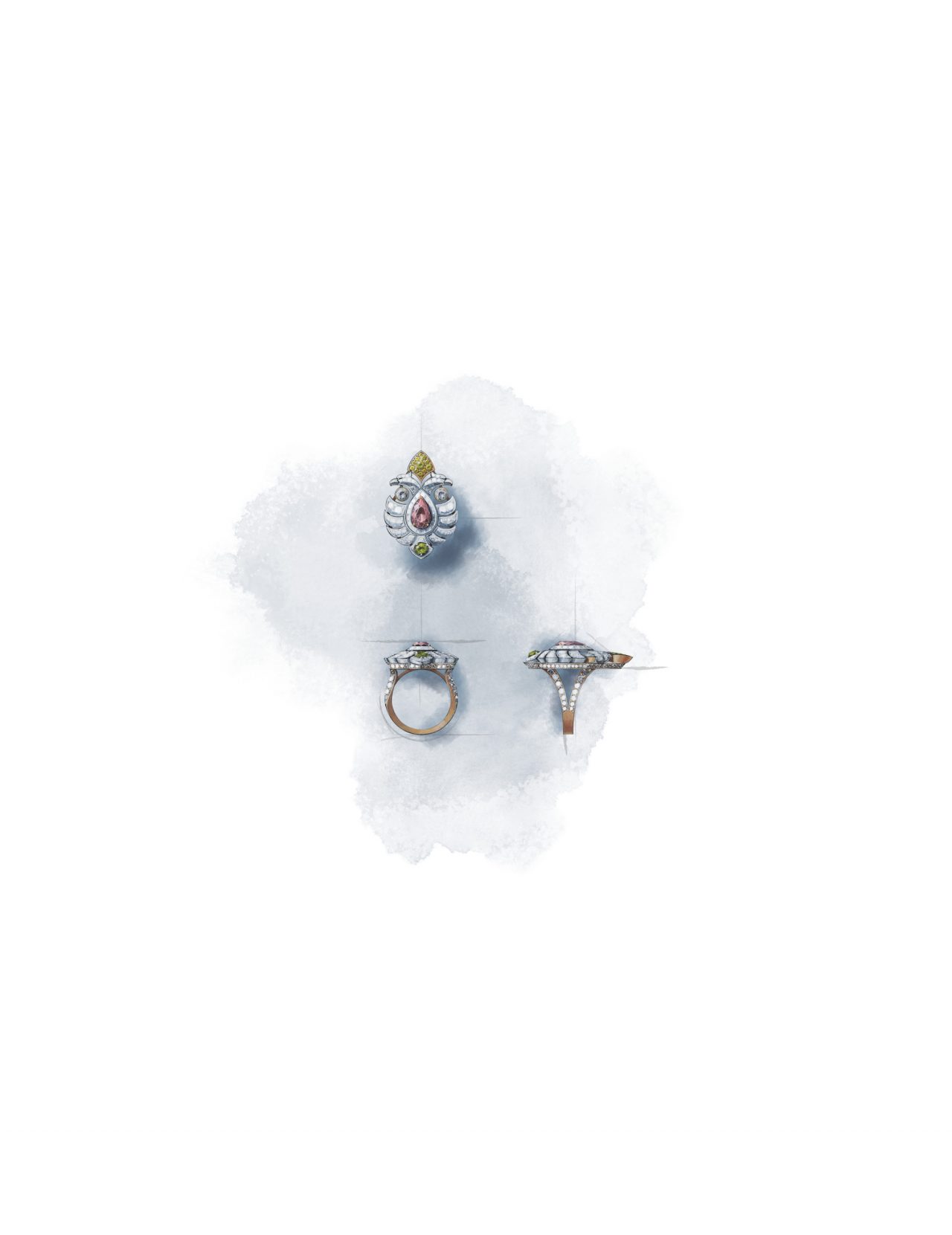 CHANEL ファインジュエリー クリエイション スタジオ ディレクターの Patrice Leguereau (パトリス・ルゲロー) が手がけた本コレクションでは、ロシアにオマージュを捧げた計69点の多彩なピースがラインナップ。ロシアの国章である双頭の鷲を主役に迎え、他にもルバシカの鮮やかな色彩の刺繍、ココシュニック(ベルベットのヘッドドレス)、スカーフ、伝統民族衣装のプリントなどロシアの多彩な芸術的装飾のモチーフが端正なデザインで登場している。