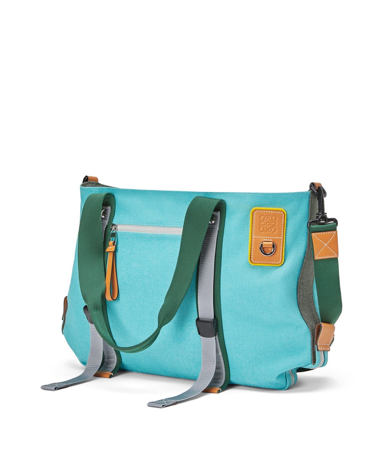 ふたりが顔を務める「Eye/LOEWE/Nature (アイ/ロエベ/ネイチャー)」2019年秋冬コレクションは、自然環境の豊かな色彩を引き立てる鮮やかな配色、パターンやプリントがふんだんに用いられている。注目したいのは、ターコイズカラーのキャンバス地とマルチカラーストライプのテキスタイル、2種類の新色カラーで展開される異素材ミックスのバッグだ。スカイブルーのスリングサックとトートバッグは、日本の職人が最新技術を用いてキャンバス地を手縫いしており、Loewe のクラフトに対する理解と日本の最先端のノウハウが融合された逸品となっている。