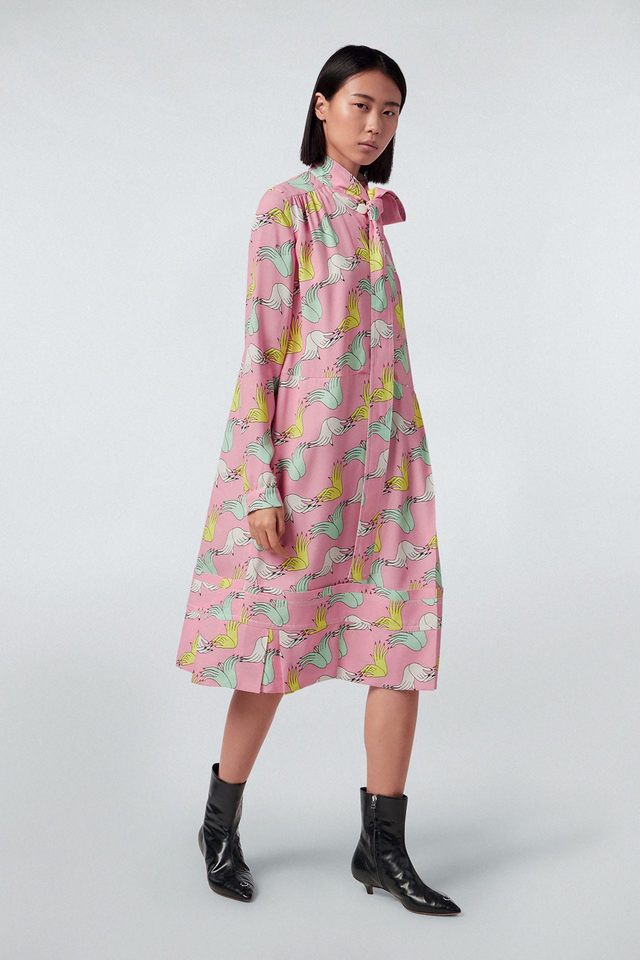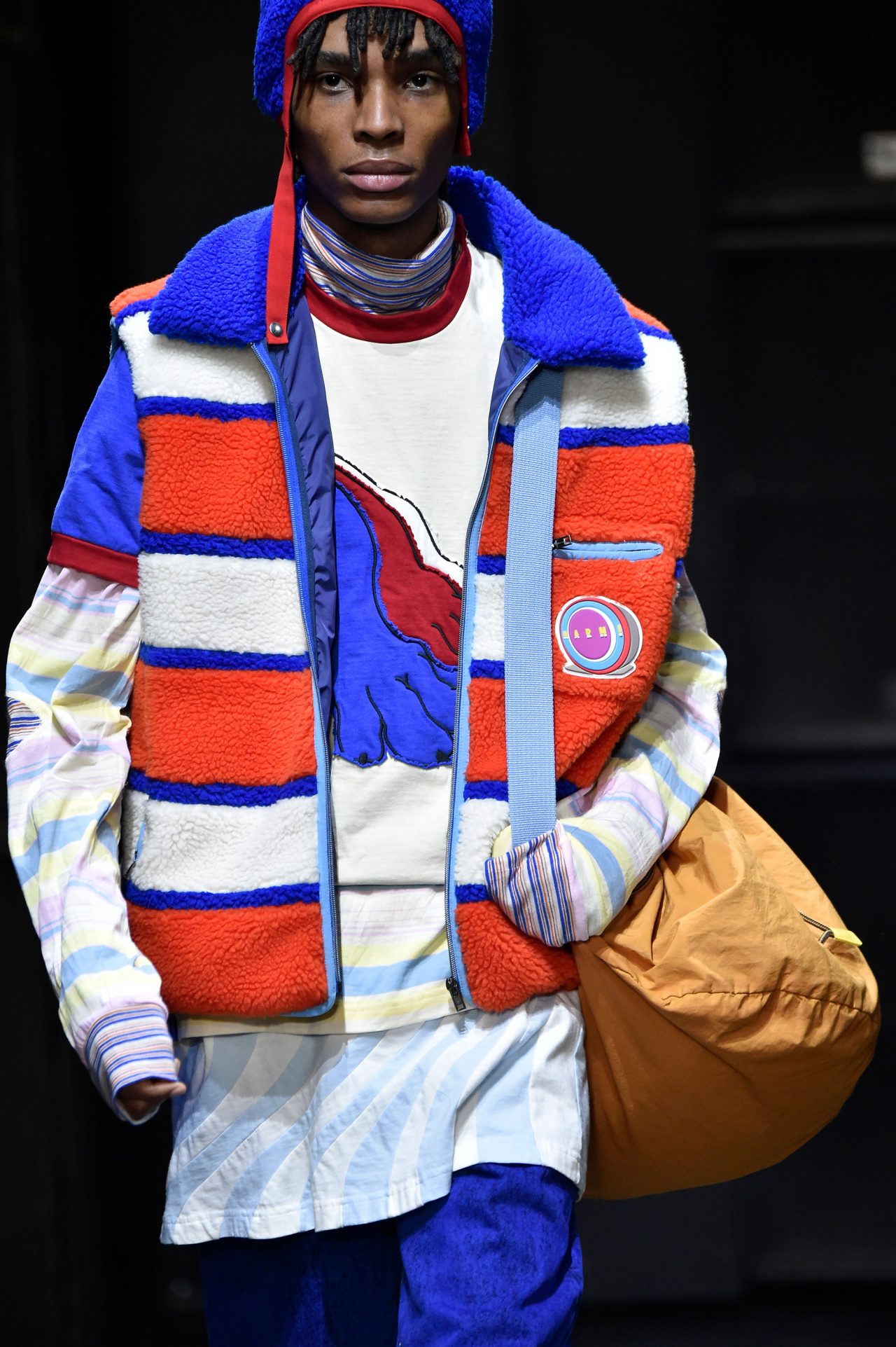 Bruno Bozzetto は自身の代表作の一つ、1976年の『ネオ・ファンタジア (原題:Allegro Non Troppo)』を彷彿とさせるようなサイケデリックなパターンやヘビ、恐竜、妖精といったモチーフをビッグサイズで MARNI のためにデザイン。Bruno Bozzetto 独特の世界観と MARNI の精神が融合したカラフルなコレクションに仕上げられている。