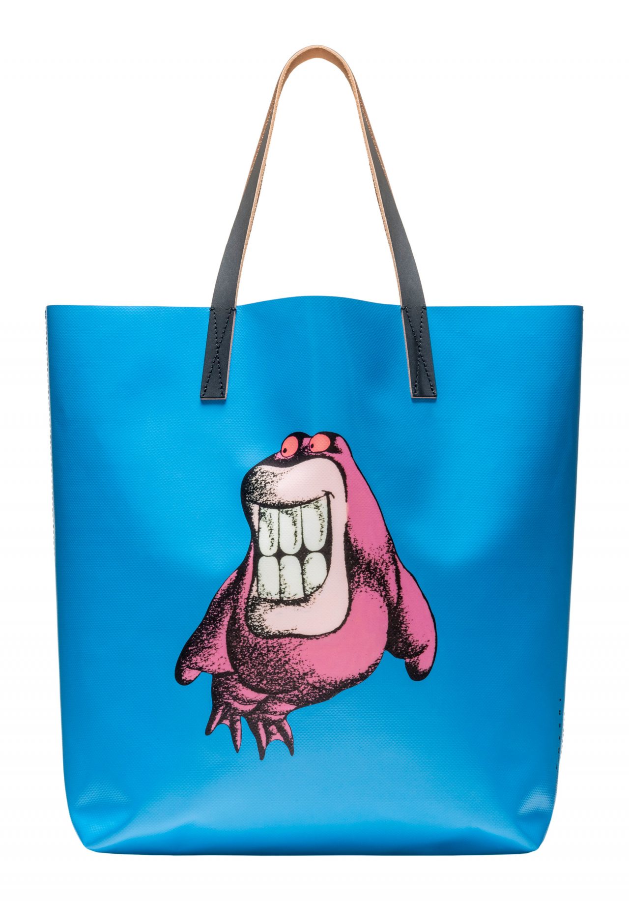 特に注目したいのは、Bruno Bozzetto がアイロニカルなキャラクターをそれぞれに描いたPVCトートバッグ。レザーハンドルとPVC、そして個性豊かなキャラクターたちのコントラストが面白いコレクターズアイテムだ。