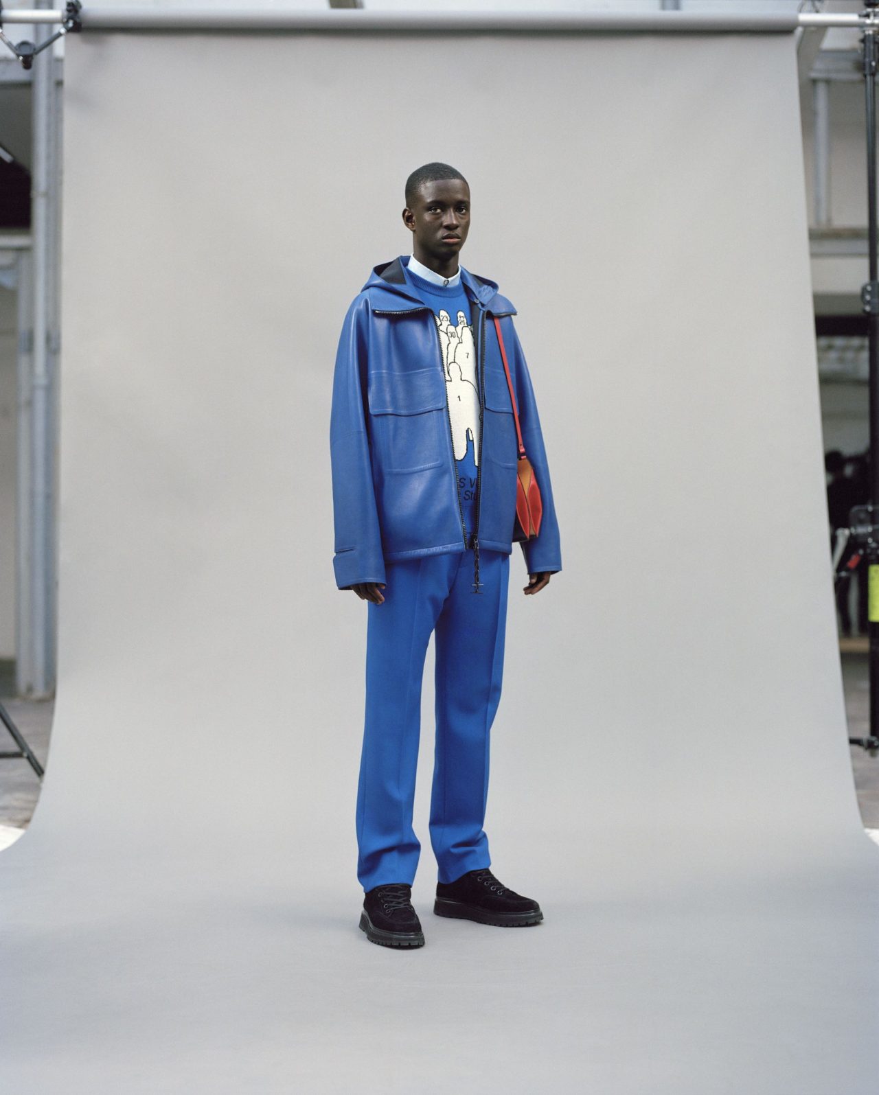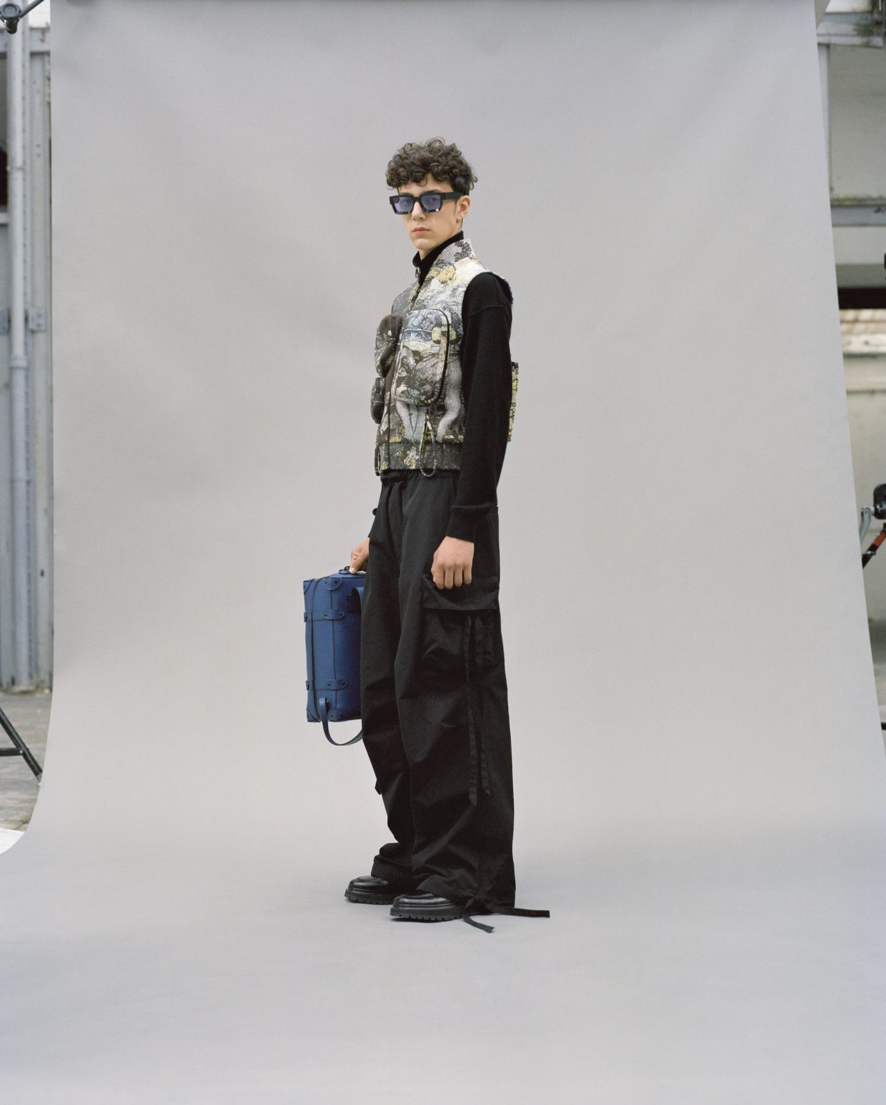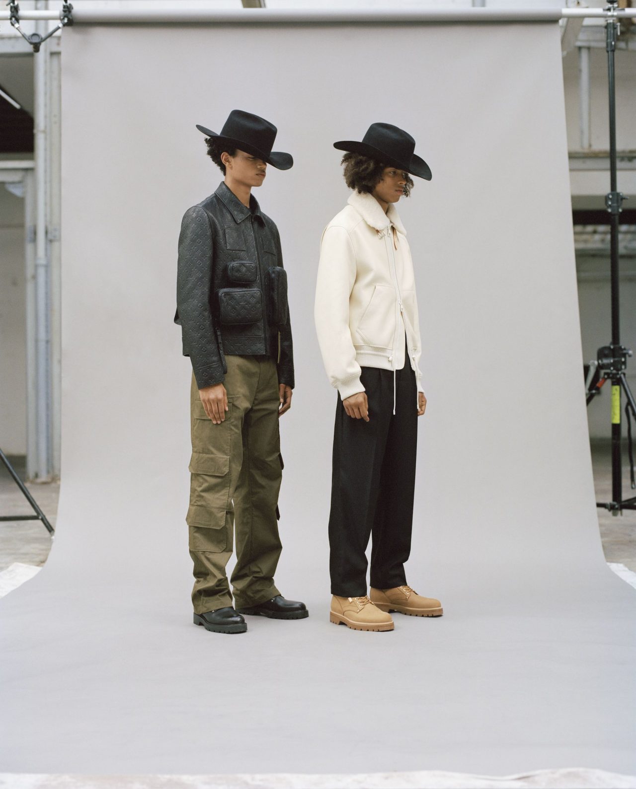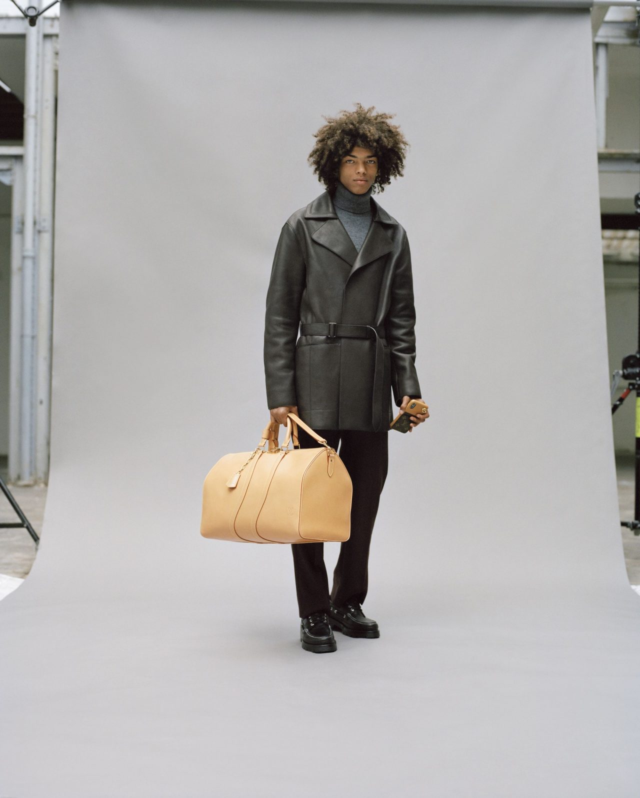 また、本コレクションを印象づけるのはユニークなテキスタイルの数々。エレガントに落とし込まれた砂漠風カモフラージュや幻想的な木目調のプリント、ストリートウェアのトレードマークであるチェーンもプリントになって登場。ラファエロの絵画から作られたコラージュのジャカード装飾が施されたジレやトレンチコート、ボンバージャケットなどもお目見えしている。そして見逃せないのが、メゾンのアーカイヴに所蔵されていたというエピ・レザーのカラフルなパッチワークから着想を得たグレイン加工を施したトランスペレントなバッグ。他にも、ラバーソールが存在感を放つワークブーツやフェルトのカウボーイハットなど定番アイテムながらも Virgil Abloh の感性が光るアクセサリーが目白押しだ。