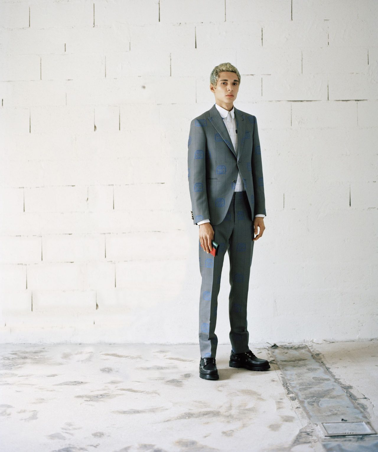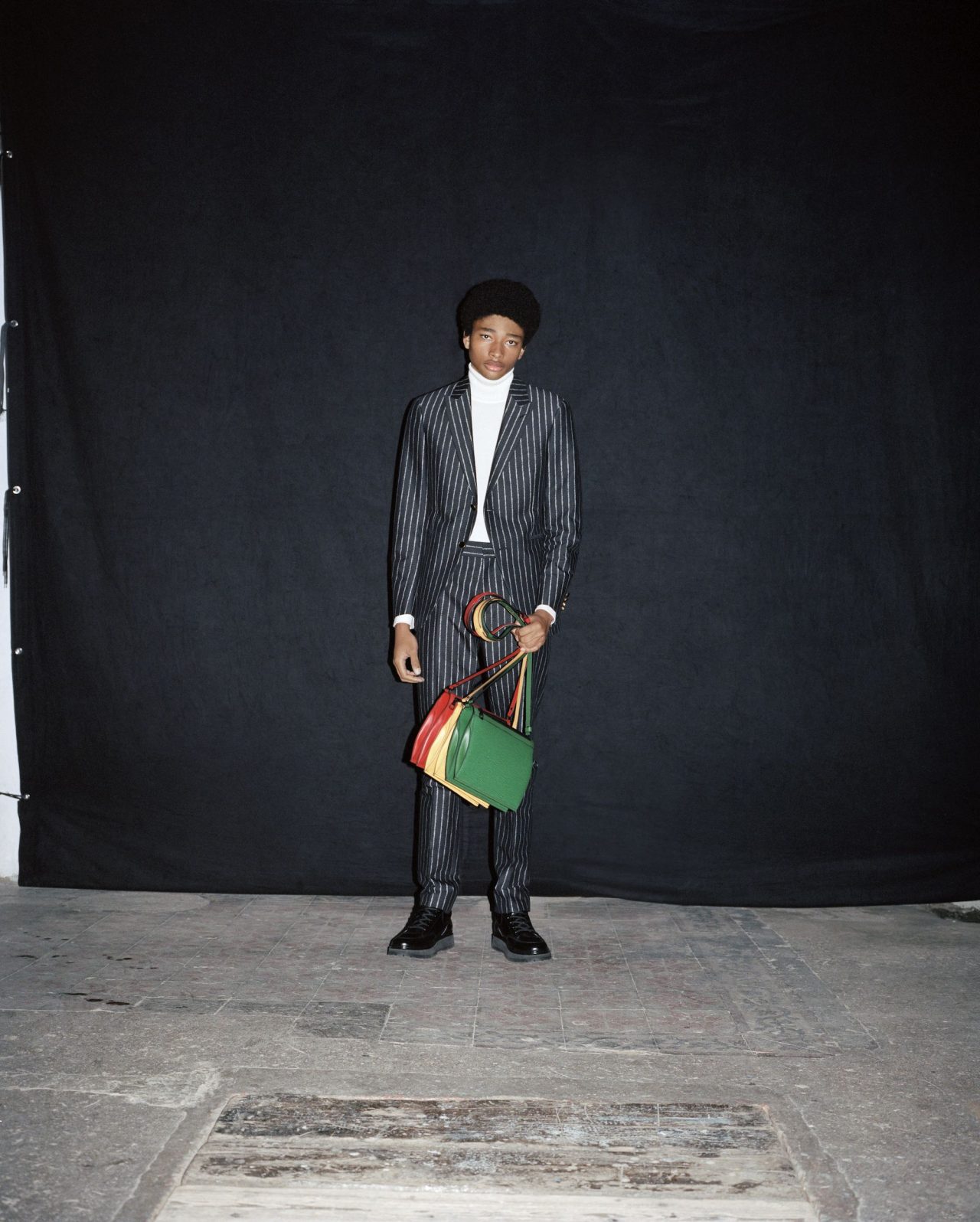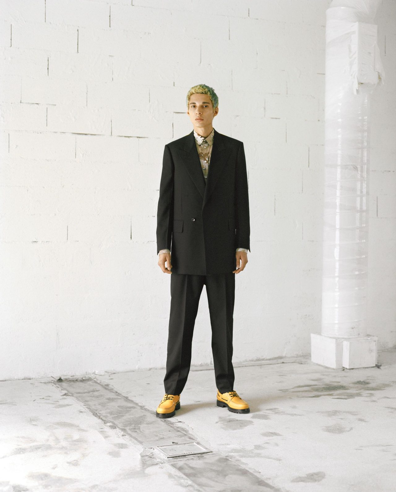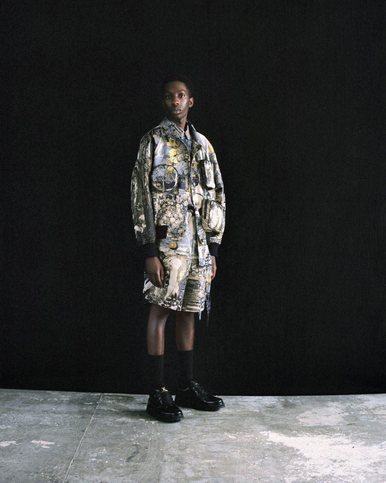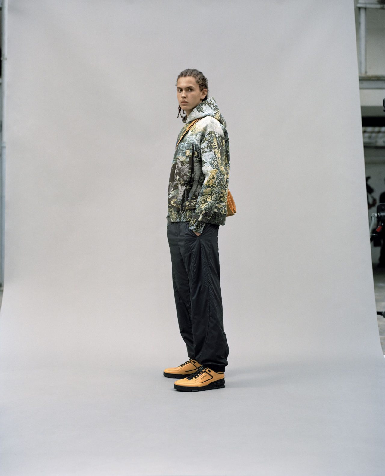 また、本コレクションを印象づけるのはユニークなテキスタイルの数々。エレガントに落とし込まれた砂漠風カモフラージュや幻想的な木目調のプリント、ストリートウェアのトレードマークであるチェーンもプリントになって登場。ラファエロの絵画から作られたコラージュのジャカード装飾が施されたジレやトレンチコート、ボンバージャケットなどもお目見えしている。そして見逃せないのが、メゾンのアーカイヴに所蔵されていたというエピ・レザーのカラフルなパッチワークから着想を得たグレイン加工を施したトランスペレントなバッグ。他にも、ラバーソールが存在感を放つワークブーツやフェルトのカウボーイハットなど定番アイテムながらも Virgil Abloh の感性が光るアクセサリーが目白押しだ。