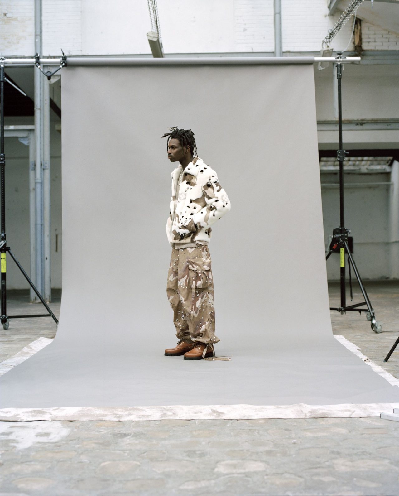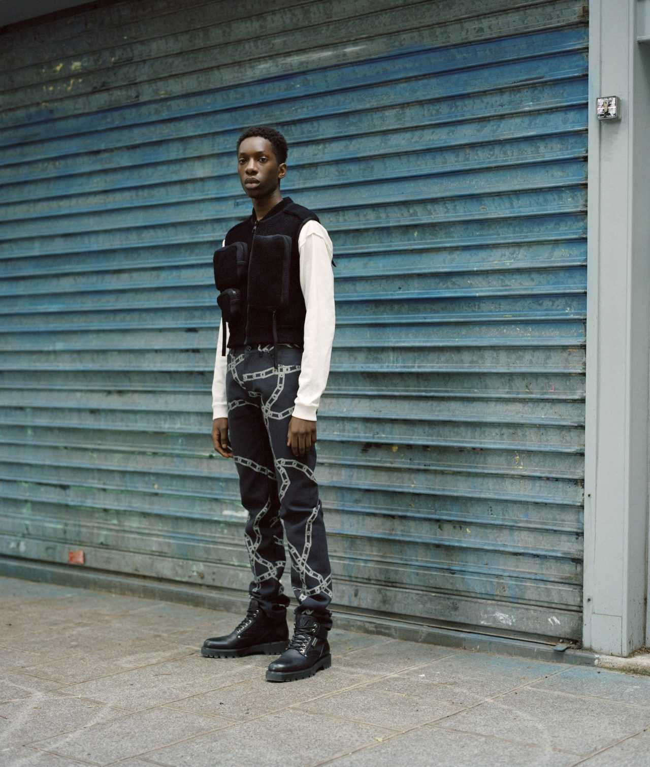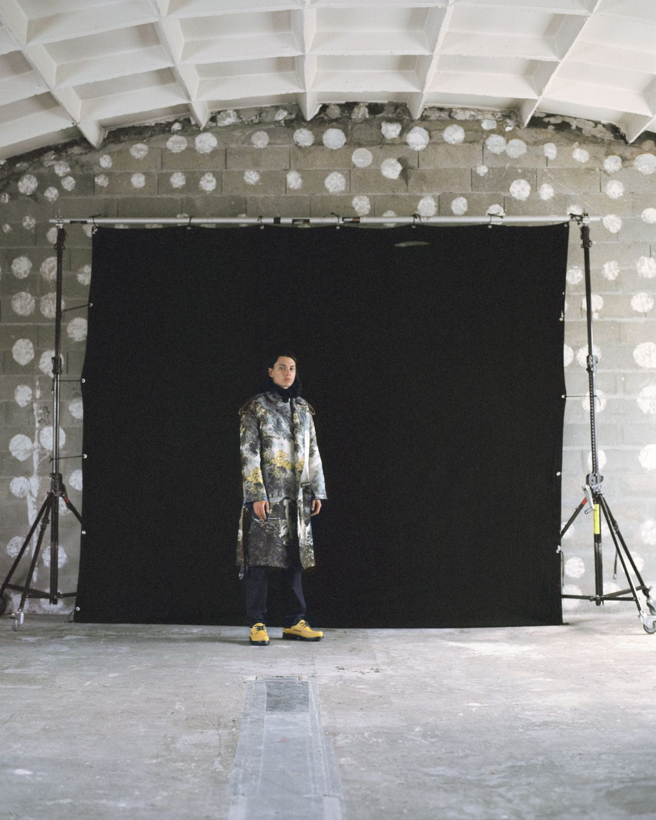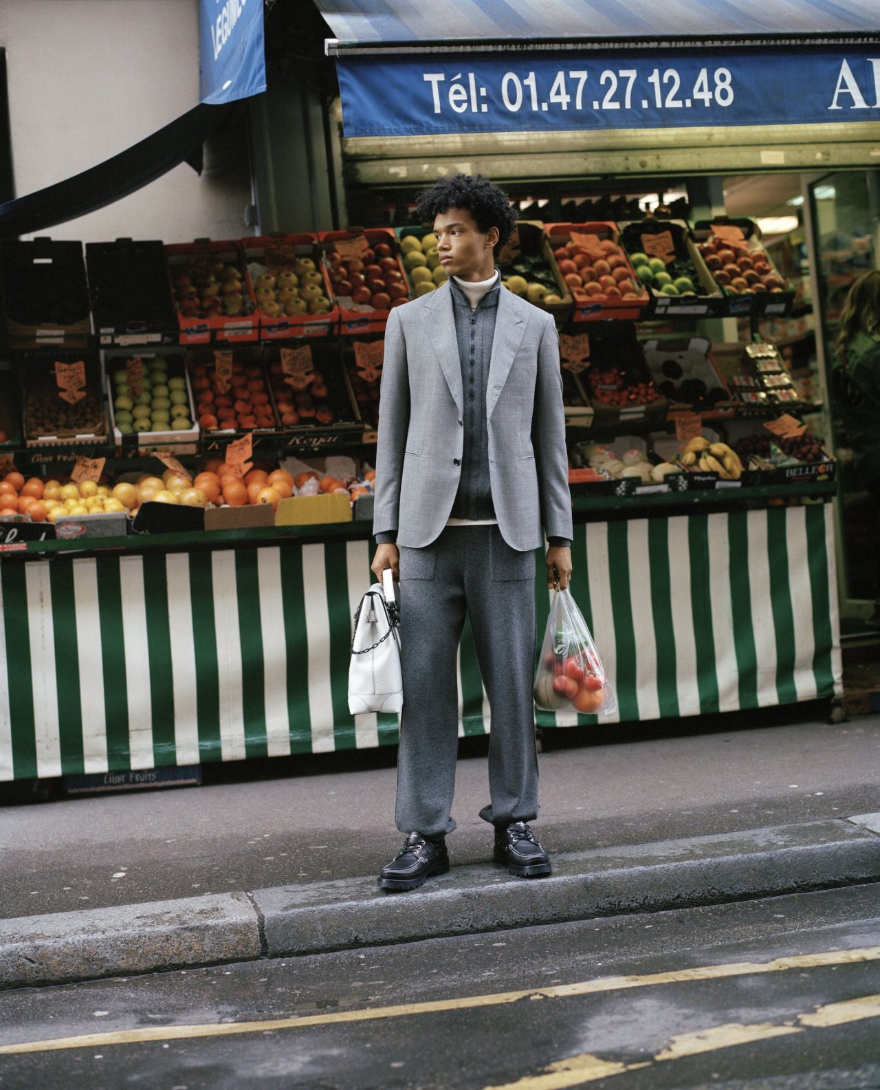 また、本コレクションを印象づけるのはユニークなテキスタイルの数々。エレガントに落とし込まれた砂漠風カモフラージュや幻想的な木目調のプリント、ストリートウェアのトレードマークであるチェーンもプリントになって登場。ラファエロの絵画から作られたコラージュのジャカード装飾が施されたジレやトレンチコート、ボンバージャケットなどもお目見えしている。そして見逃せないのが、メゾンのアーカイヴに所蔵されていたというエピ・レザーのカラフルなパッチワークから着想を得たグレイン加工を施したトランスペレントなバッグ。他にも、ラバーソールが存在感を放つワークブーツやフェルトのカウボーイハットなど定番アイテムながらも Virgil Abloh の感性が光るアクセサリーが目白押しだ。