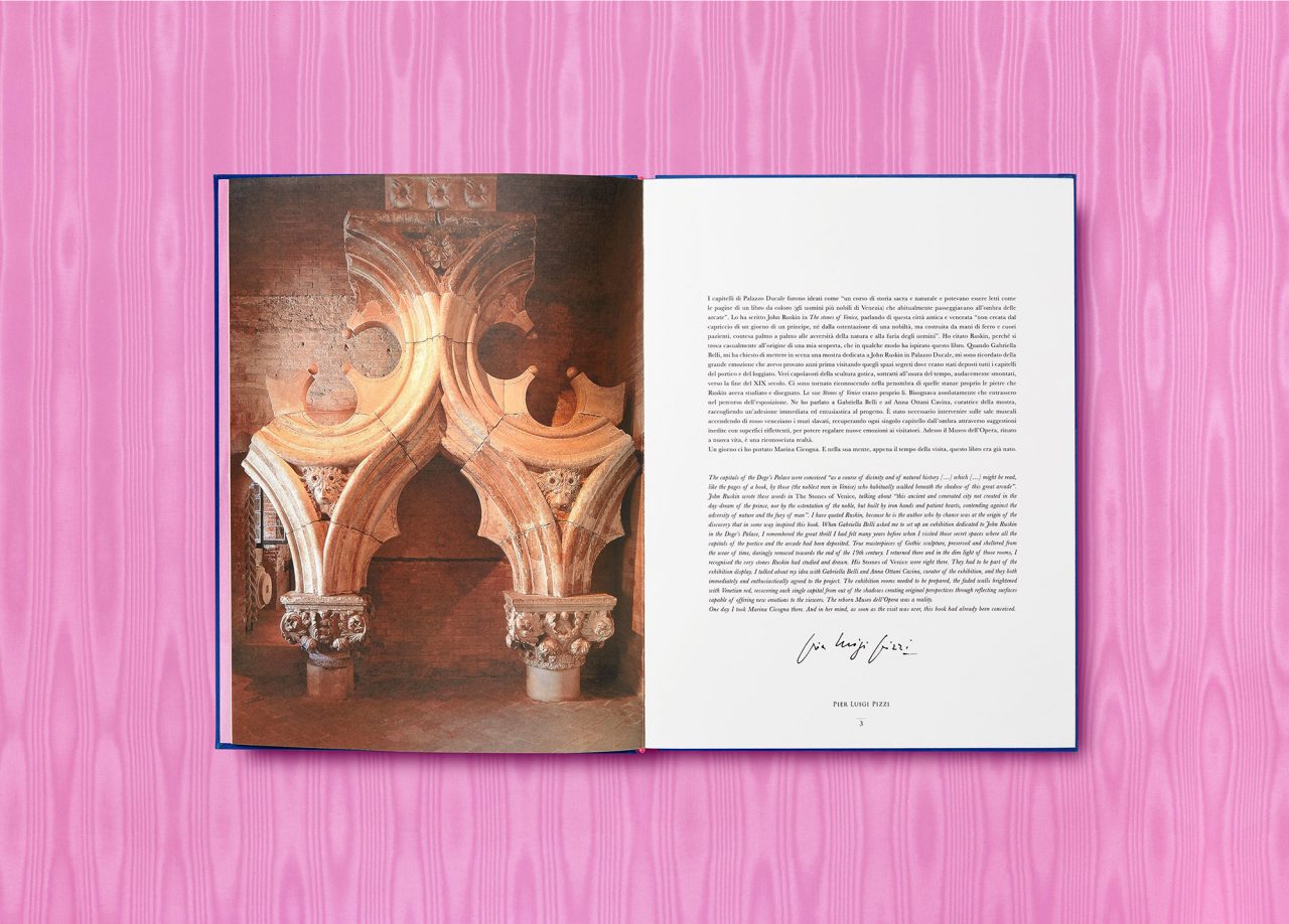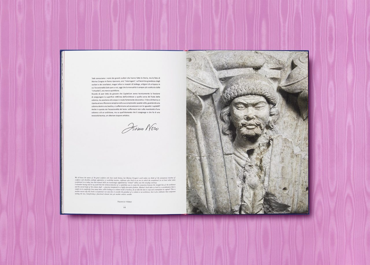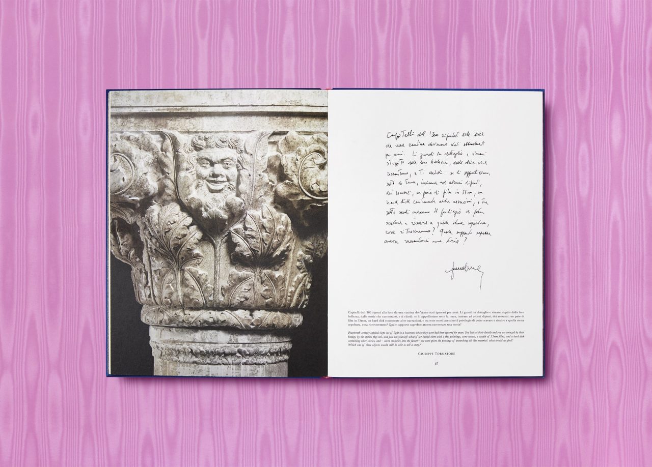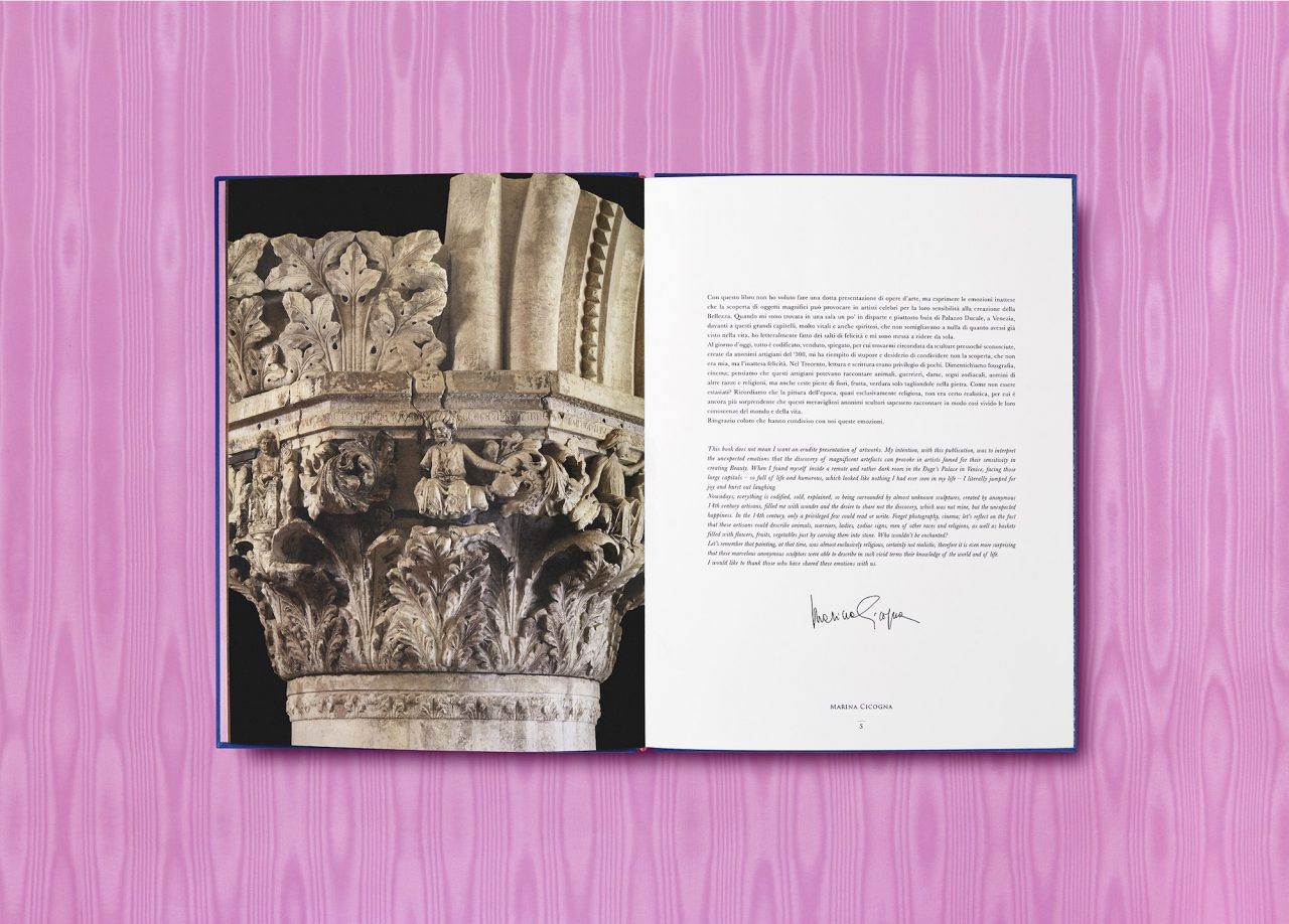 ヴィクトリア期を代表する美術評論家である John Ruskin (ジョン・ラスキン) がかつて「冷酷な支配と忍耐強い心によって、自然の過酷さと人間の激しい感情を克服しつつ刻まれた」と評した柱頭は、1世紀以上の時を経て映画監督の Pierluigi Martini (ピエル・ルイジ・ピッツィ) によって再拝見され、Marina Cicogna に引き継がれたことが本プロジェクトの発端。Marina Cicogna が CameraphotoArt (カメラフォトアート) のアーカイブから選んだ写真と彼女自身が撮影した写真が収録され、Marina Abramovic (マリーナ・アブラモヴィッチ) や Diane von Fürstenberg (ダイアン・フォン・ファステンバーグ)、Salma Hayek (サルマ・ハエック)、Martin Parr (マーティン・パー)、そして Valentino (ヴァレンティノ) といった世界の著名人が寄稿している。