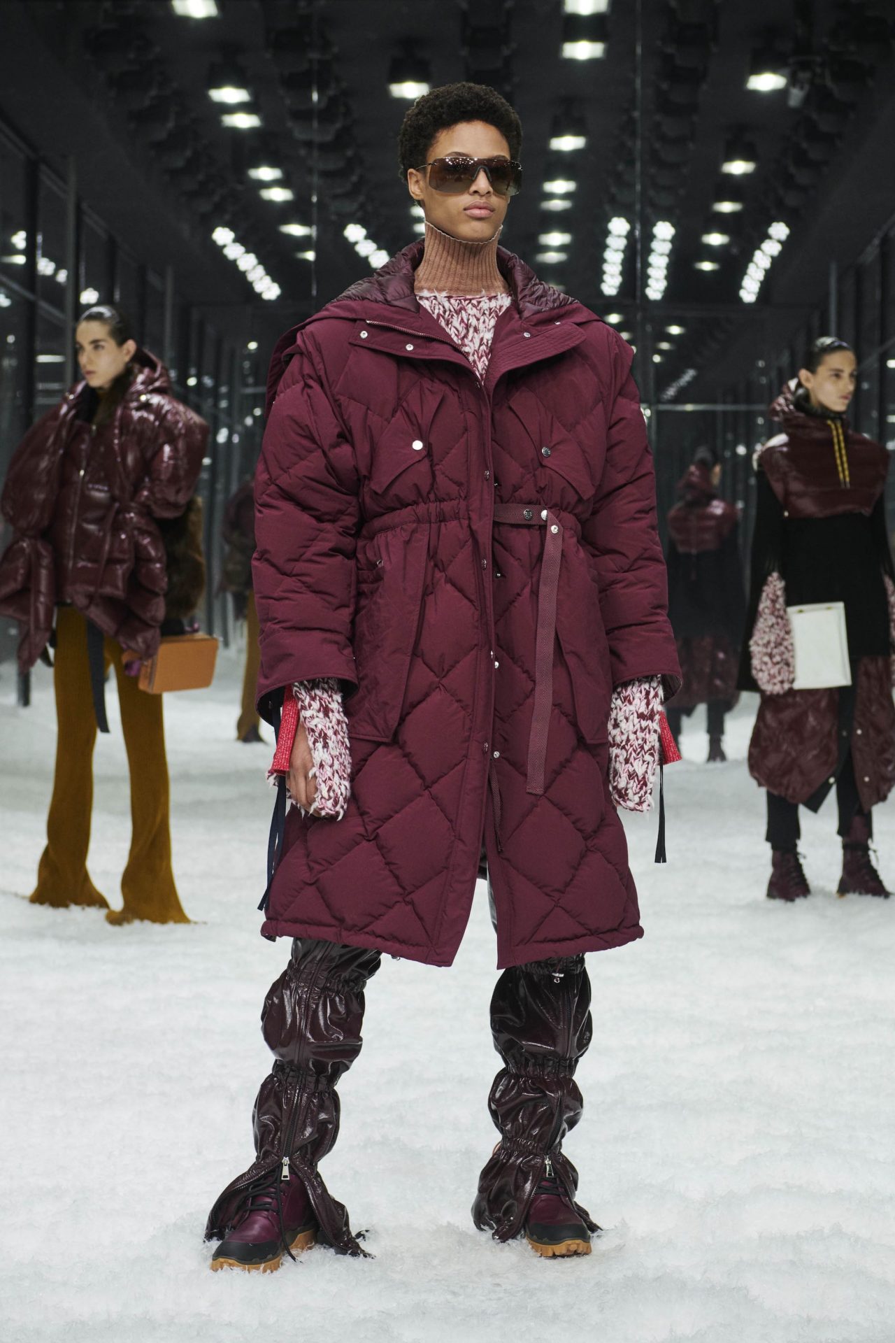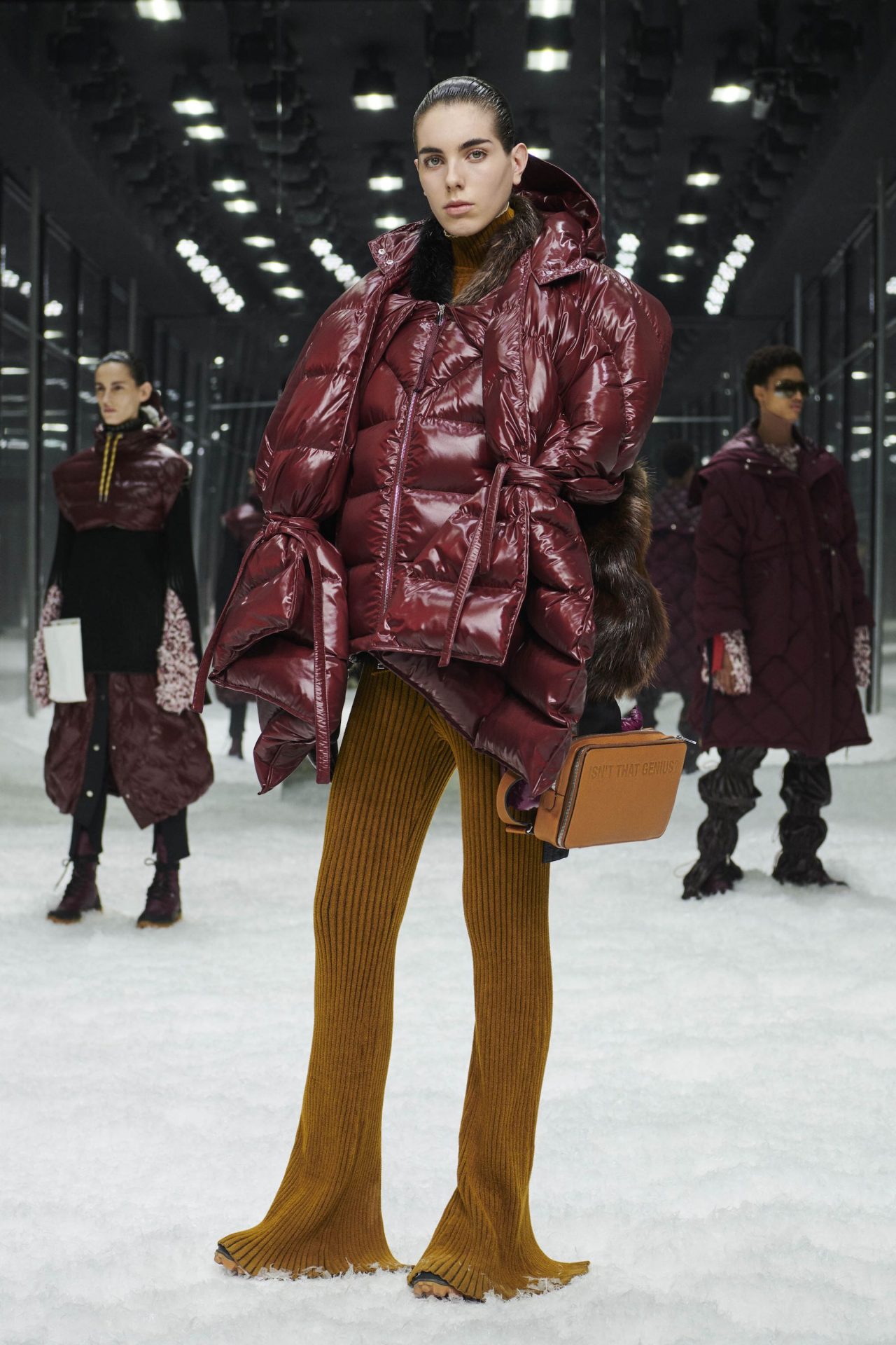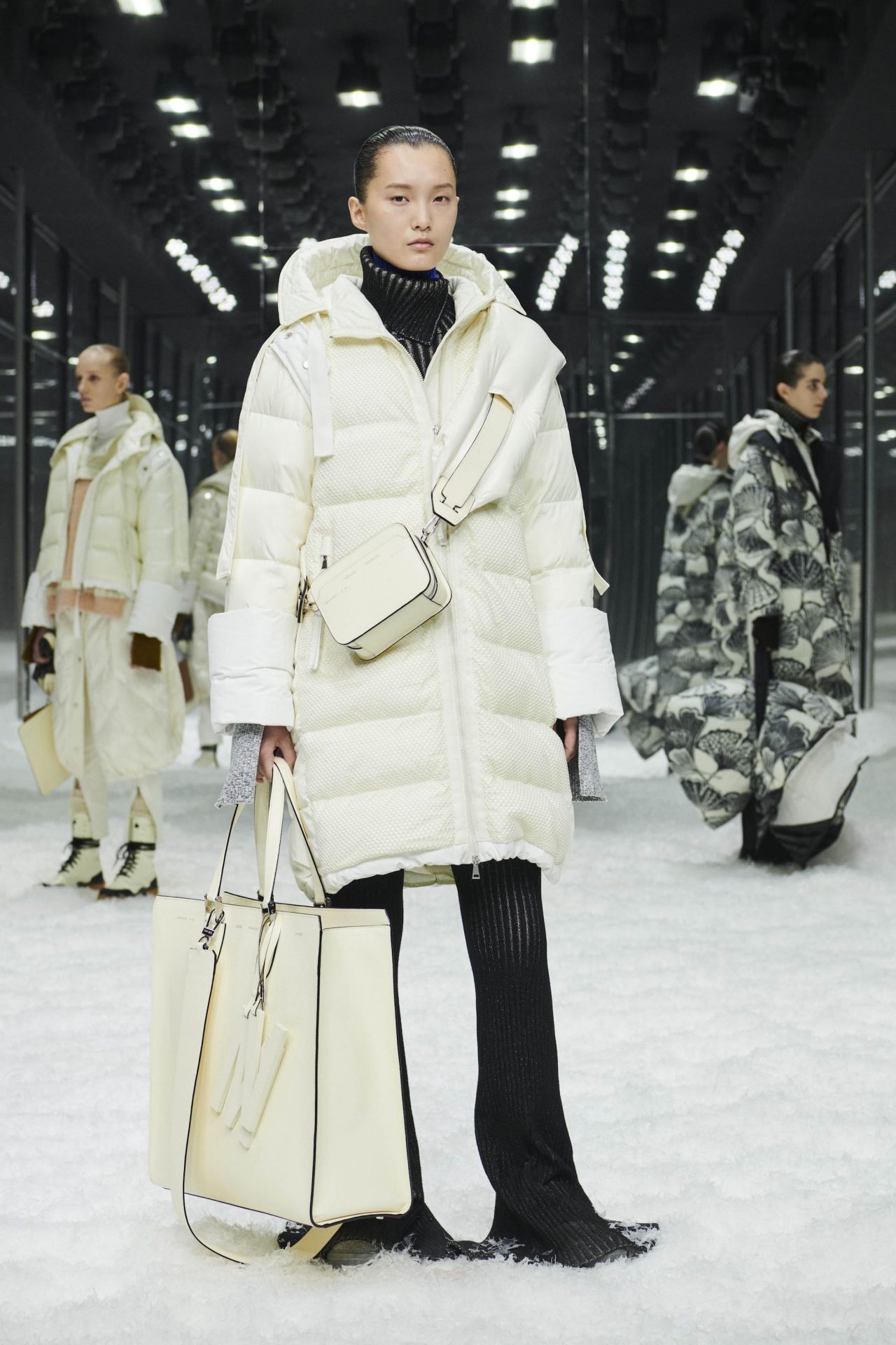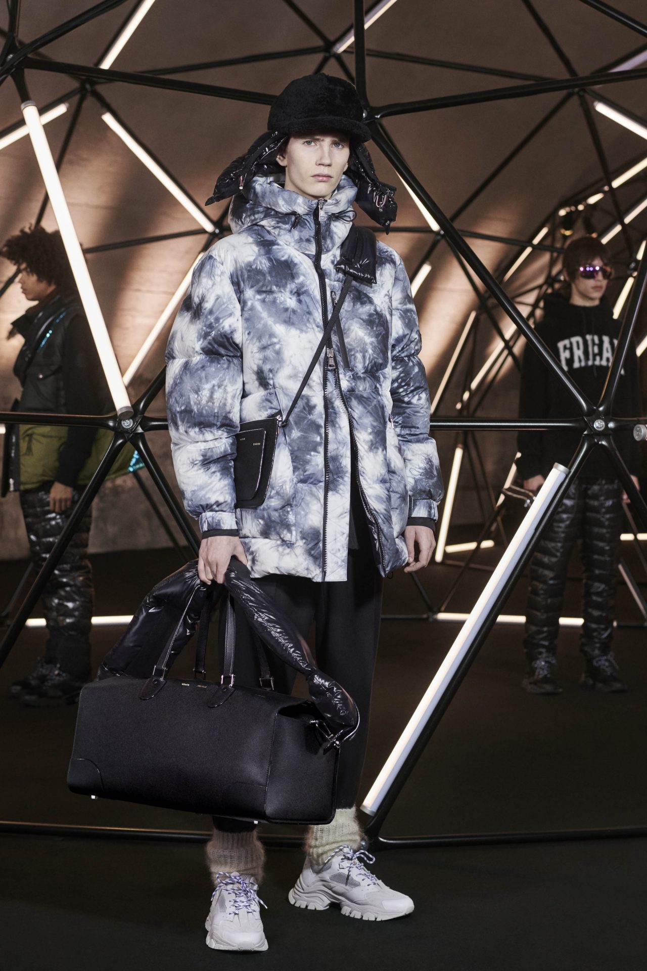 Veronica Leoni のウィメンズコレクションでは、ハイテク素材や実用的なシェイプをレイヤリングし、多様性の強さを表現。ナイロンにブークレウールやフィッシュネット、ブリーチタータン、イチョウ柄のマクロプリントといったユニークなテキスタイルを見事融合させ、存在感を放ちながらも自由に着こなしが楽しめるコレクションに仕上げられている。
