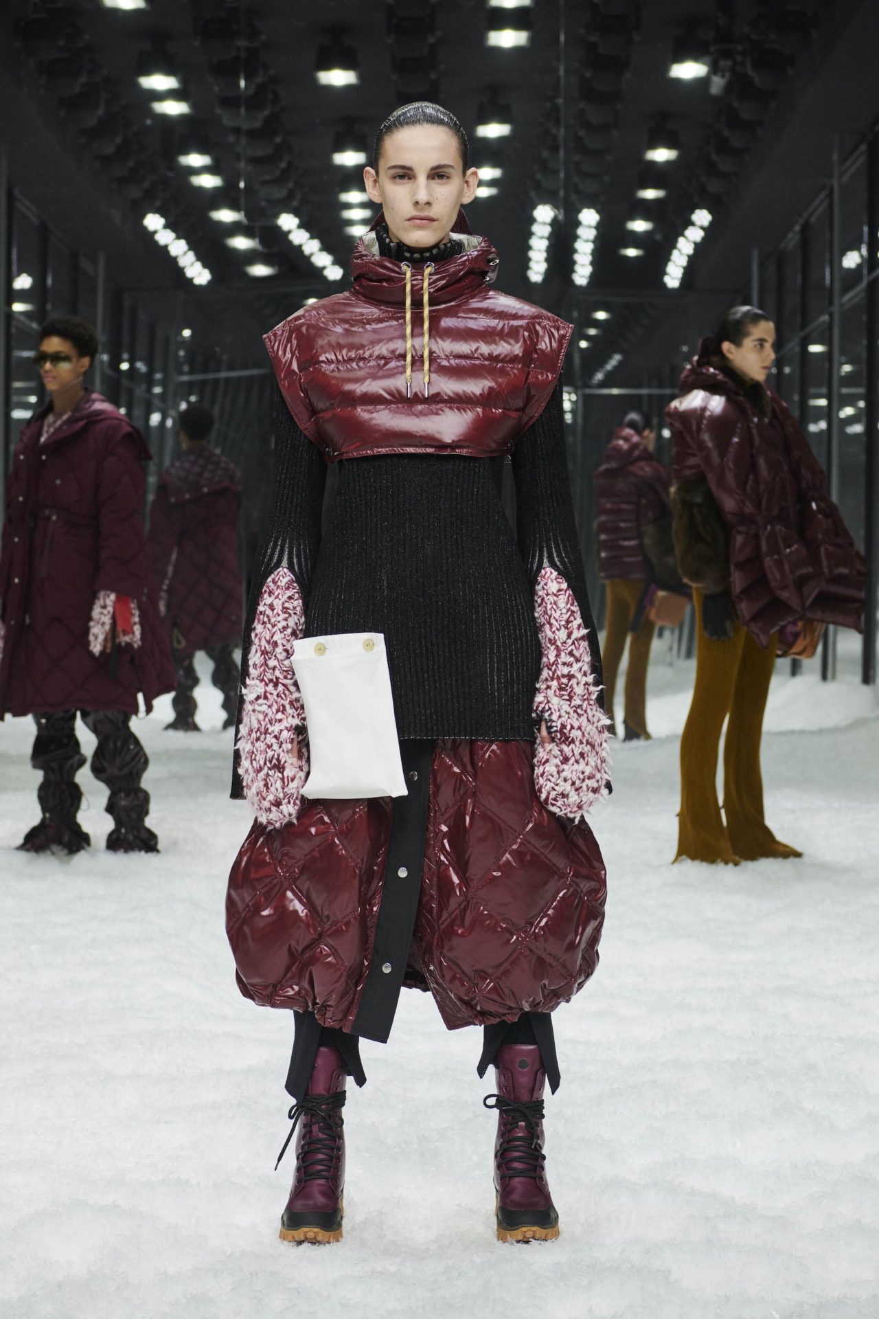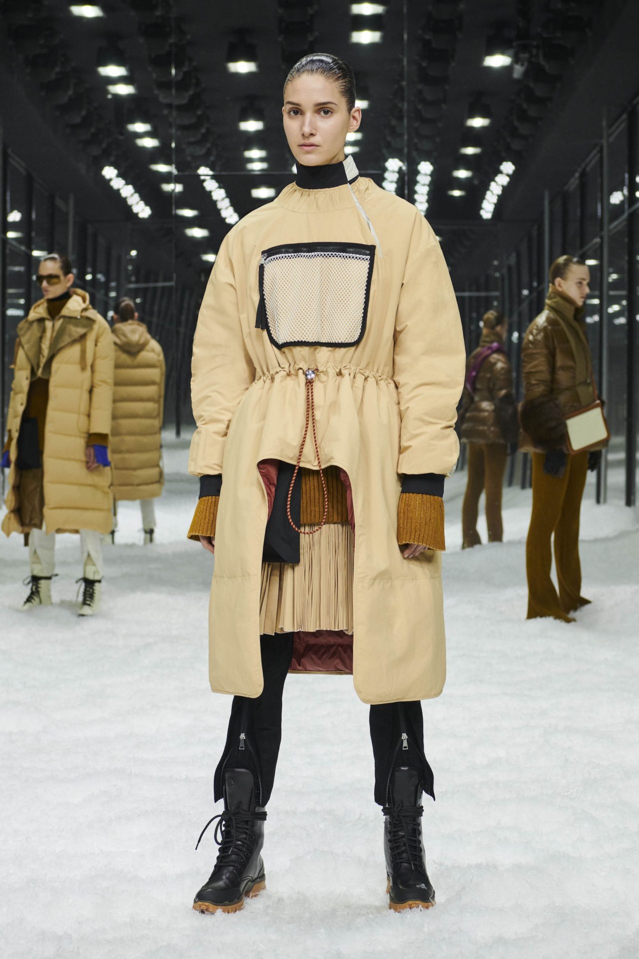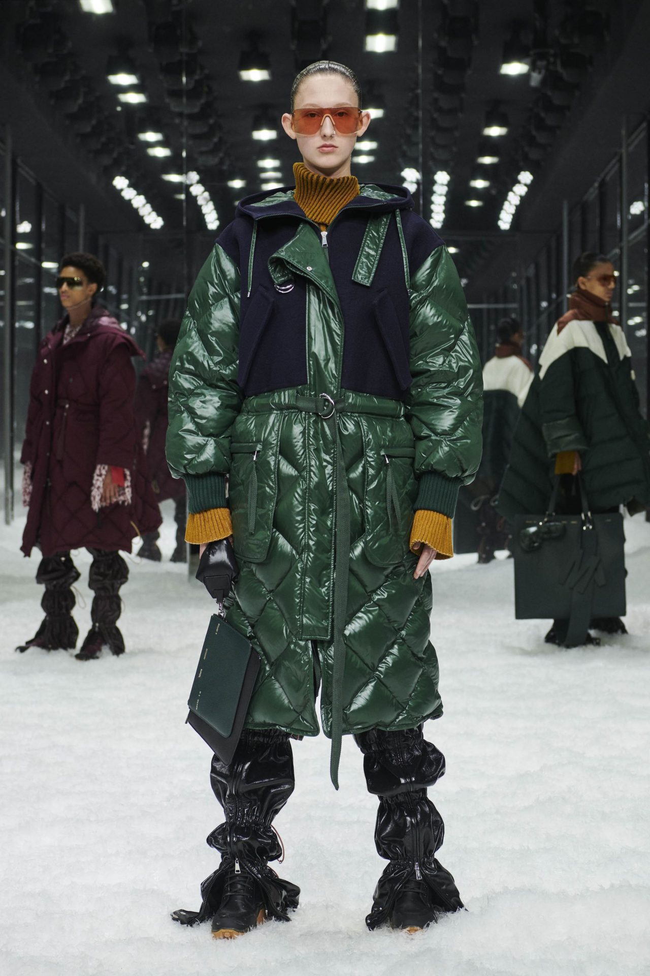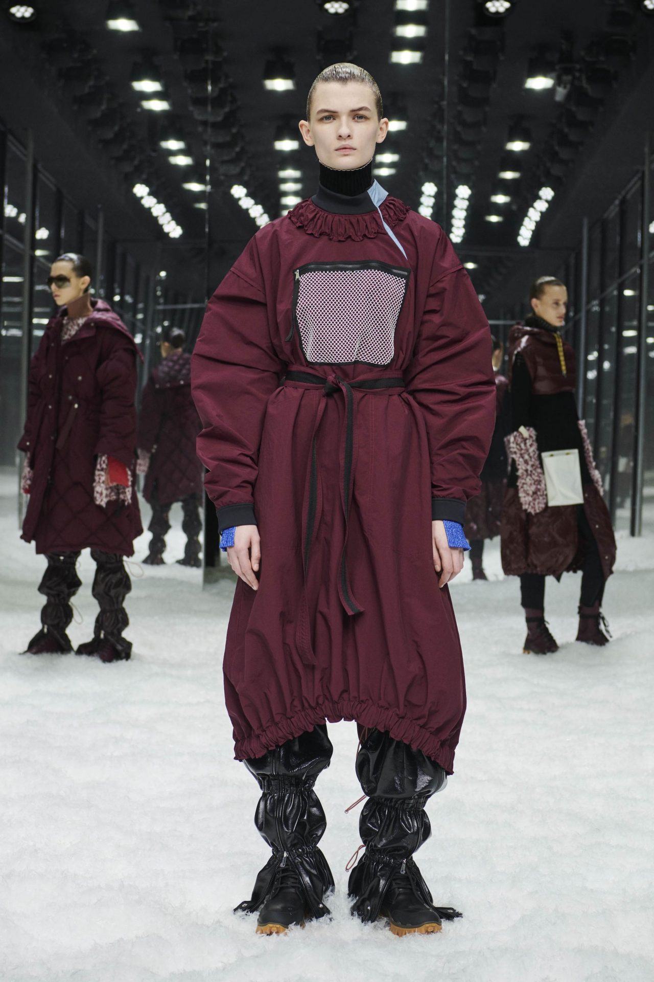 Veronica Leoni のウィメンズコレクションでは、ハイテク素材や実用的なシェイプをレイヤリングし、多様性の強さを表現。ナイロンにブークレウールやフィッシュネット、ブリーチタータン、イチョウ柄のマクロプリントといったユニークなテキスタイルを見事融合させ、存在感を放ちながらも自由に着こなしが楽しめるコレクションに仕上げられている。