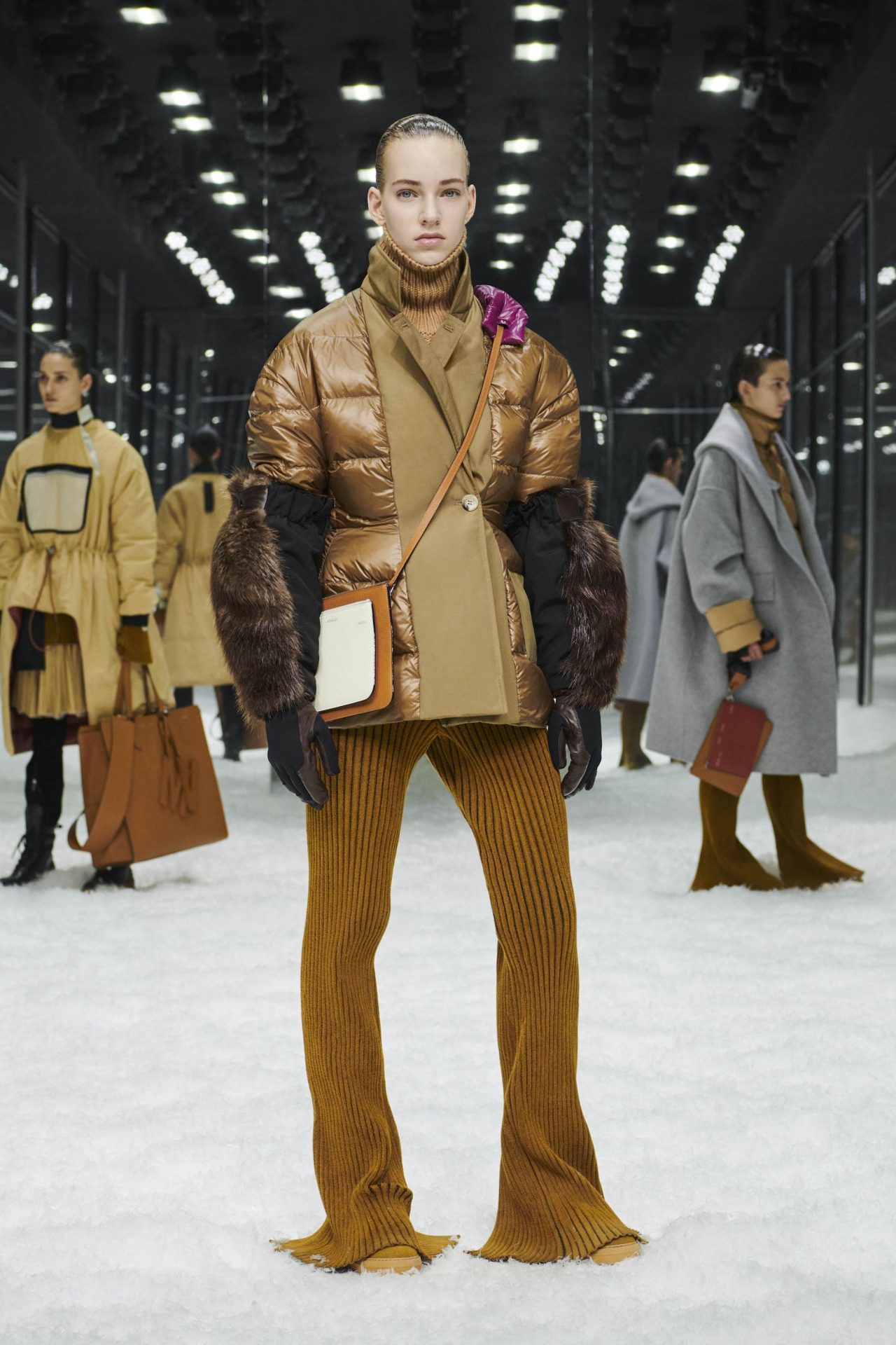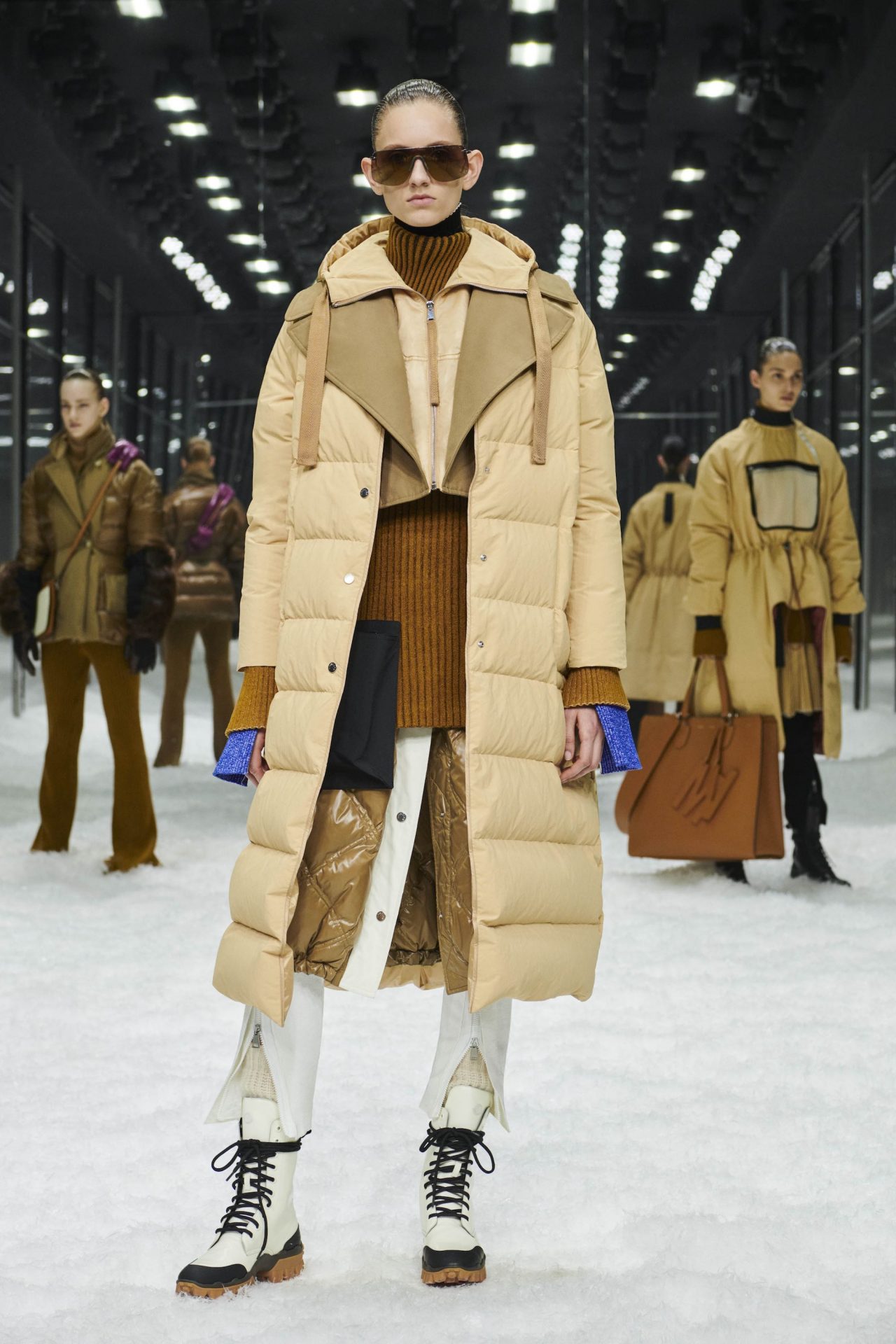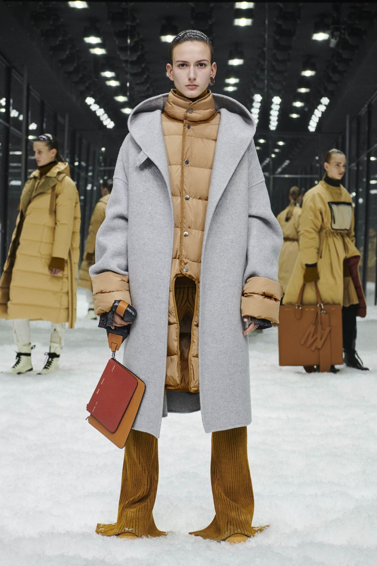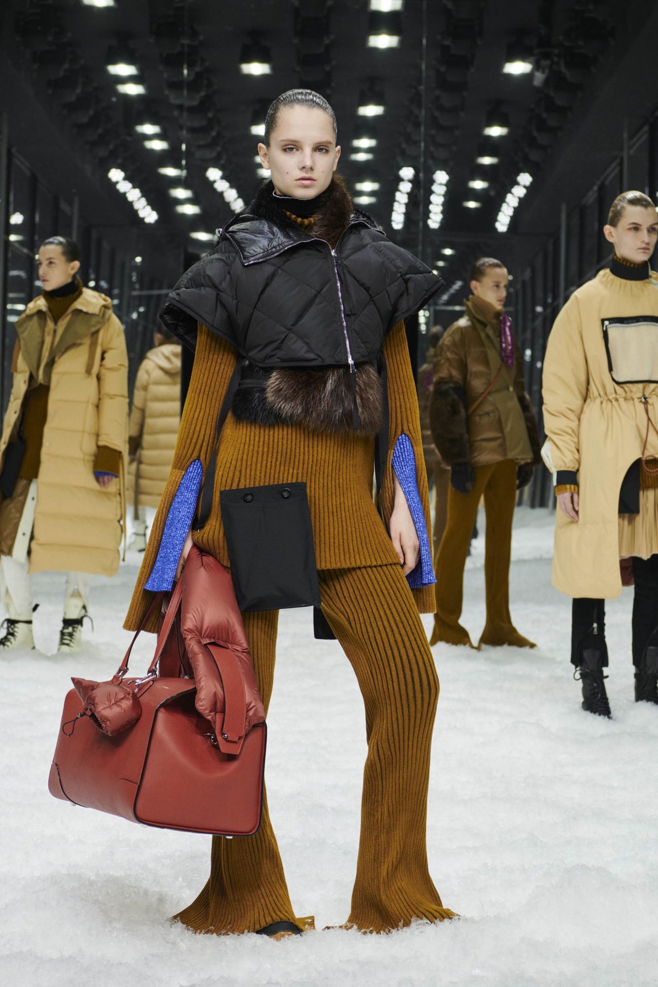 Veronica Leoni のウィメンズコレクションでは、ハイテク素材や実用的なシェイプをレイヤリングし、多様性の強さを表現。ナイロンにブークレウールやフィッシュネット、ブリーチタータン、イチョウ柄のマクロプリントといったユニークなテキスタイルを見事融合させ、存在感を放ちながらも自由に着こなしが楽しめるコレクションに仕上げられている。