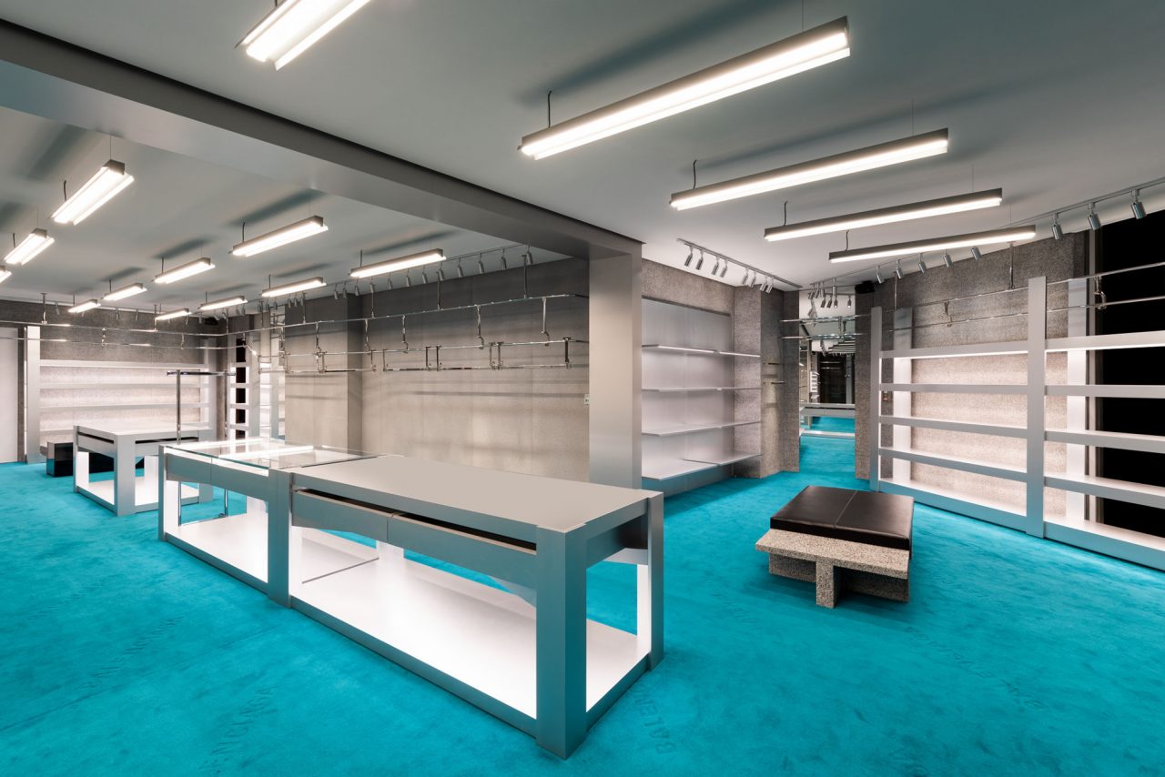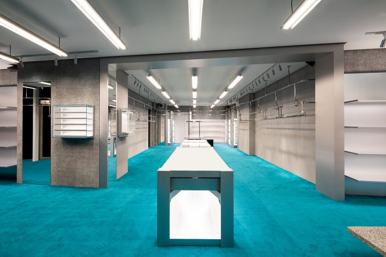ワールドワイドで展開する建築プロジェクトに沿って、ストアデザインはアーティスティック・ディレクターの Demna Gvasalia (デムナ・ヴァザリア) によるブランドのテーマ、特にインダストリアルとサービスを重視した環境を代表するエレメントを融合させるというアイデアを反映。オープンエアなオフィスとワーキングウェアハウスを参考にし立地特殊性を活かしたレイアウトで、床一面に敷かれたティール色でロゴが施されたカーペットが印象的だ。