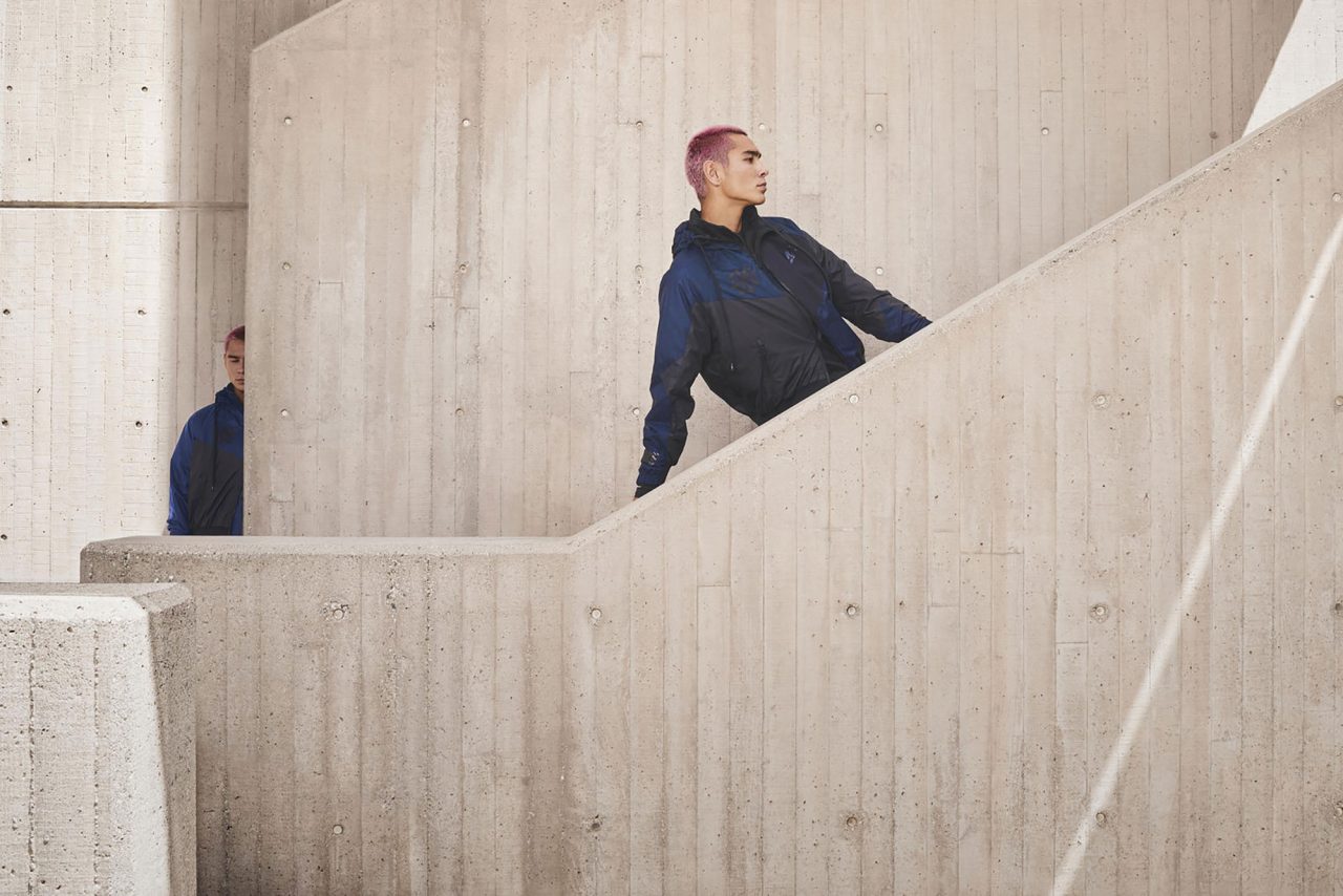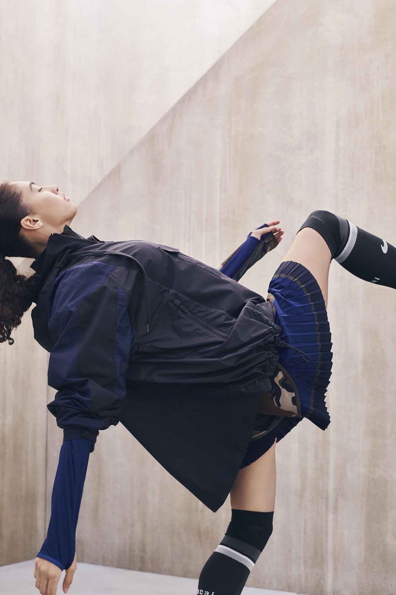 今回はランニングウェアにミリタリーの要素を落とし込んだ sacai らしいハイブリッドが魅力のアパレルをはじめ、人気の高い NIKE × sacai LDWaffle および Blazer Mid の新色が登場。従来のスタイルにとらわれないレイヤリングや立体的なシルエットによって、まったく新しいランニングウェアへと再構築されている。NIKE のアパレルの中でも長い歴史を持つウィンドランナー ジャケットはスカートとなって生まれ変わり、テンポ ショーツはエレガントな印象に、阿部 千登勢ならではのアイディアや手法で新たなイメージへと昇華したプロダクトが豊富に展開される。