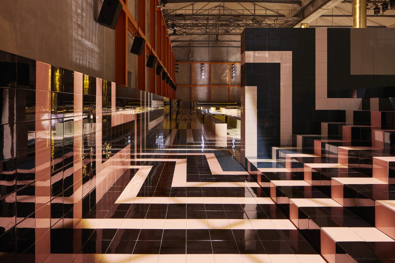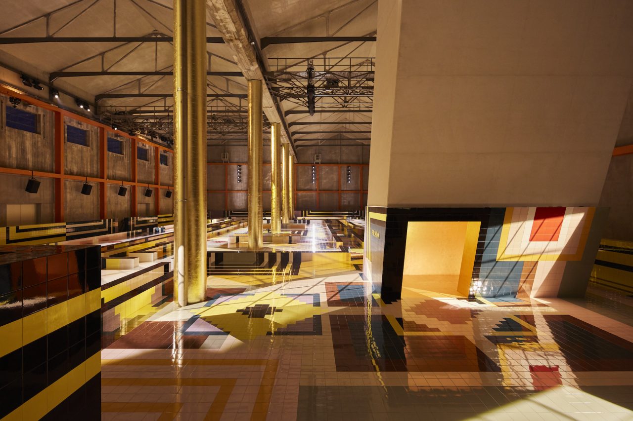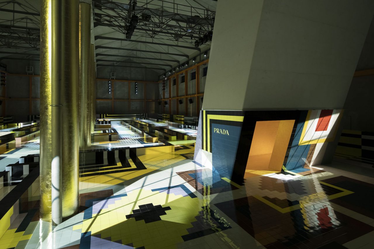 2020年春夏ミラノコレクションがスタート、初日は Prada (プラダ) が新作を発表した。例年のスケジュールでは18:00からだが、今回は夕日が射す16時からのスタートだ。会場の Fondazione Prada (プラダ財団) の壁や床にはカラーパレットのように色タイルが貼られ、中央には太いゴールドの柱がそびえ立つ。今回のインビテーションはゴールドのカートンがプラダブルーの封筒に入って届いた。