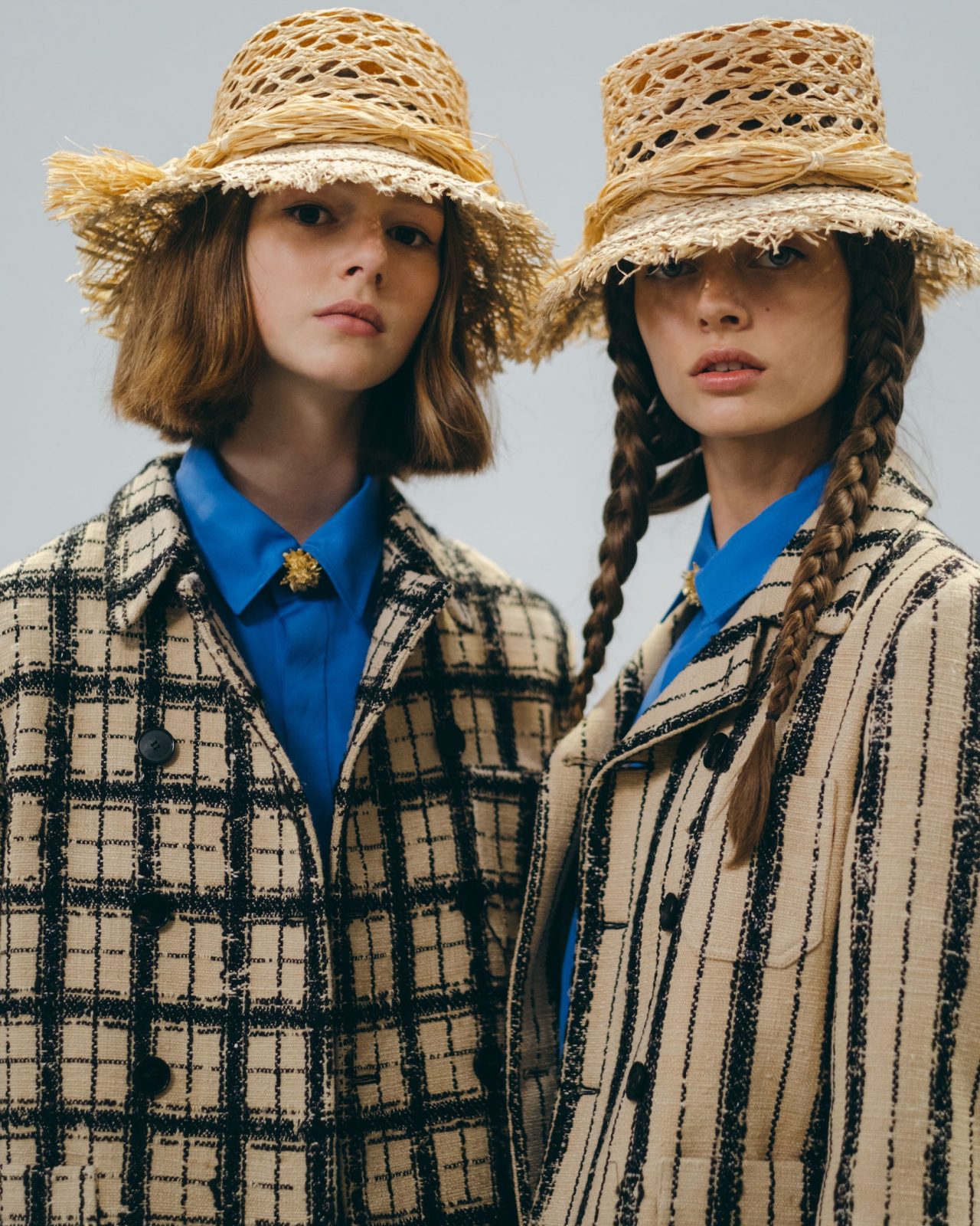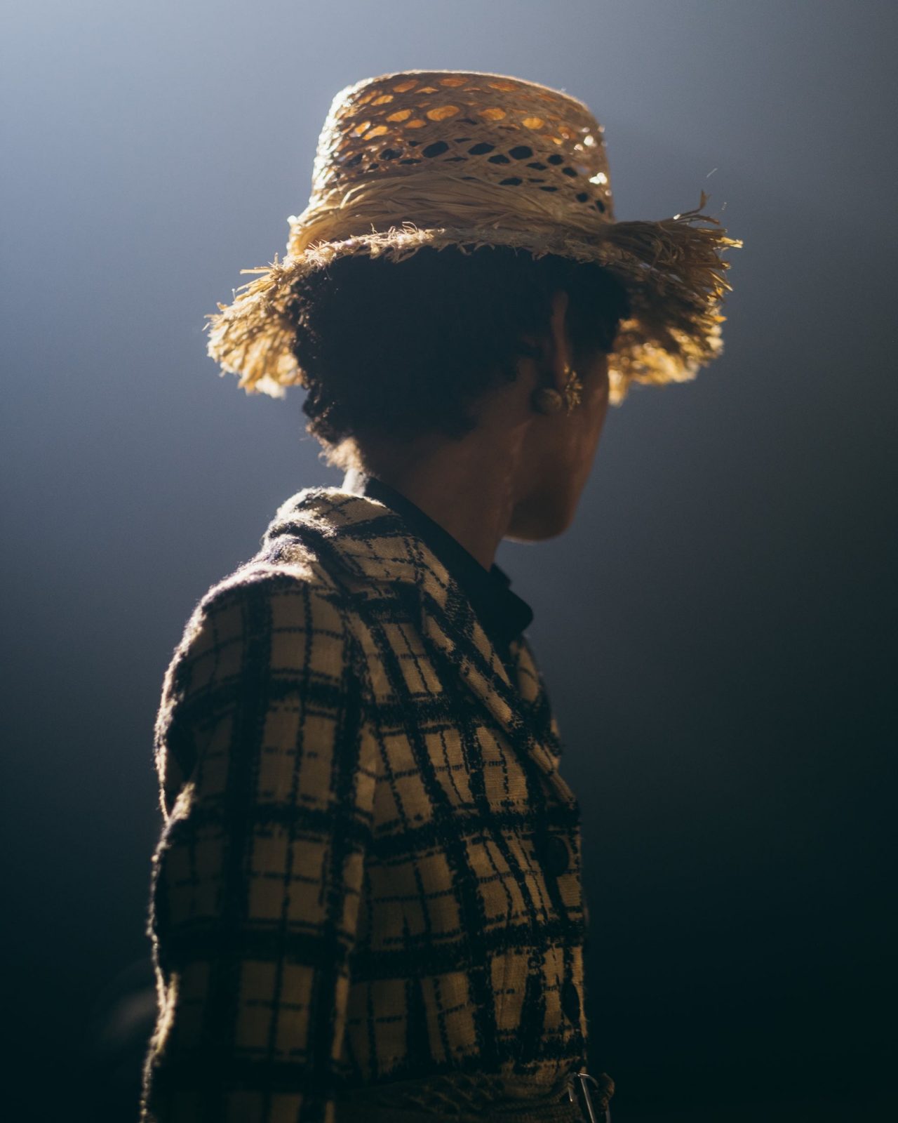コレクションは麻のショートパンツのコンビネゾンからスタートした。とてもフレッシュ!メッシュのアンクルブーツとラフィアの帽子が軽快さを添える。