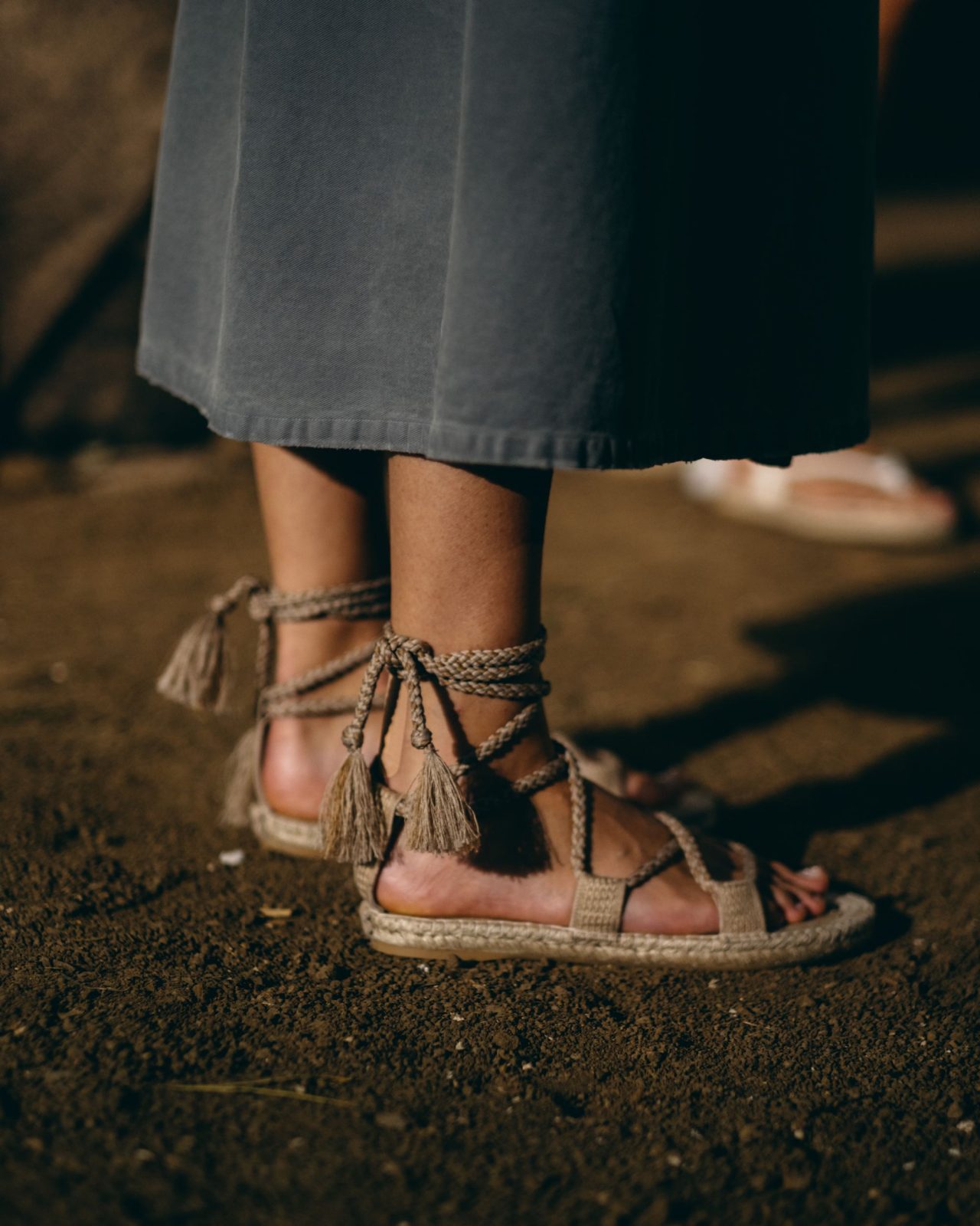 コットンや麻に墨色で描かれた花々は、繊細でエレガントに仕上がっている。ブルーシャツやボーダーニットと合わせてリアルなコーディネイトだ。くるぶしを見せるスカートの裾からエスパドリューがのぞいている。