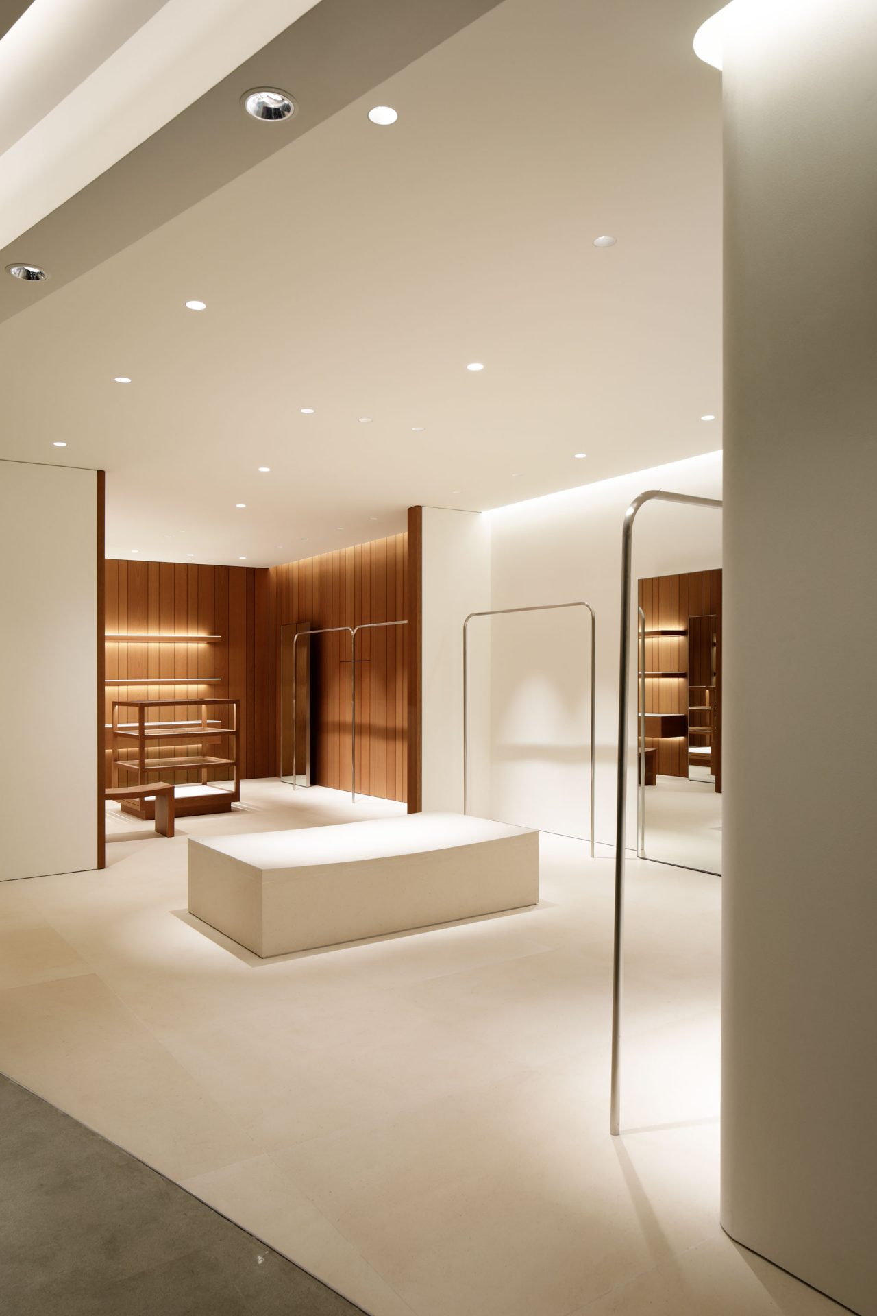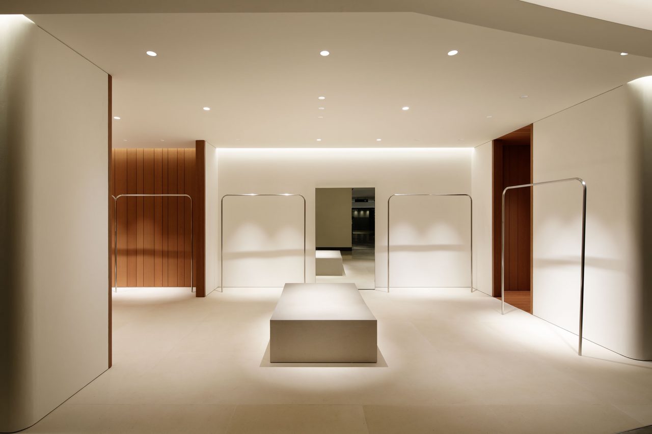 淡い色調のフロアと柱礎に、漆喰の壁とアメリカンチェリーを用いた木の壁がコントラストを為す空間。店内の什器は、白の大理石のシェルフや艶消し加工が施されたステンレススチール製のハンガーラックと、ミニマリズムを感じるそぎ落とされたシンプルなものが揃えられている。それぞれの自然の模様や質感が作用しあい構成された、繊細かつ温かみのある印象に生まれ変わったショップで、ゆっくりとショッピングを楽しんでみてはいかがだろうか。