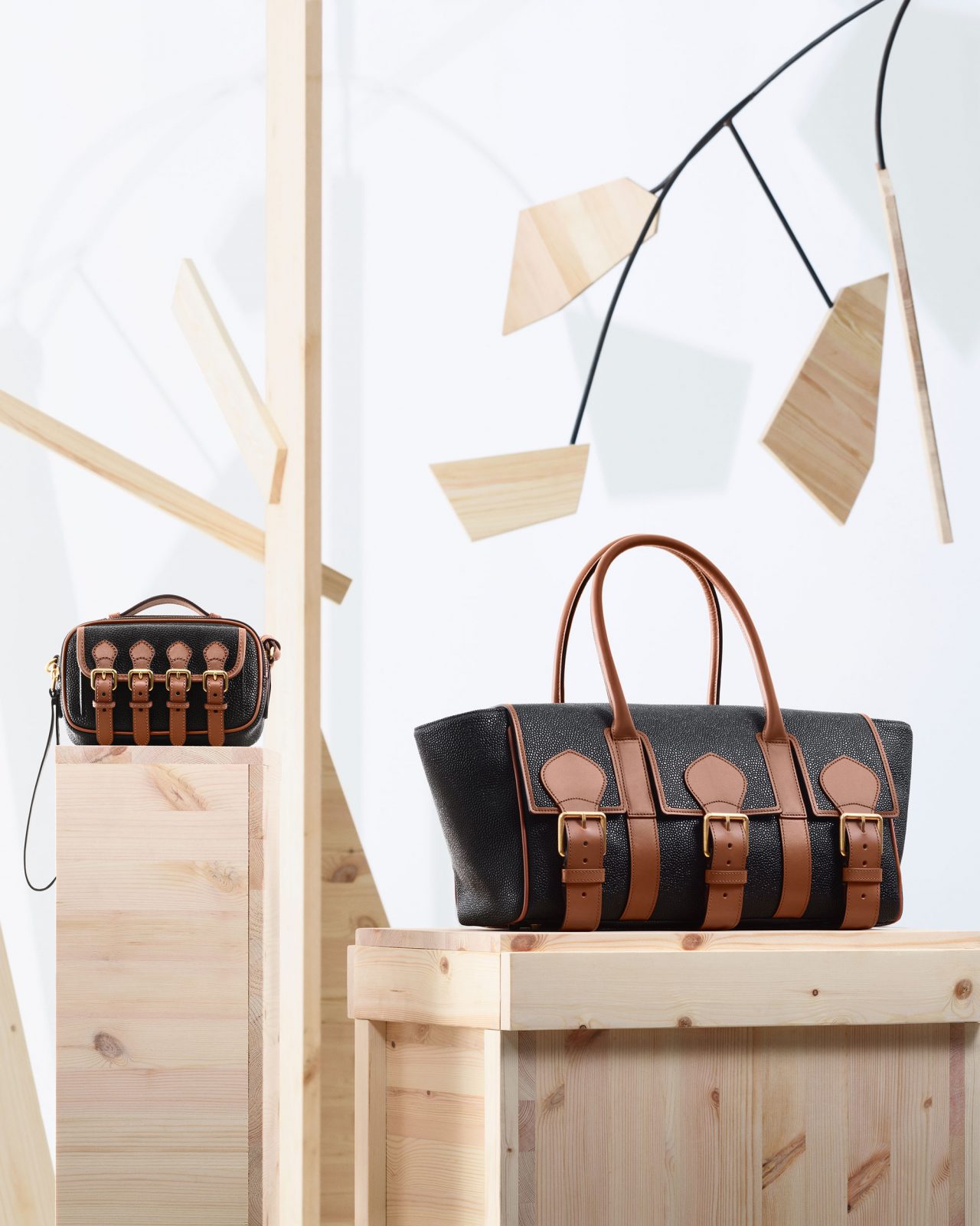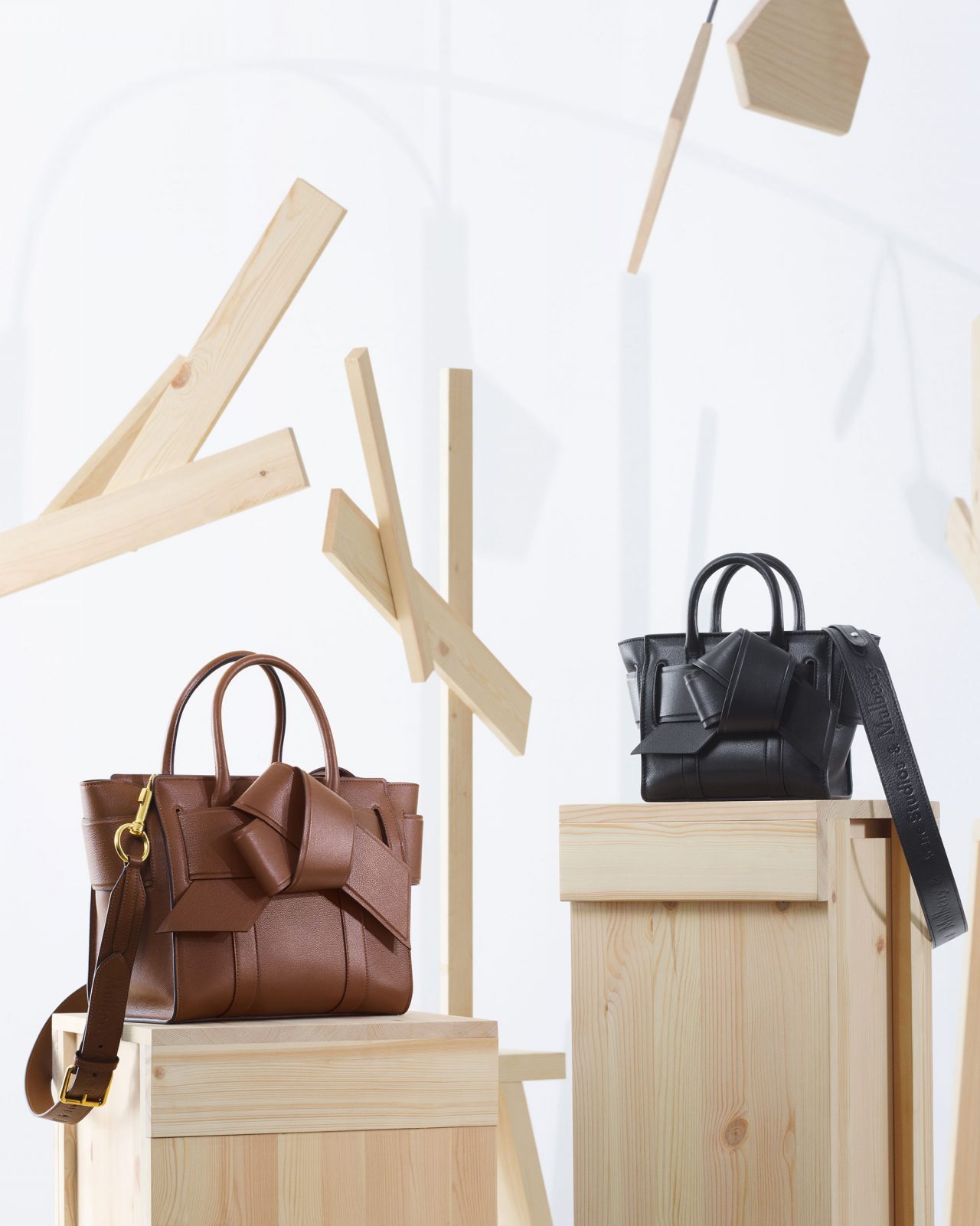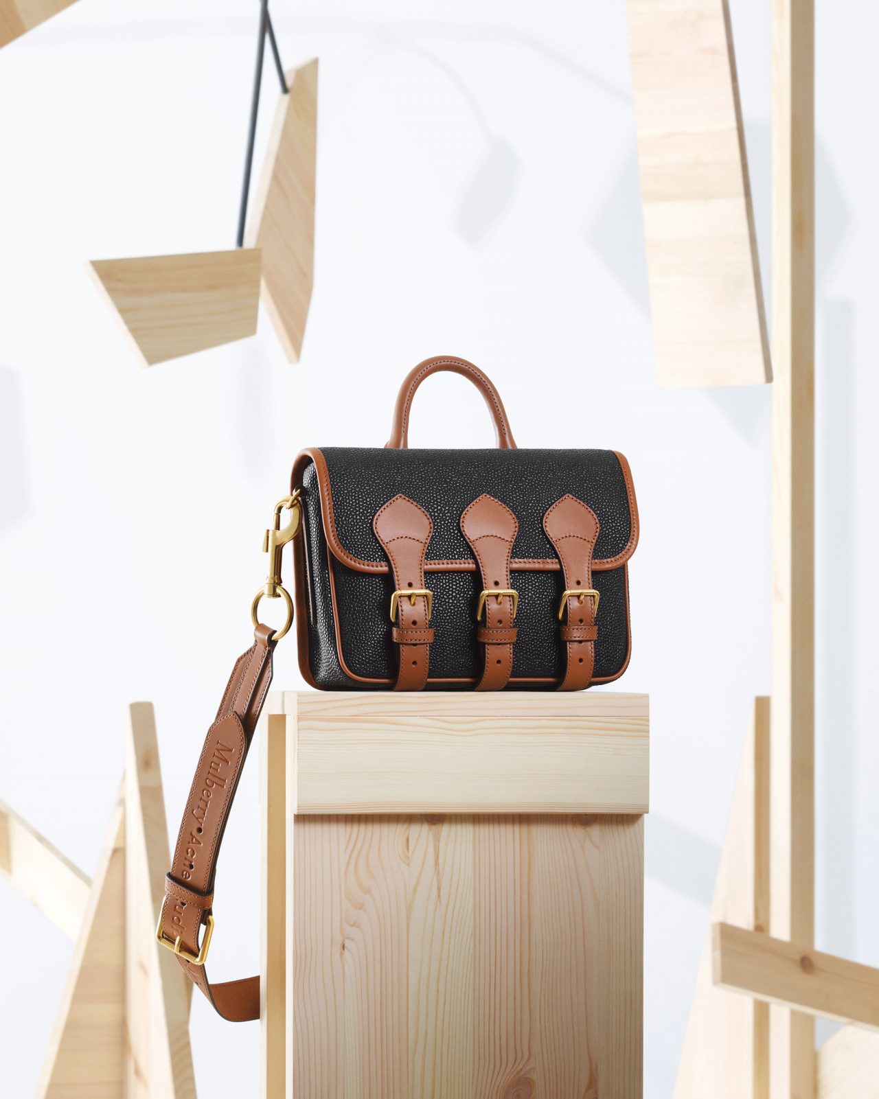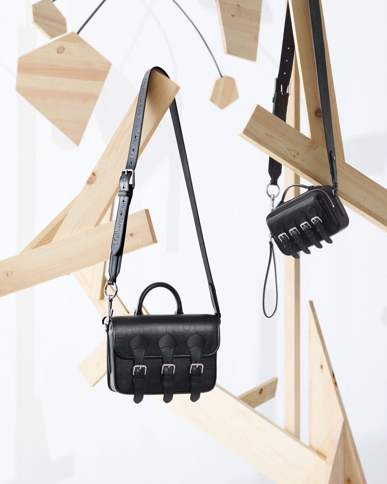 Acne Studios の「ムスビ」バッグの特徴であるひねり結びのモチーフは Mulberry の「ベイズウォーター」と掛け合わせ、大きなレザーの結び目を施したレギュラーとマイクロサイズのベイズウォーターに。Mulberry のスコッチグレインのバッグは Acne Studios のデザインチームによって一新され、レザーバックルストラップとオーバーサイズのメタルハードウェアを施したメッセンジャーとサッチェルバッグが誕生。