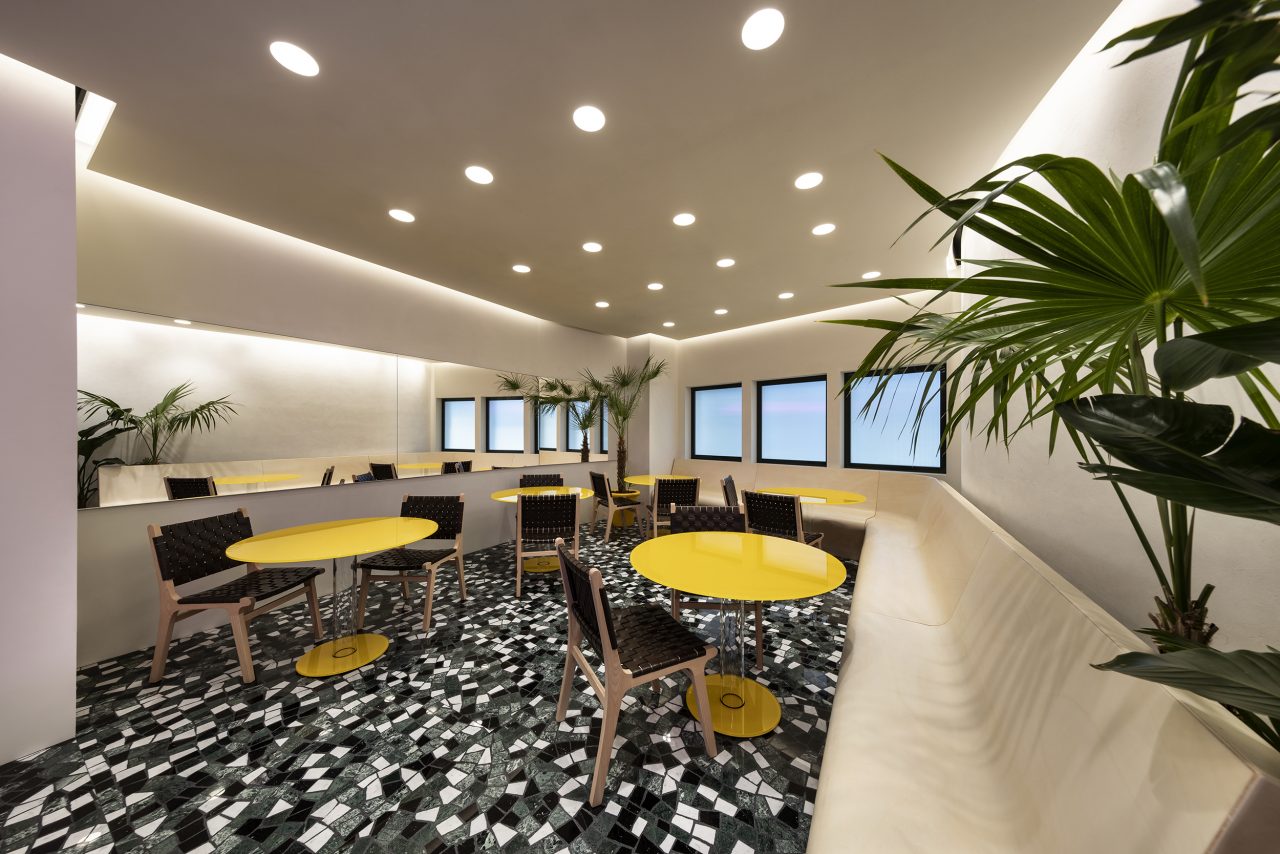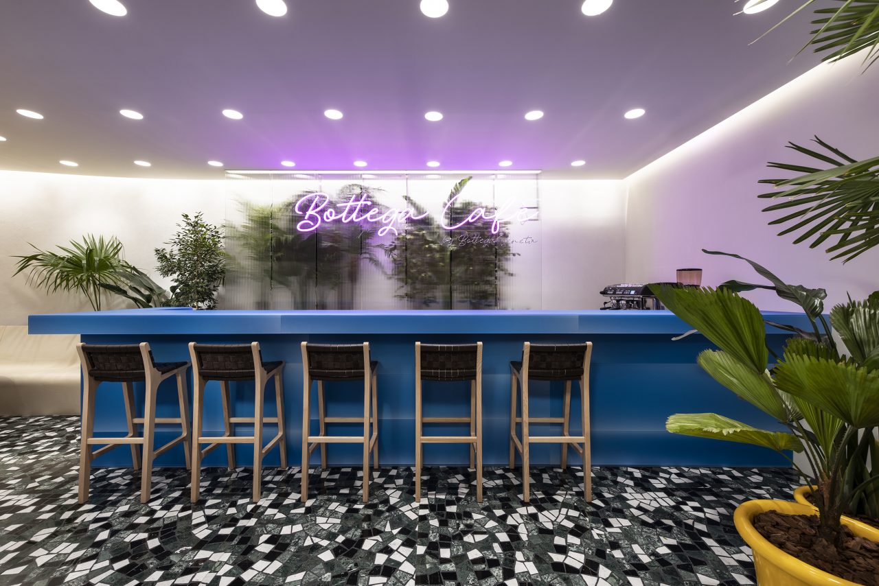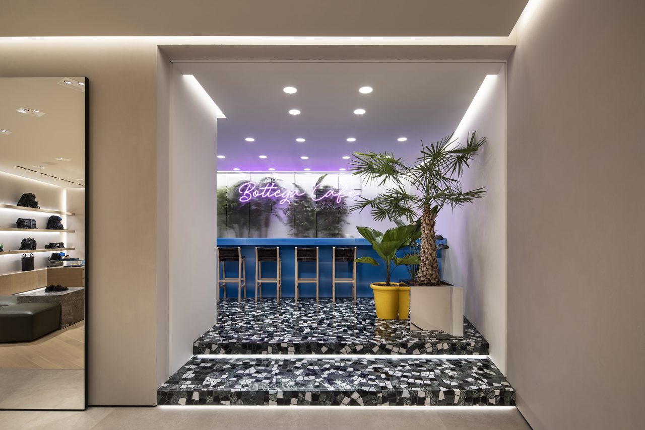 阪急メンズ大阪のブティック奥にオープンしたカフェは、ブランドのルーツであるイタリアを随所に感じるスペース。「明るさ」をコンセプトに、建材の大胆な色使いと植栽、そして効果的に光を取り入れたデザインが心地よい空間を生み出している。足元にはヴェネチアのさまざまな大理石を使った深みのあるグリーンやブラックで構成されたテラッツォ・パッラーディアーノのモザイクを配し、 “ボッテガブルー” のカウンターやシチリアレモンのように燦々としたイエローのカフェテーブルが際立っている。カウンターの上には、アイキャッチーなピンクのネオンサインが掲げられ、さながらベネツィア市街のバルコニーのよう。さらに注目したいのは、各テーブルにセットされたチェア。優しい色合いの木材をベースに、エスプレッソカラーのレザーを合わせ編み込み、ブランドを代表するアイコニックなイントレチャートをイメージさせるデザインに仕上がっている。