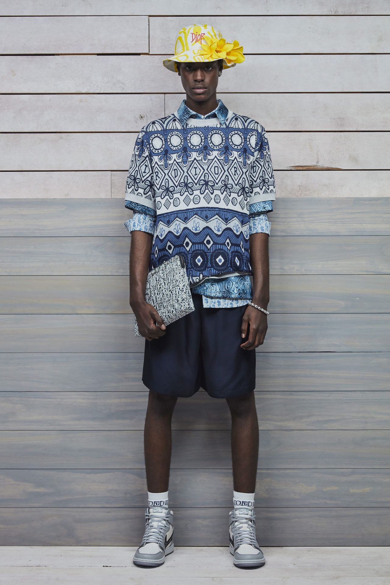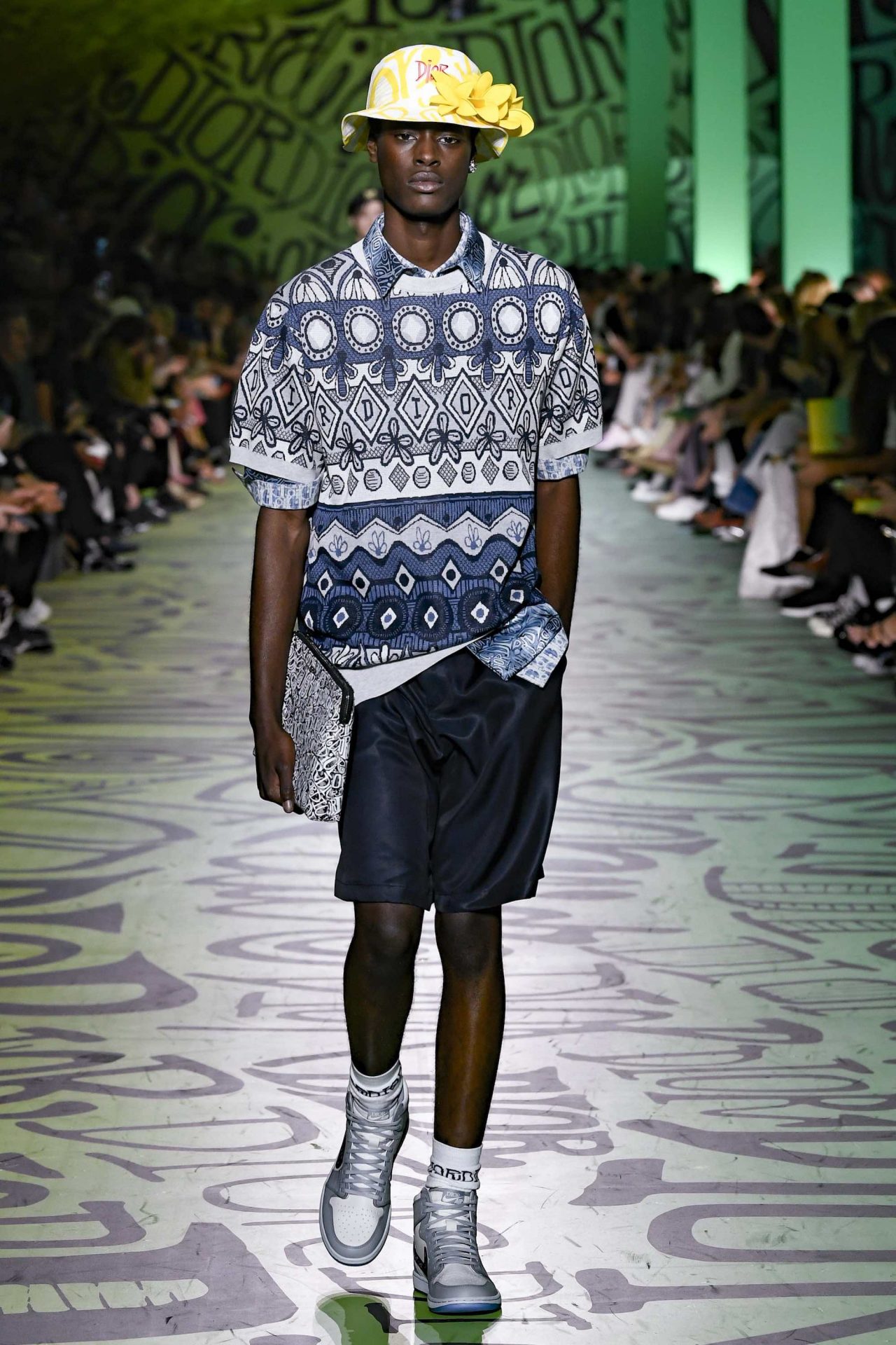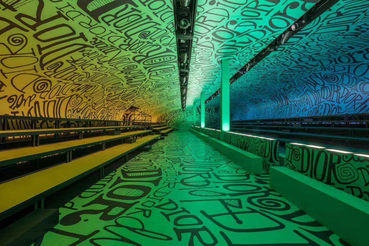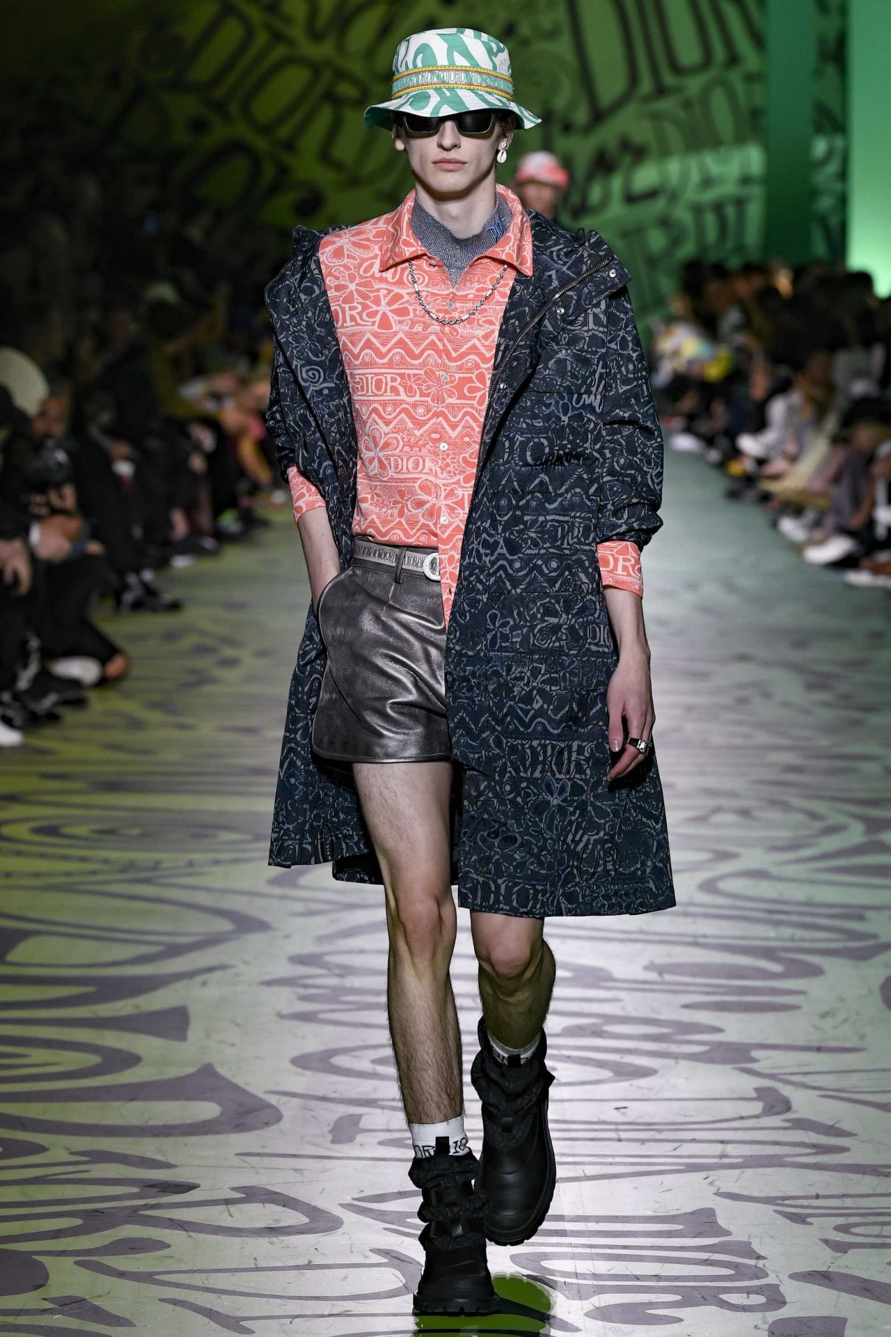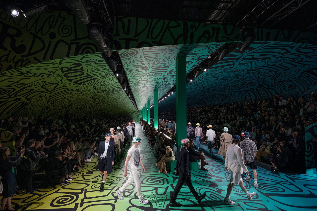 「アート・バーゼル マイアミビーチ」の開幕前夜に開催されたショーはルベルミュージアムを舞台に、没入型のインスタレーションとして考案されたという無数に繰り返される DIOR の文字に包まれた会場で開催。このグラフィティタグのようなプリントは、Stüssy (ステューシー) の創設者でありカウンターカルチャーとサーフィン界を牽引するトップアーティストの Sean Stüssy (ショーン・ステューシー) がデザイン。コレクションにもこのサイケデリックなプリントが様々なアイテムで登場した。