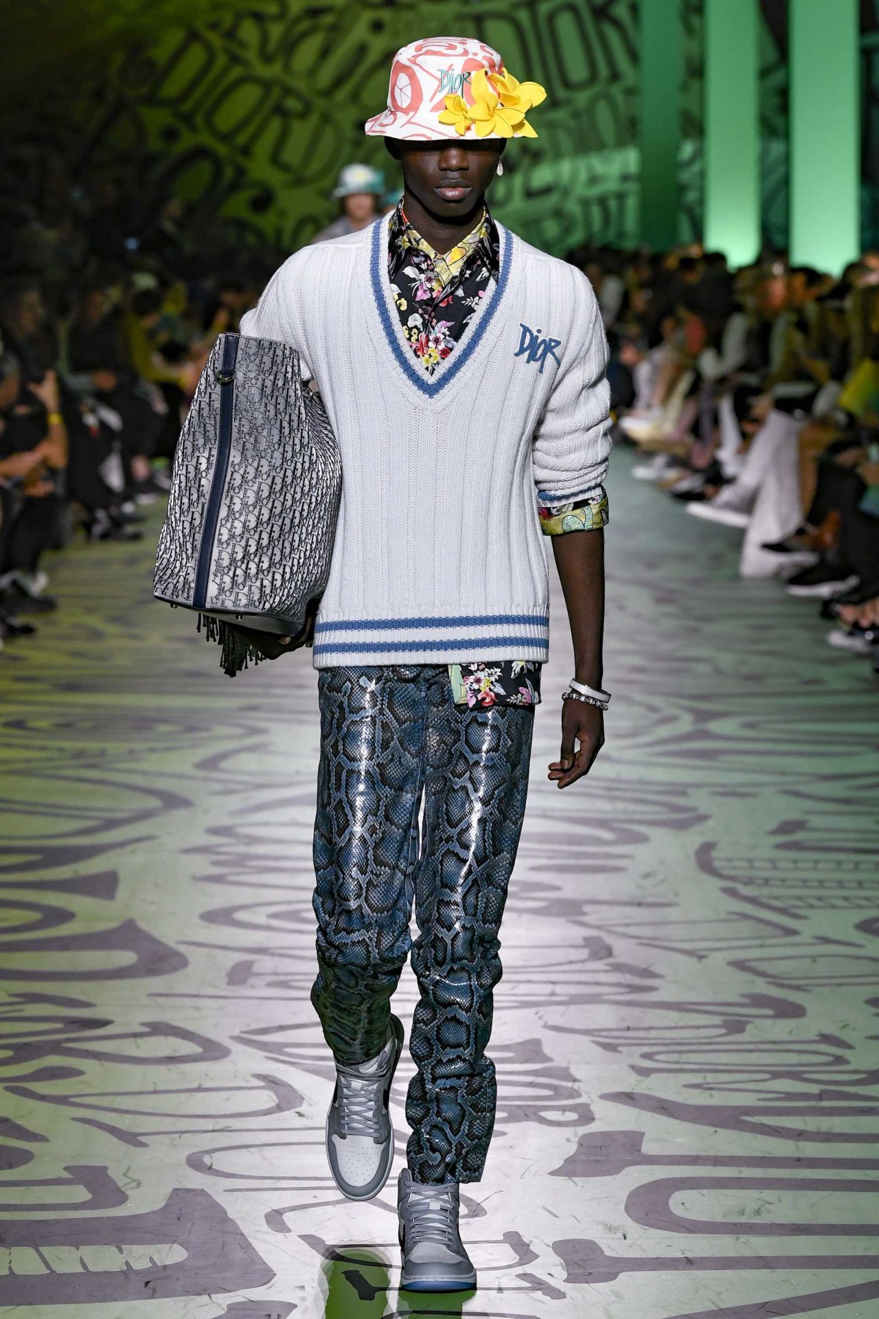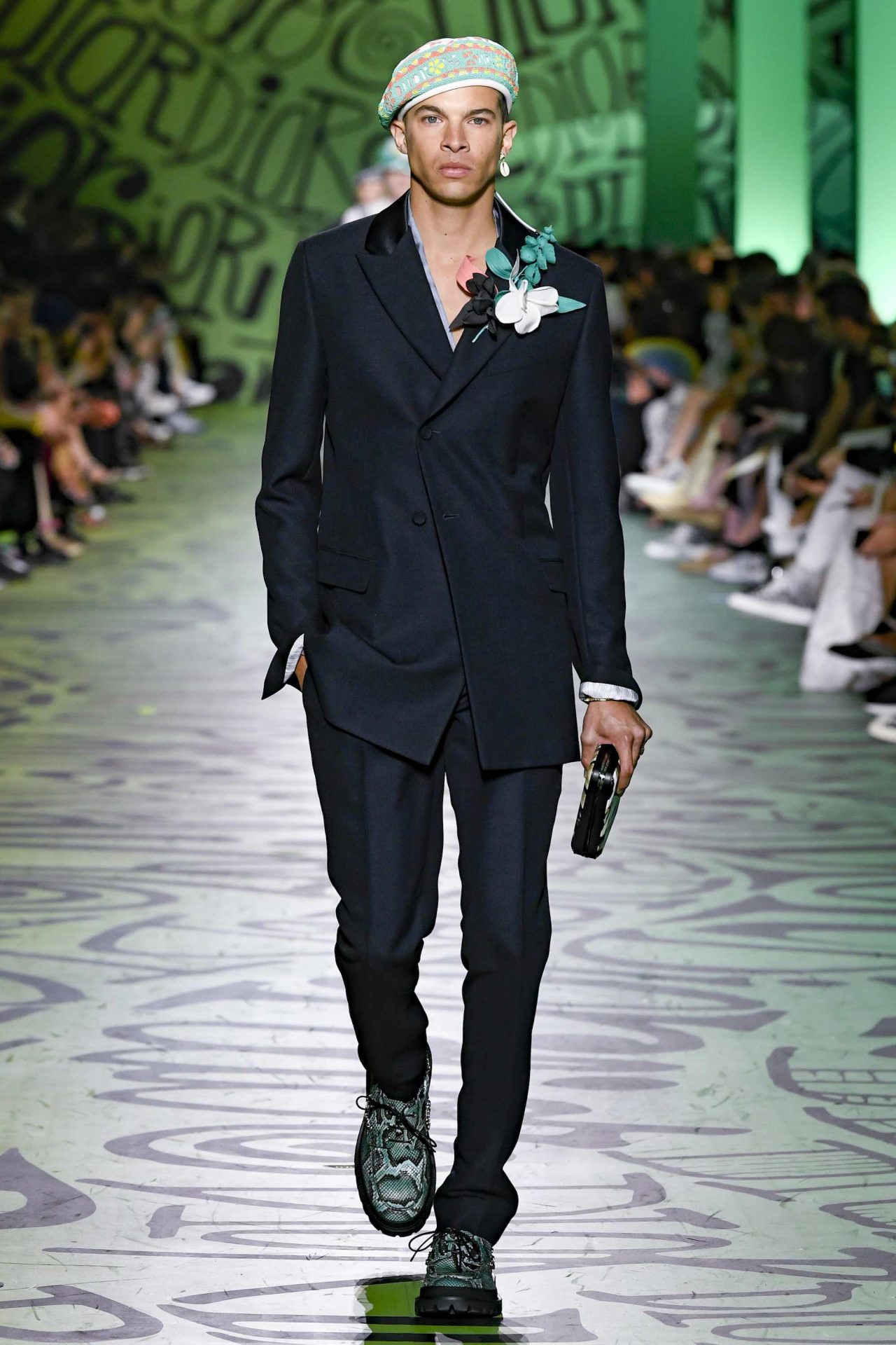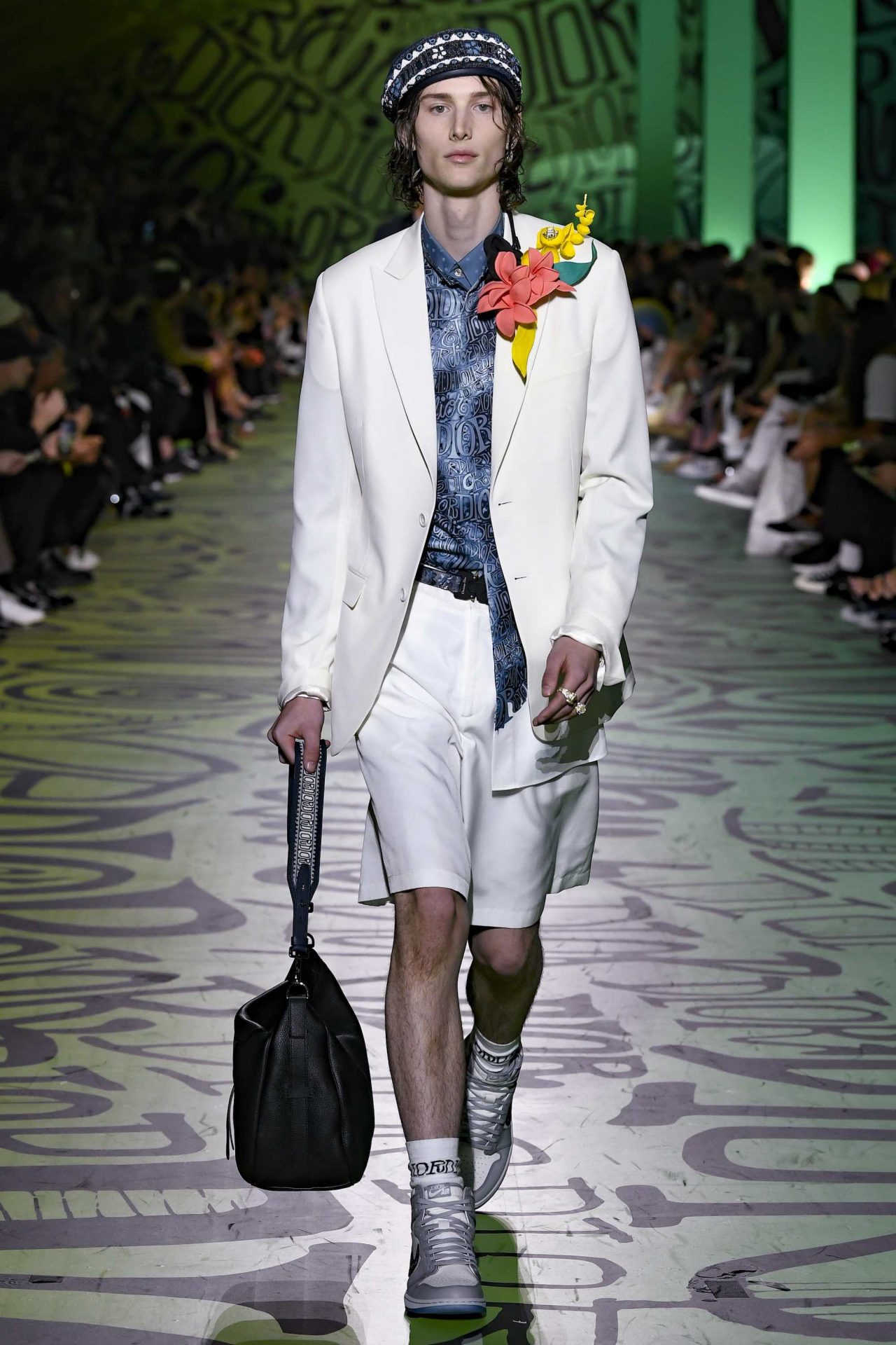 マイアミビーチのアールデコ建築を反映したというハイビスカスレッドやパシフィックブルー、サフランといった鮮やかなカラーパレットで彩られたコレクションは、ポジティブなムード全開。フローラルモチーフやパイソンプリント、チェック&ストライプがアクセントを加えている。エンブロイダリーやビーズ刺繍、そしてテーラリングのサヴォワールフェールといったオートクチュールとメゾンのヘリテージに捧げるオマージュが随所に散りばめられ、今回もまた Kim Jones のコンテンポラリーな感性と見事な融合を果たした。