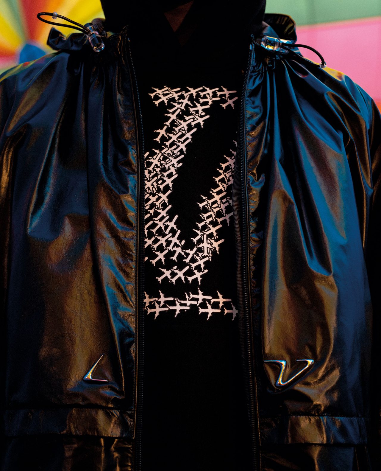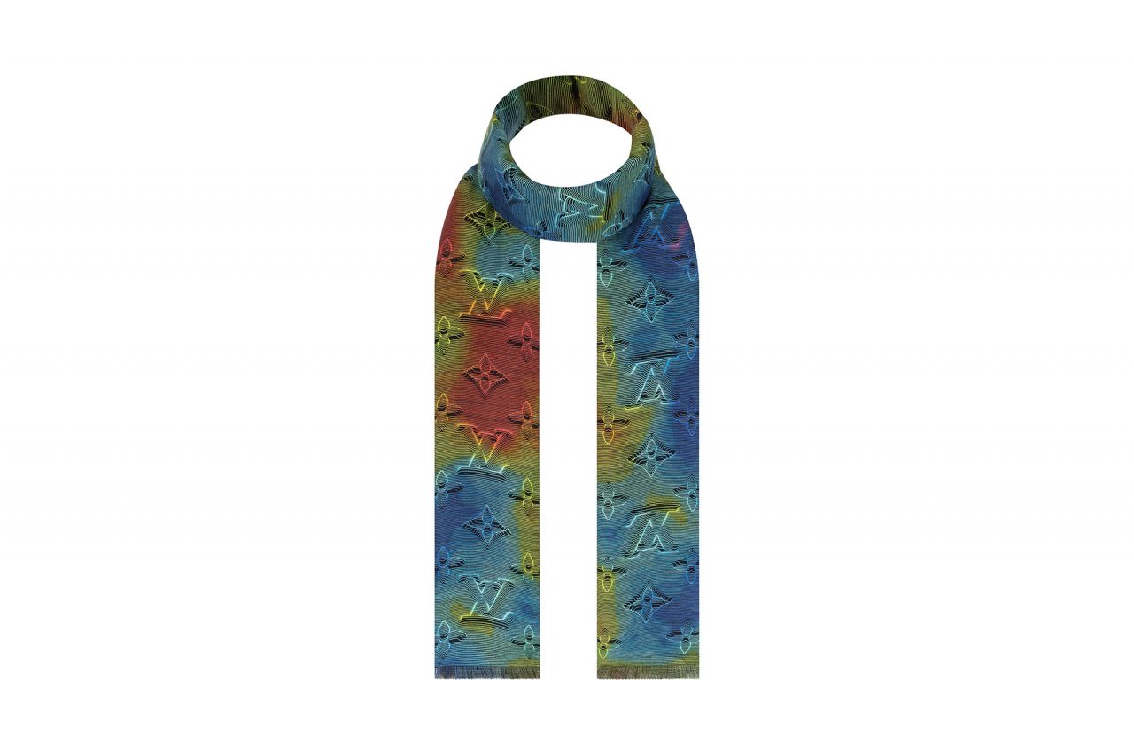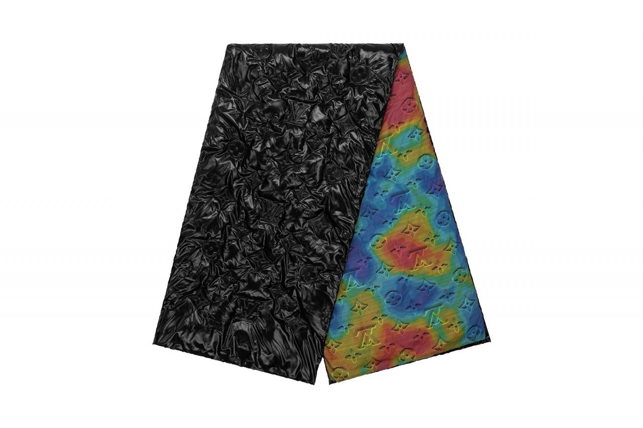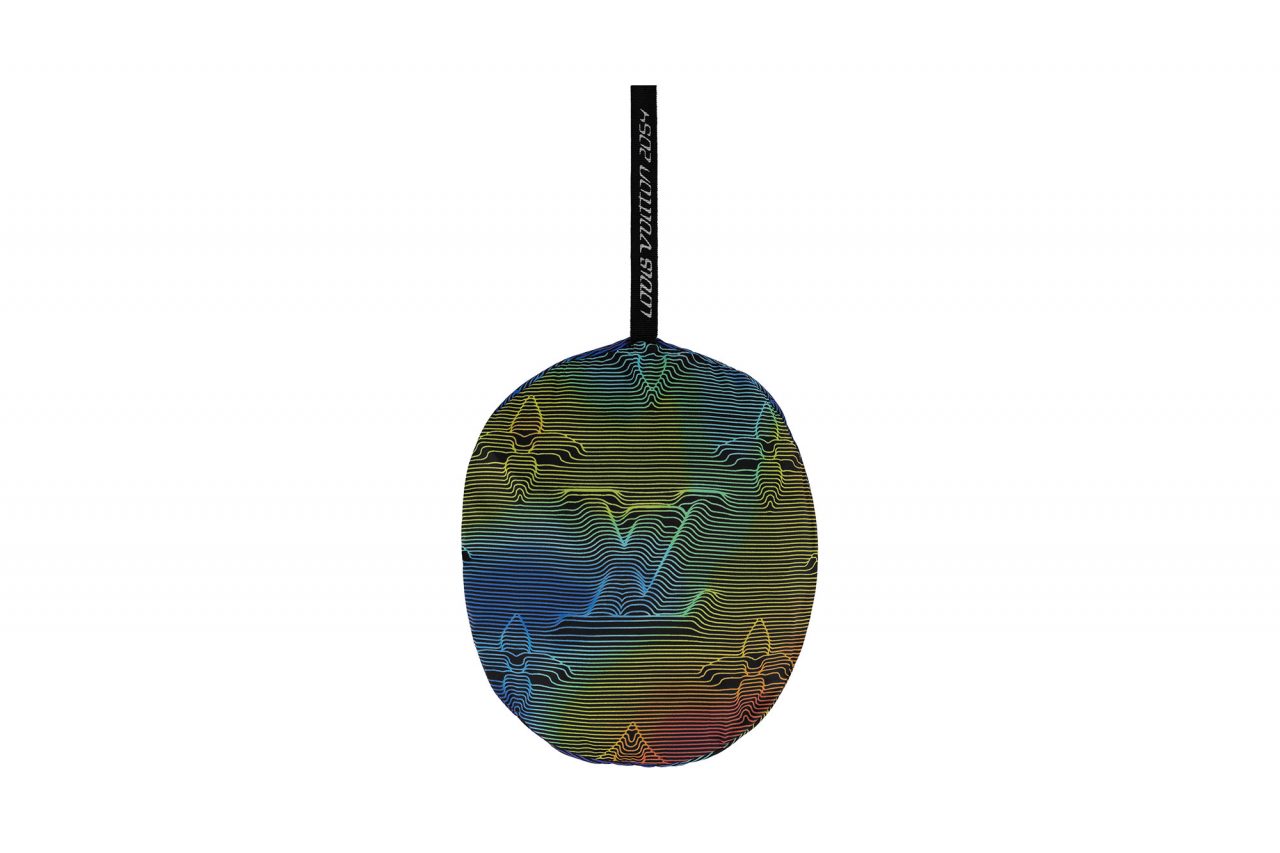 また、本ラインではいくつかのアイコニックな新たなコードが誕生。伝統的な「モノグラム」は再解釈され、エンボスを模したトロンプ・ルイユのモチーフとしてタイダイ風カモフラージュレインボーにあしらわれている。このパターンはモノトーンでも登場し、ほとんどのウェアのライニングに用いられ、本ラインの象徴となっている。他にも、胸元のポケットやパンツのポケットフラップに施されている3Dのイニシャル・モチーフや、シンクロした飛行機で形作ったイニシャルモチーフなど、多彩なグラフィックが「ルイ・ヴィトン 2054」のトレードマークとして随所にあしらわれている。